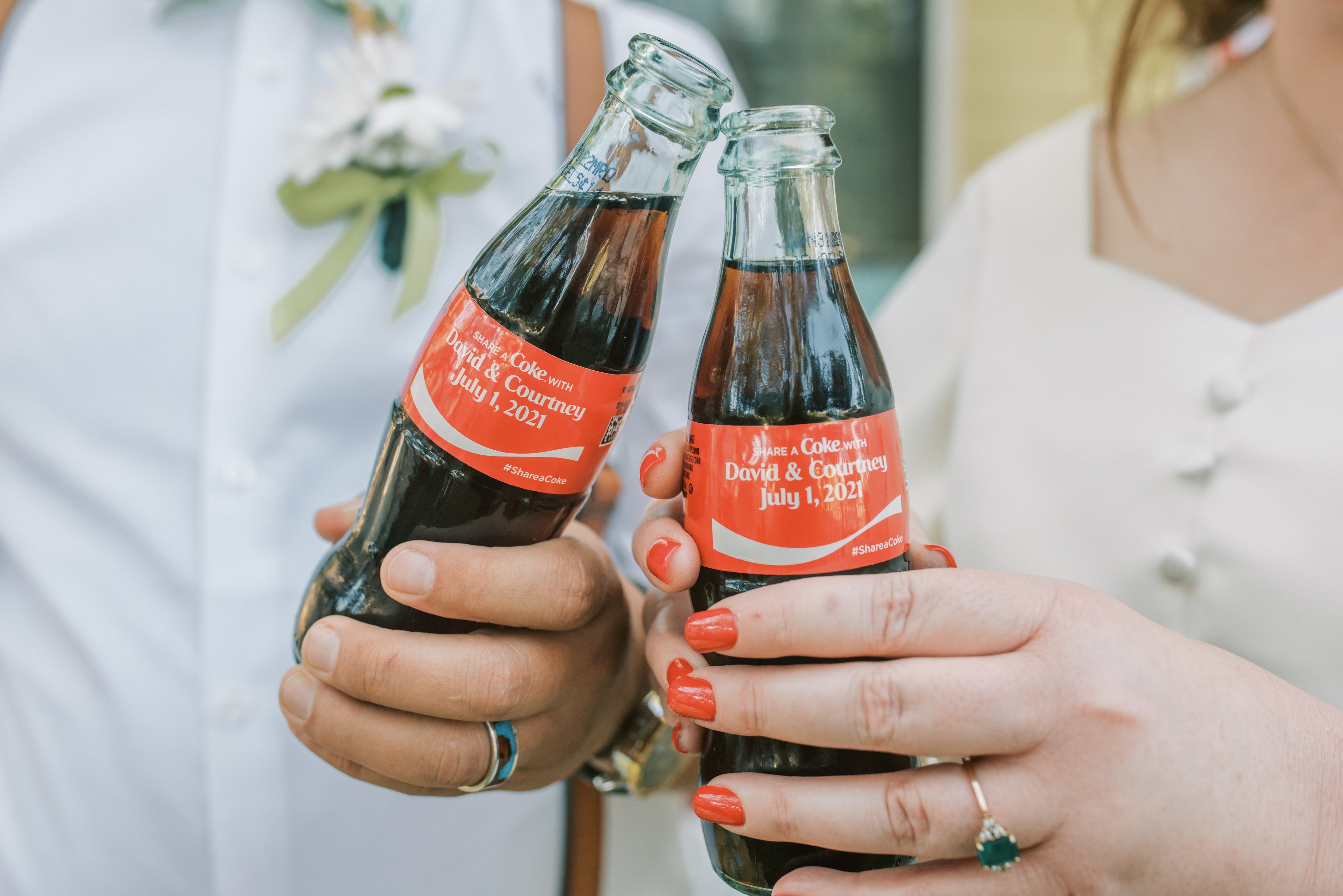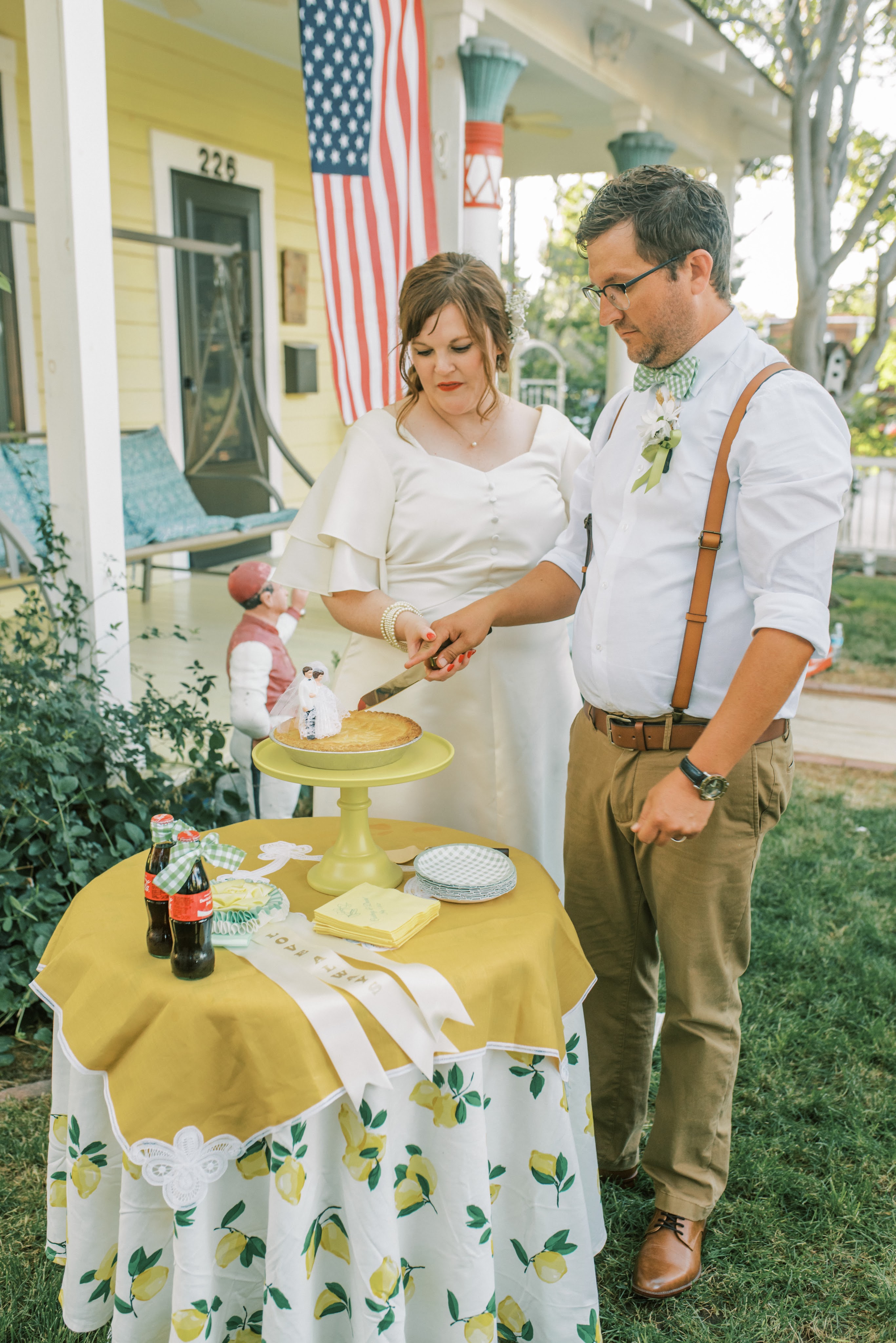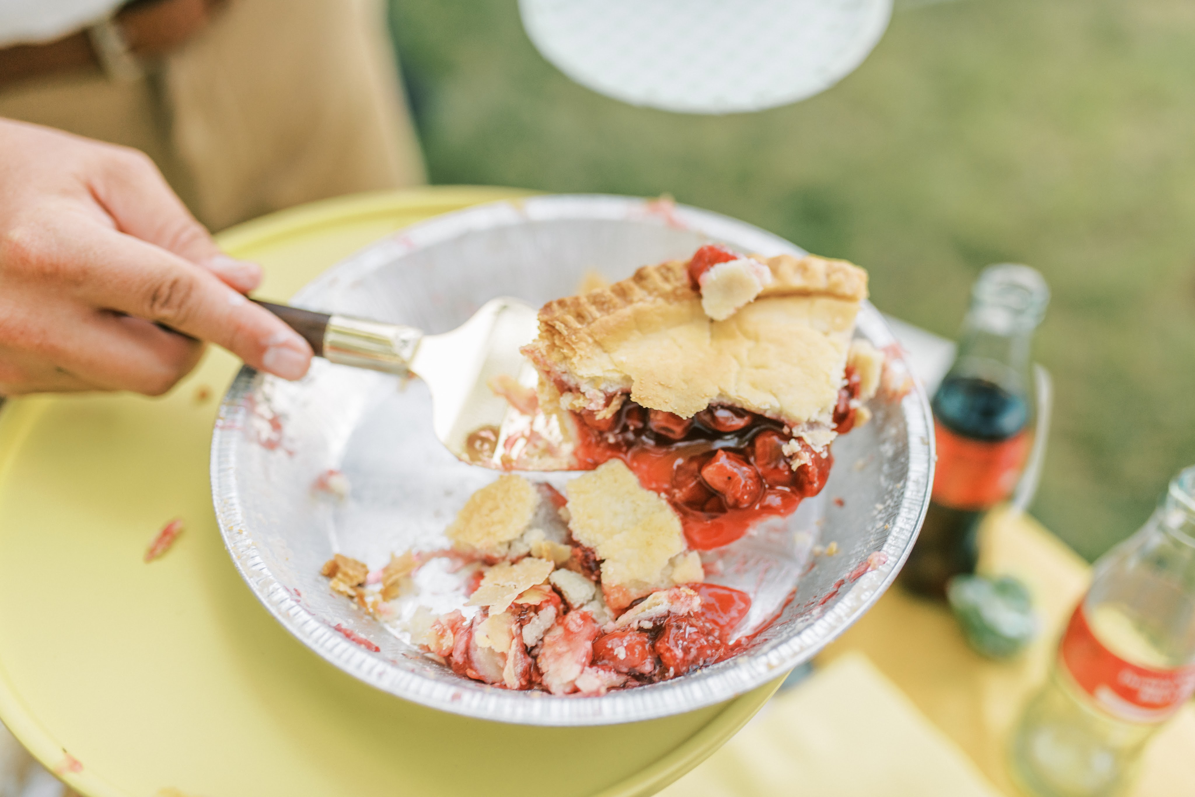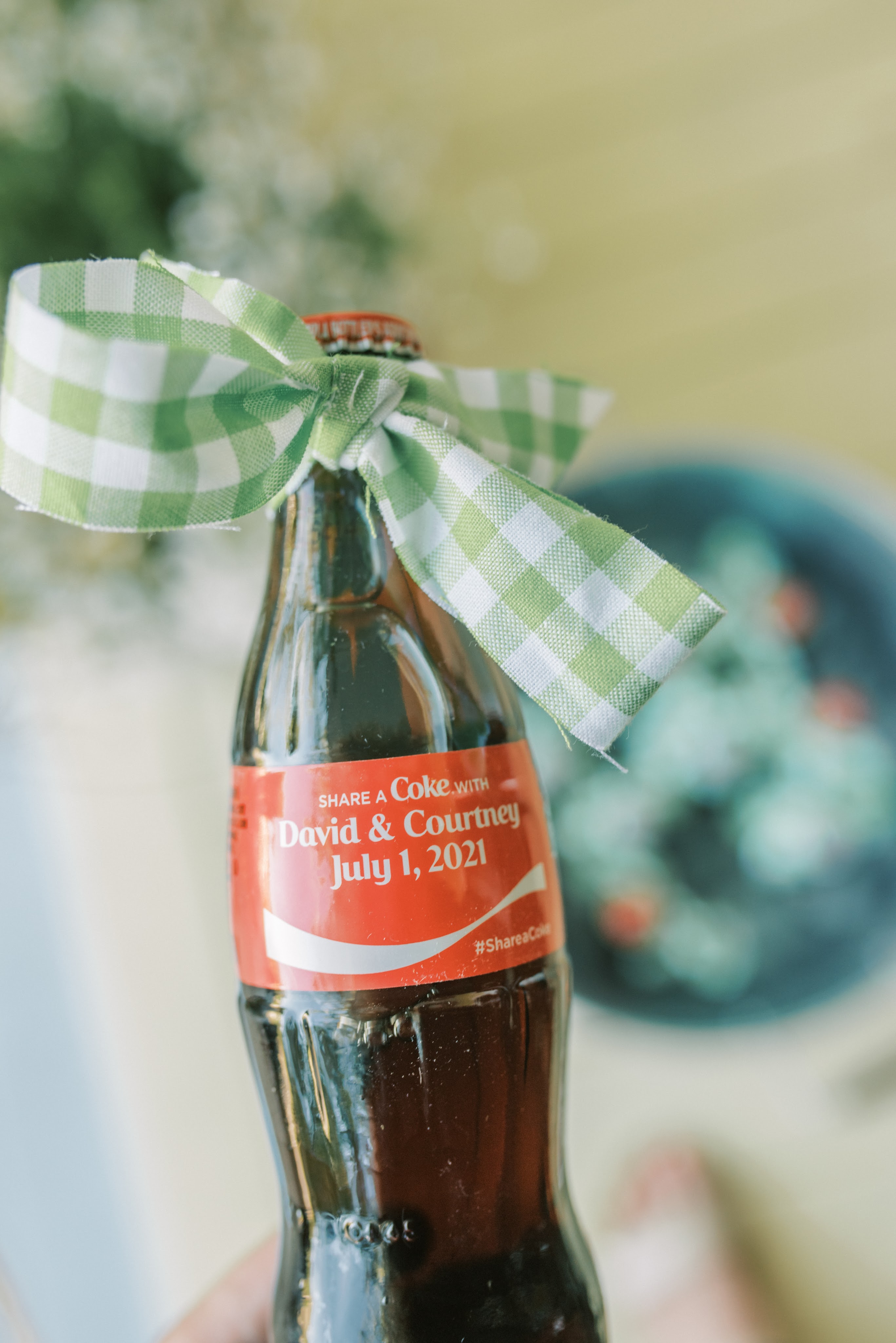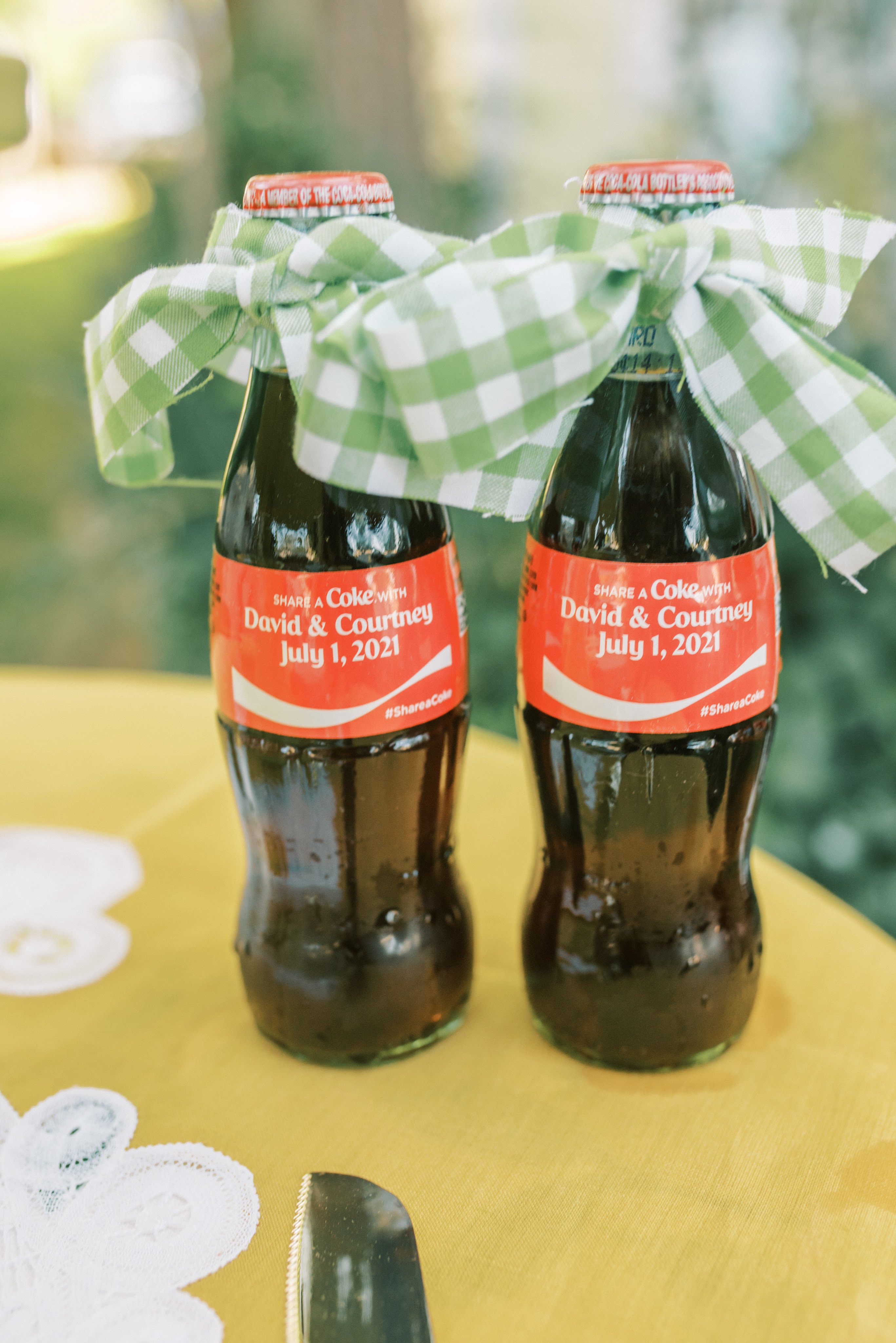 Our colors were yellow and green with splashes of red, and being utterly gingham obsessed, I incoporated gingham from David’s bow-tie, to my bouquet and shoes. We decorated with lots of lemons and limes and daisies, and had personalized Coca Cola along with Five Guys delivered for our wedding dinner and then had a cherry pie cutting!