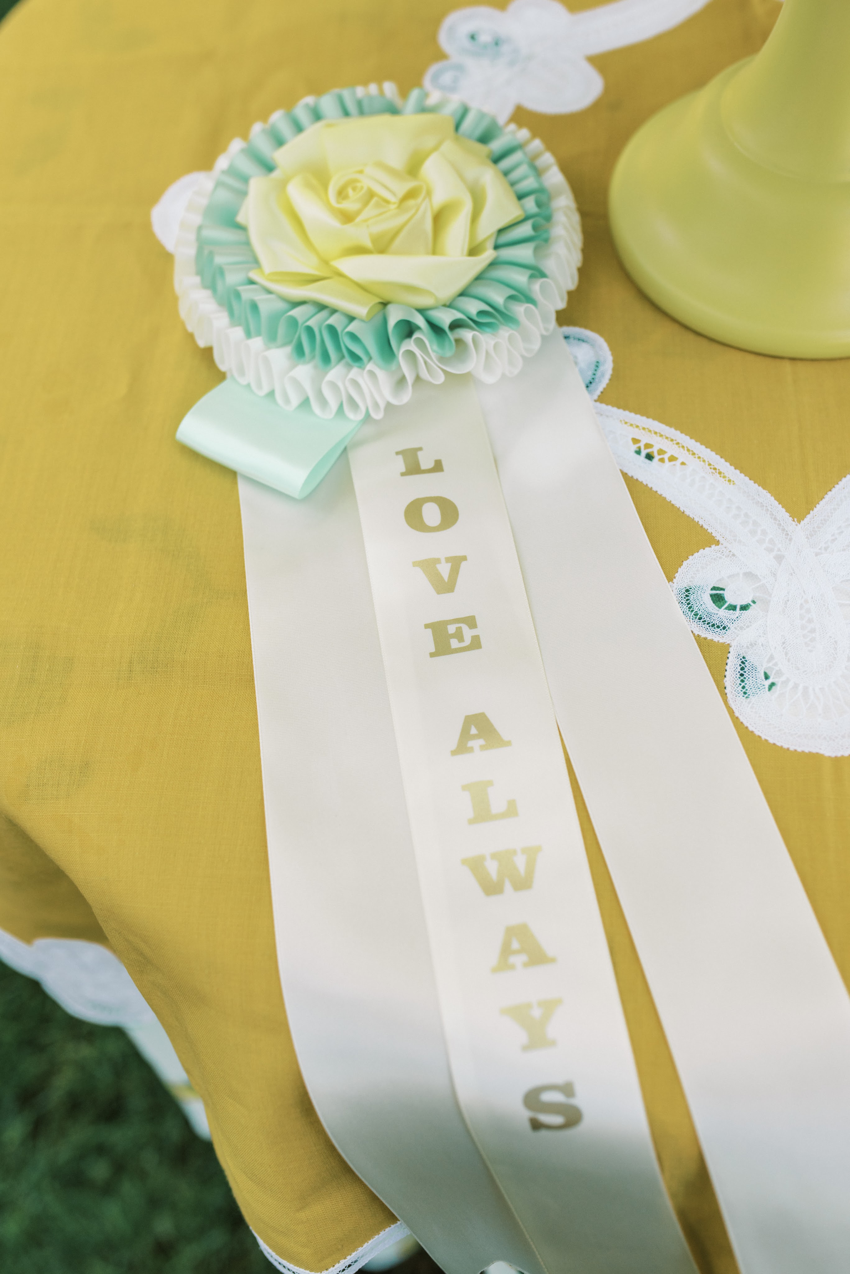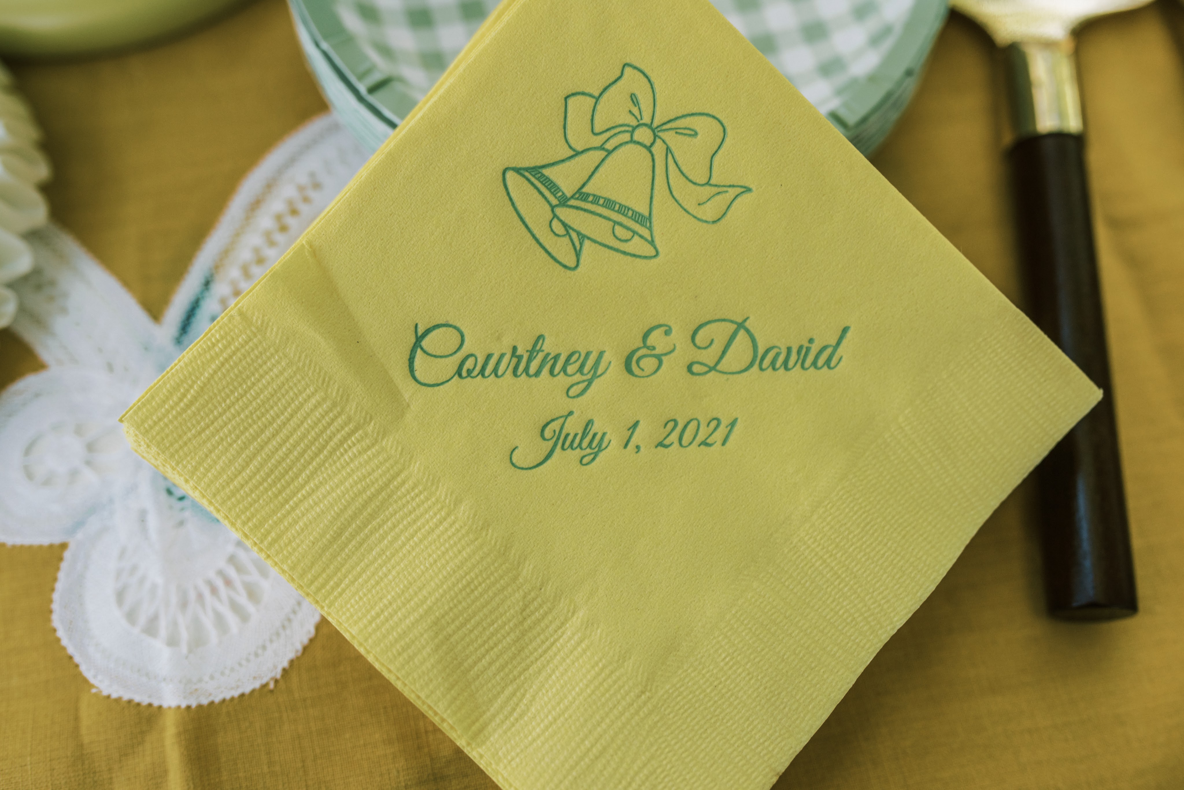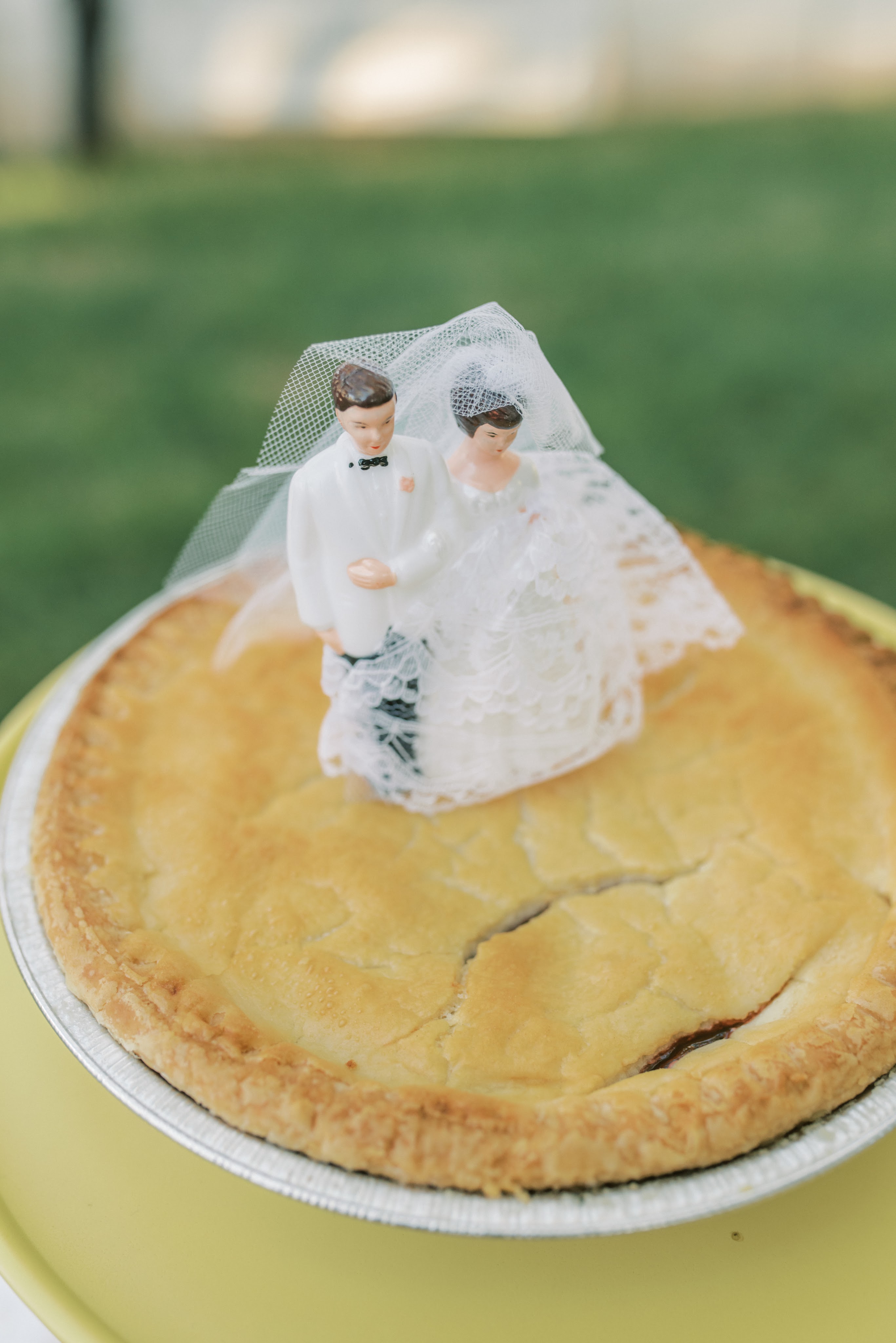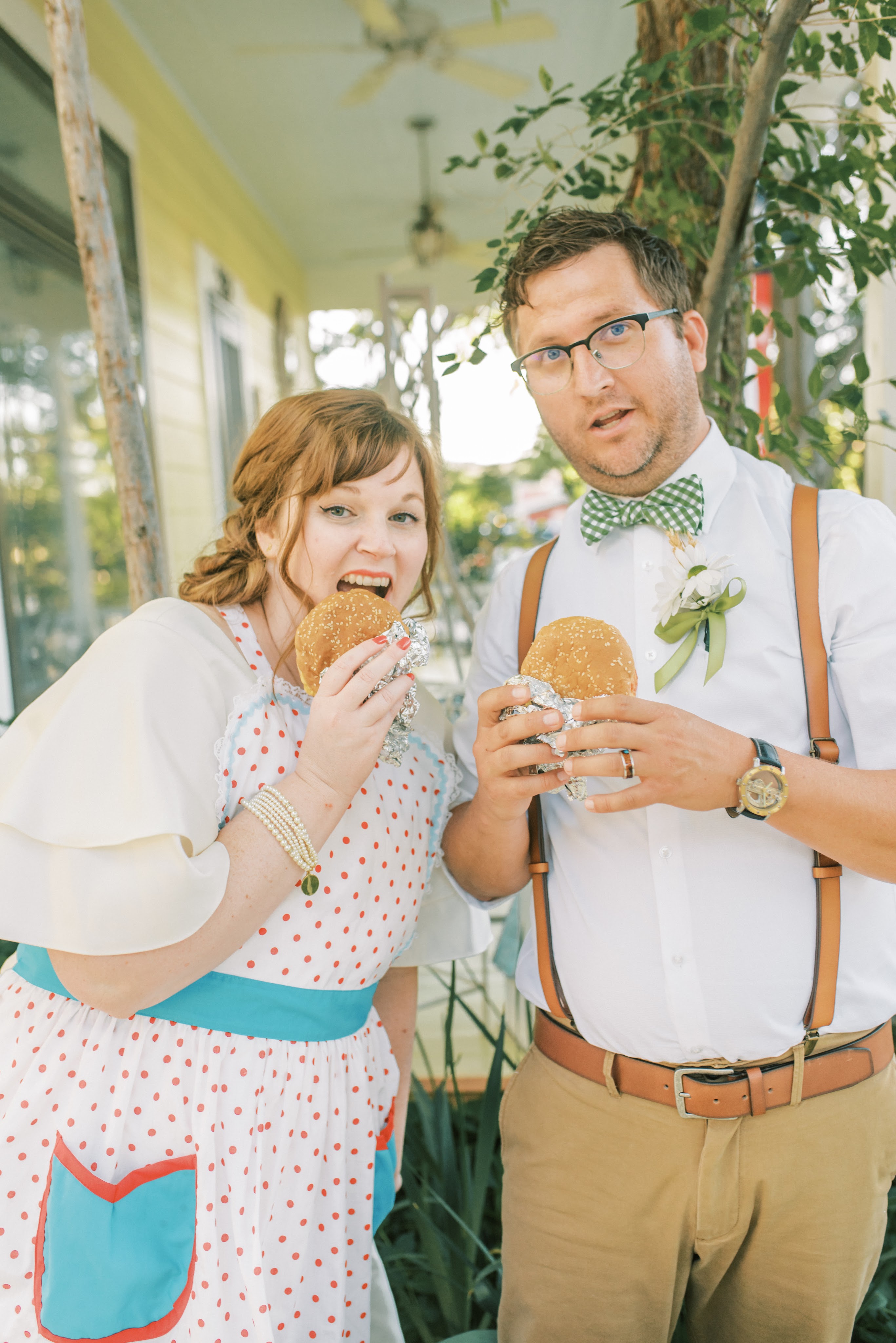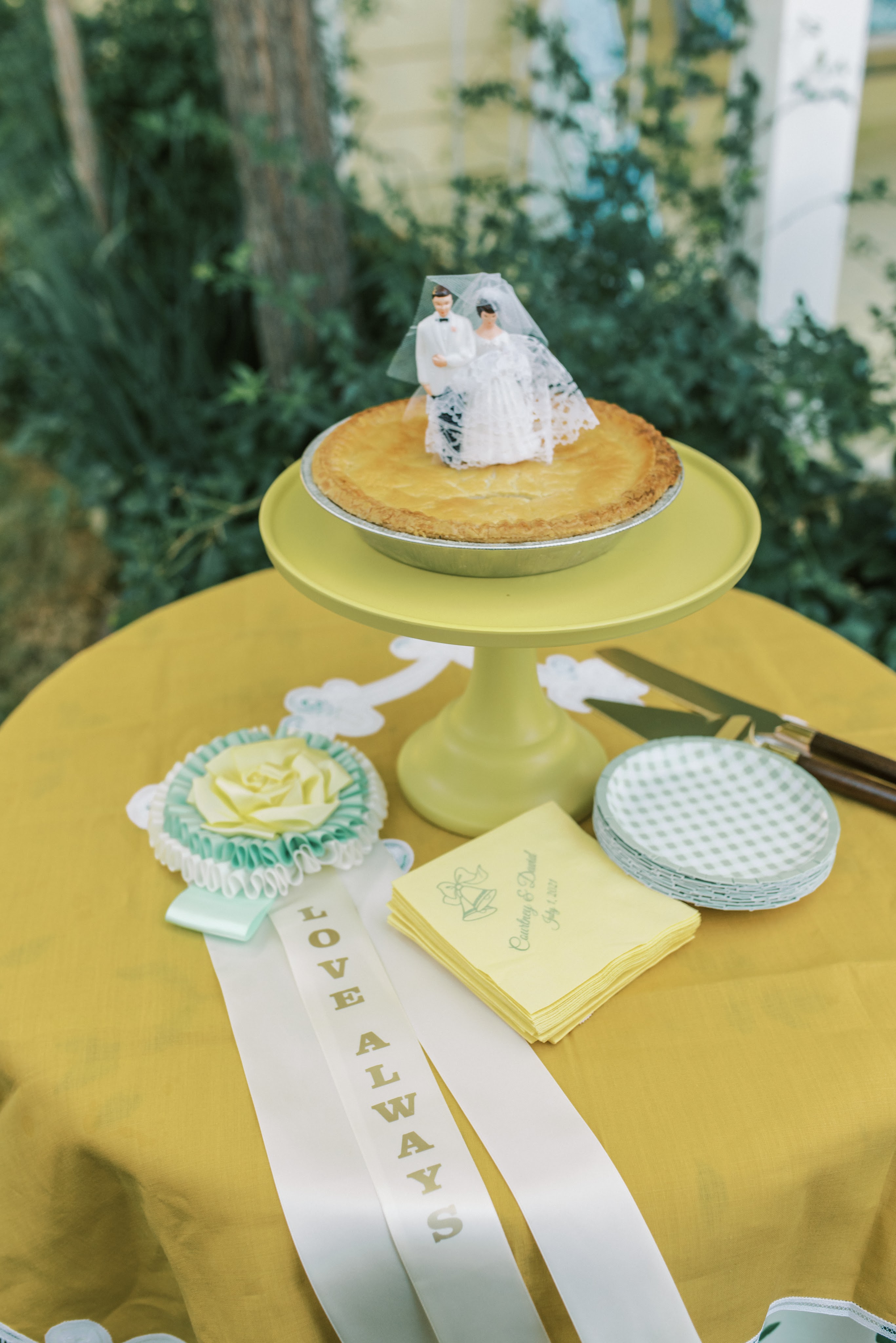 Our colors were yellow and green with splashes of red, and being utterly gingham obsessed, I incoporated gingham from David’s bow-tie, to my bouquet and shoes. We decorated with lots of lemons and limes and daisies, and had personalized Coca Cola along with Five Guys delivered for our wedding dinner and then had a cherry pie cutting!