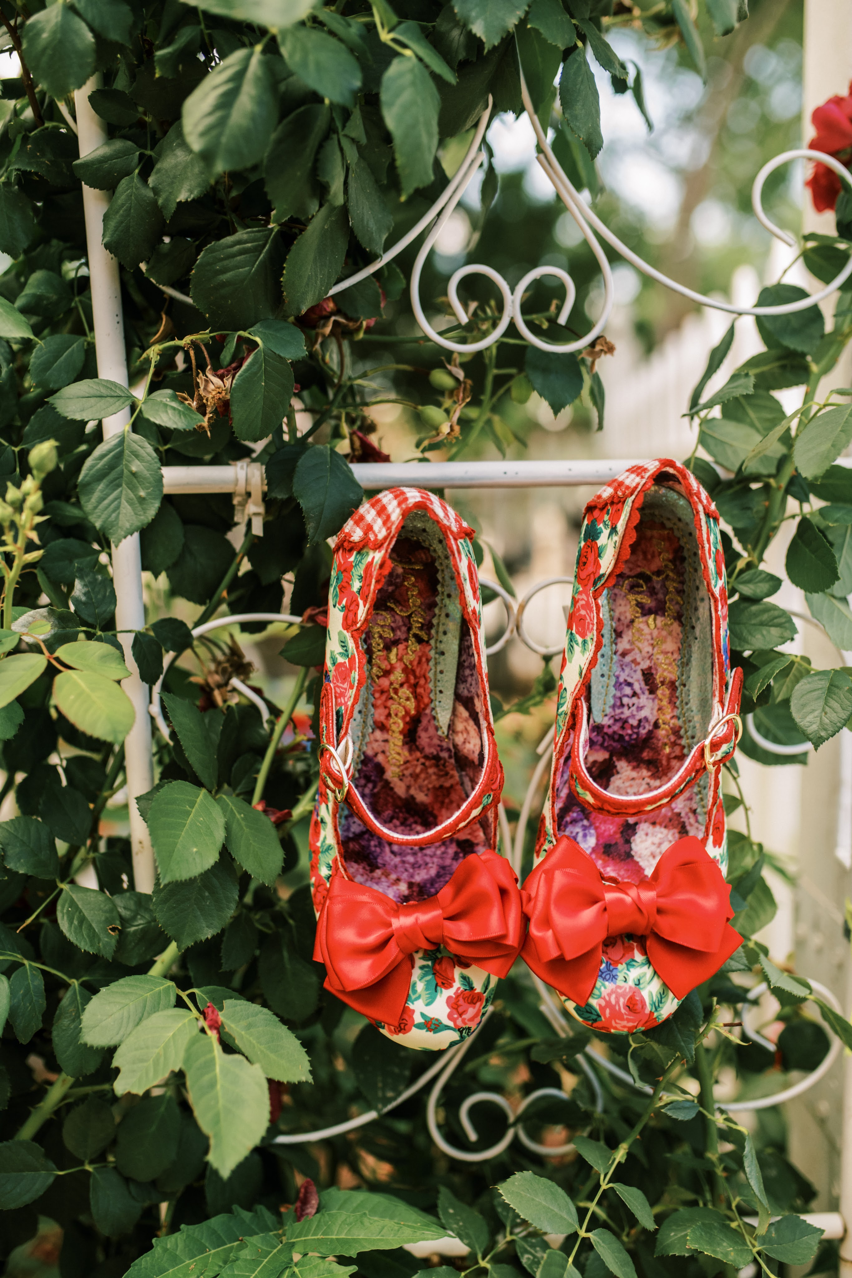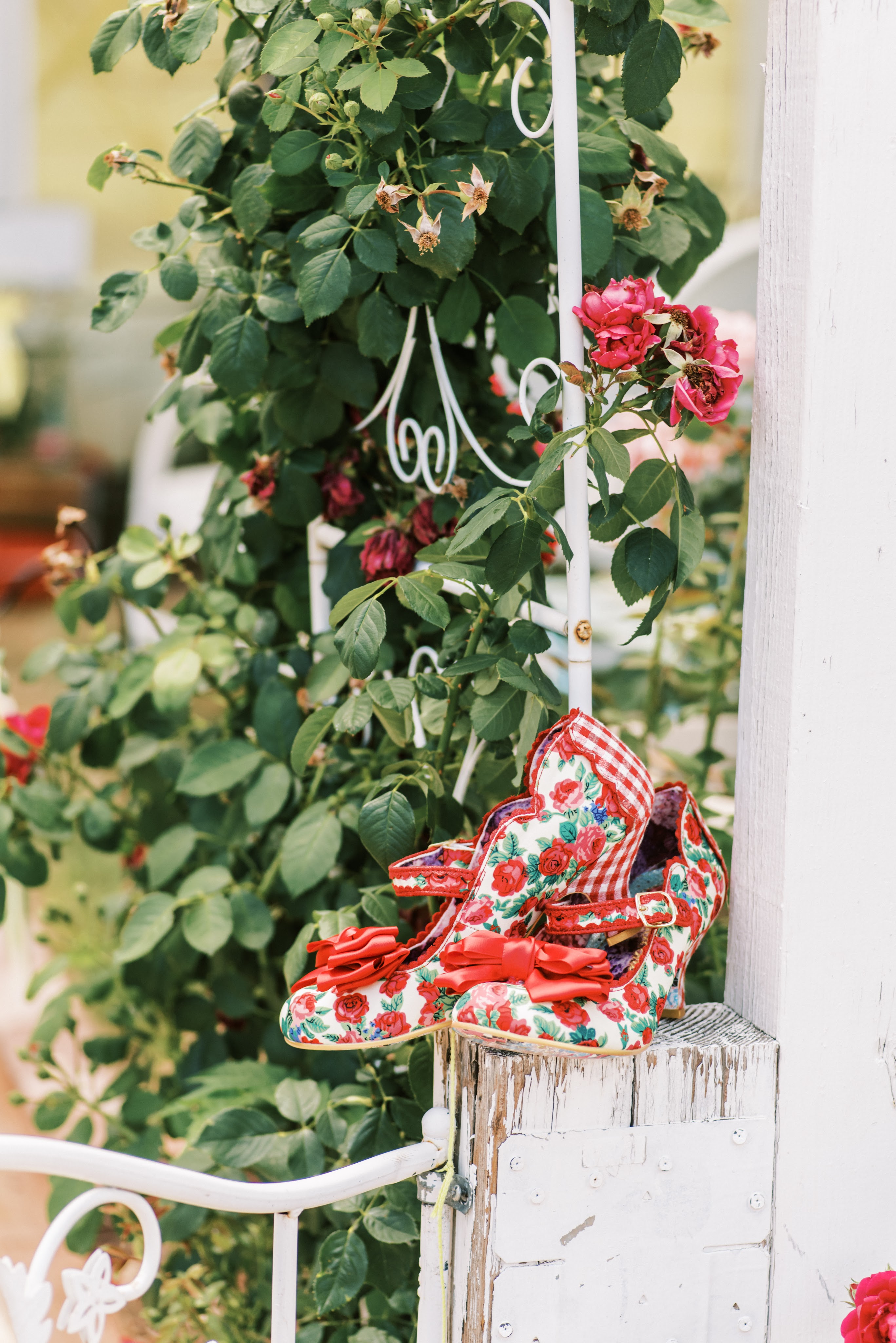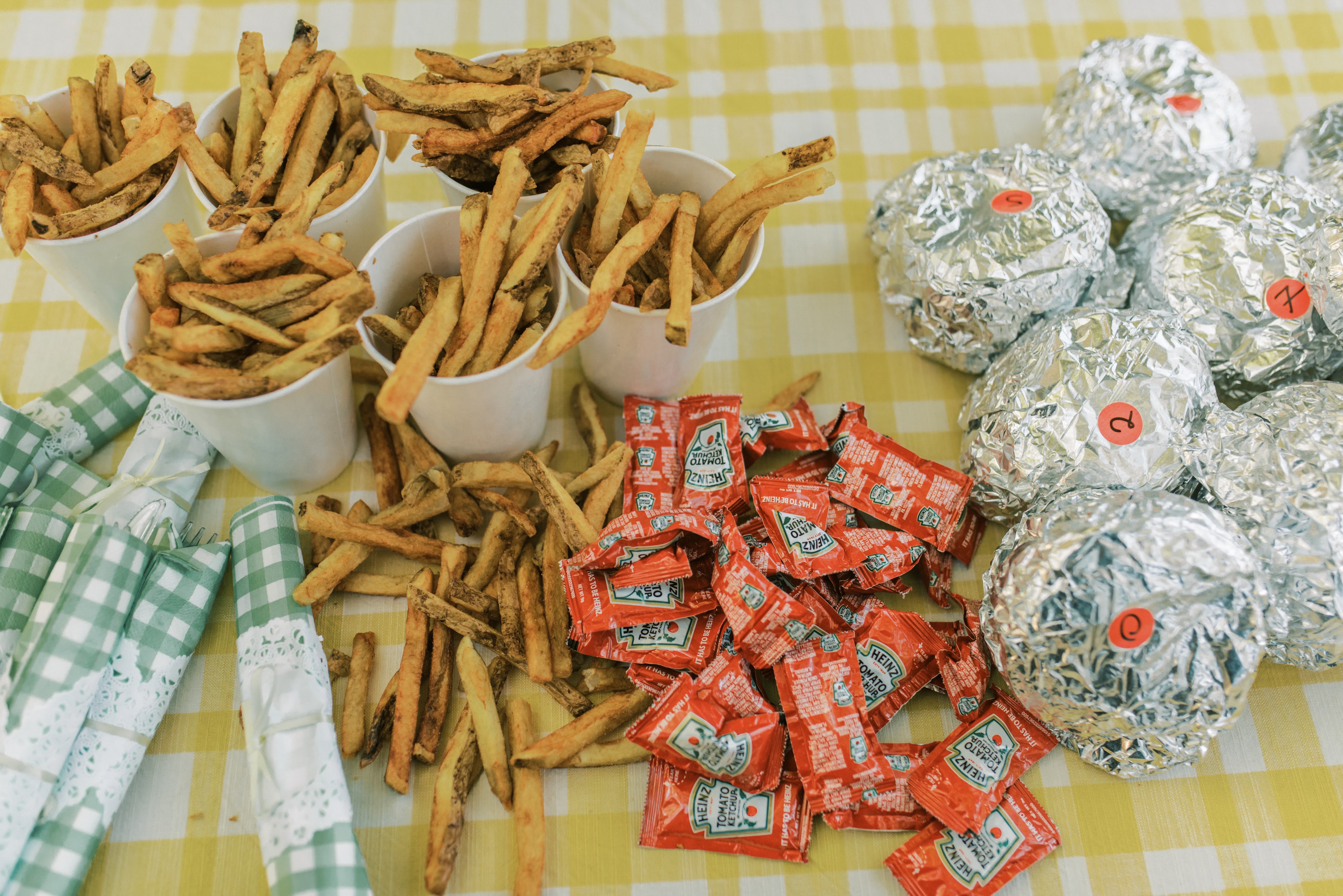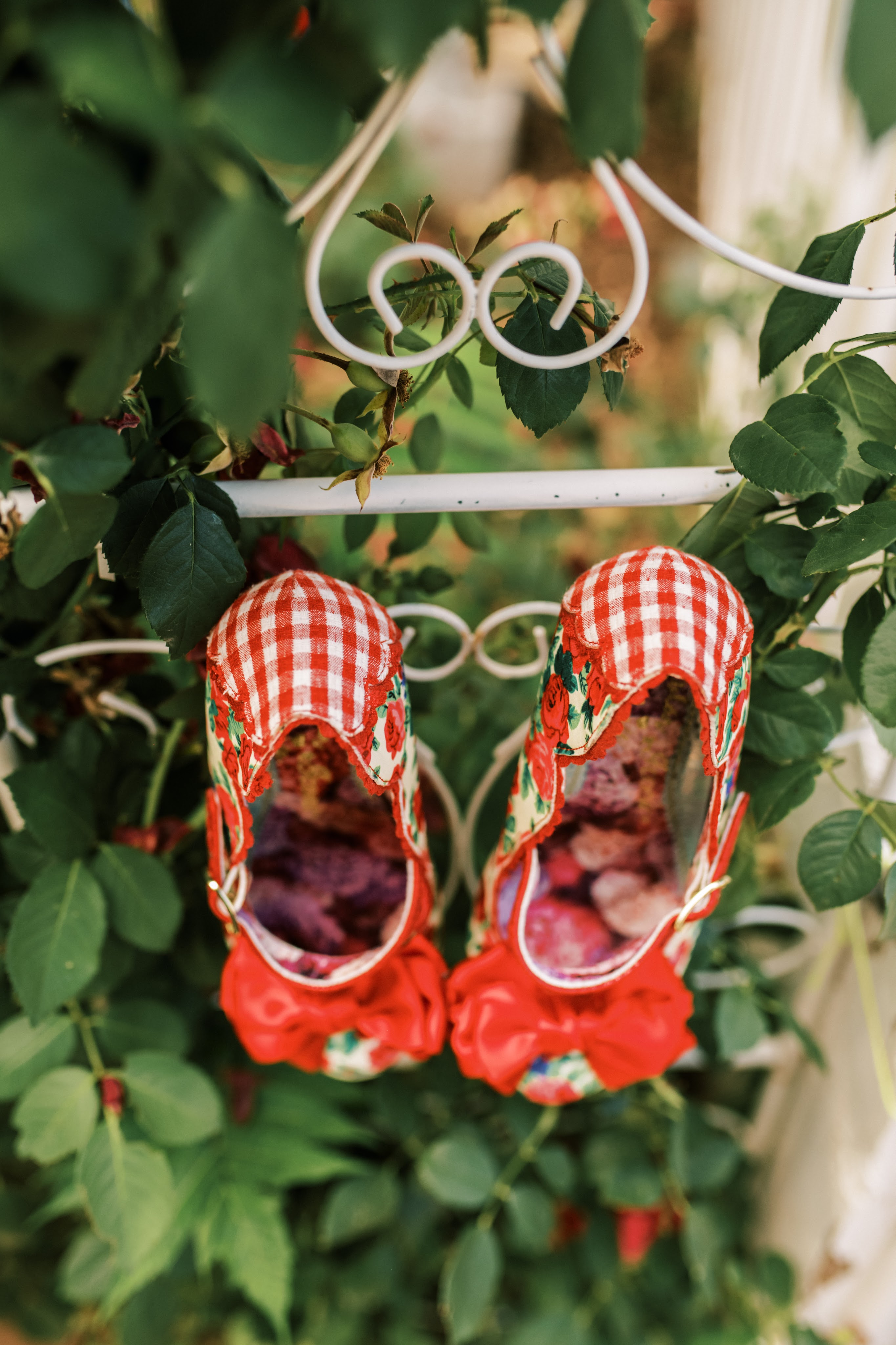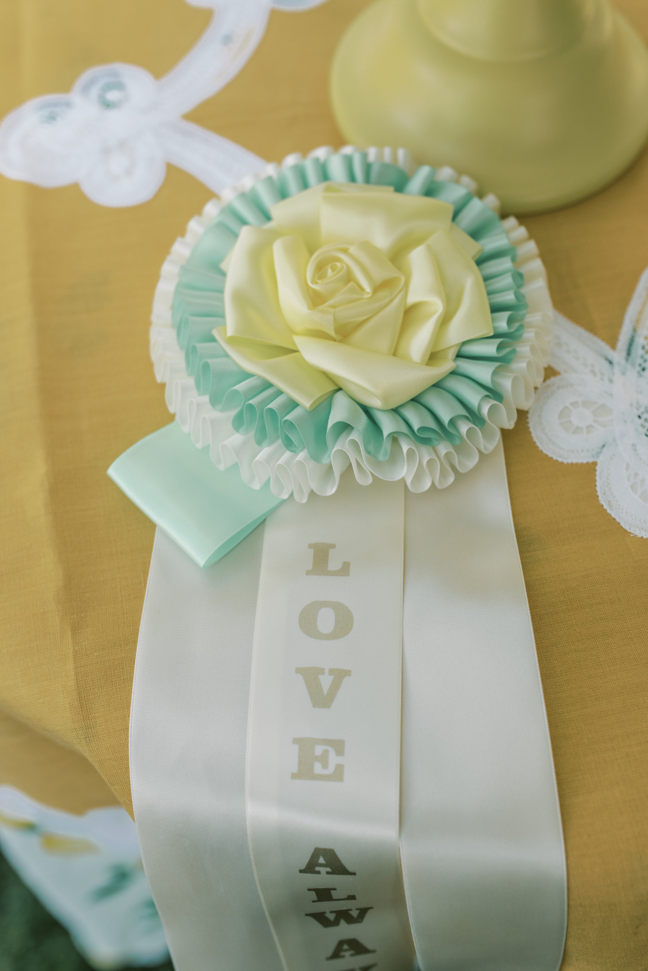 Our colors were yellow and green with splashes of red, and being utterly gingham obsessed, I incoporated gingham from David’s bow-tie, to my bouquet and shoes. We decorated with lots of lemons and limes and daisies, and had personalized Coca Cola along with Five Guys delivered for our wedding dinner and then had a cherry pie cutting!