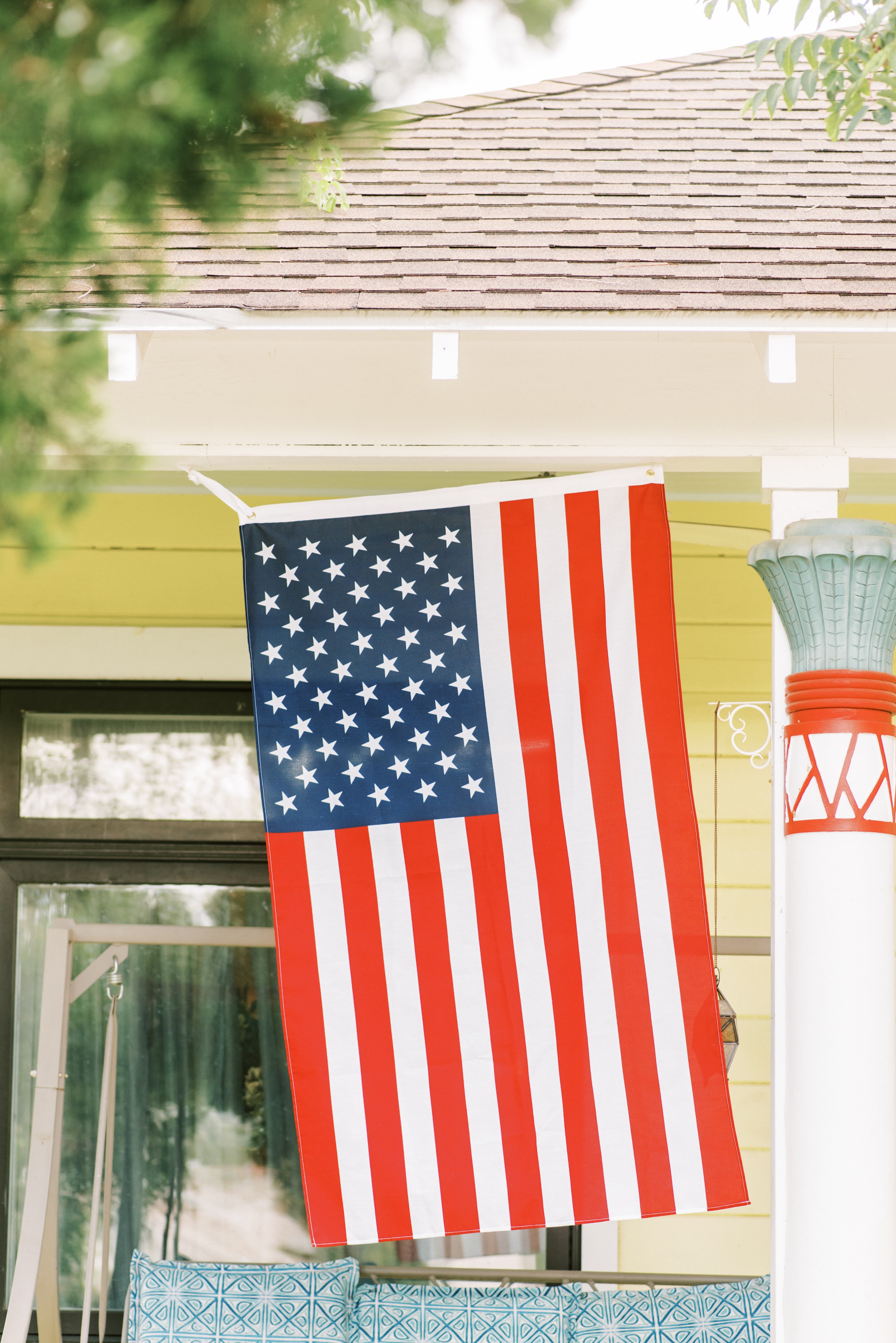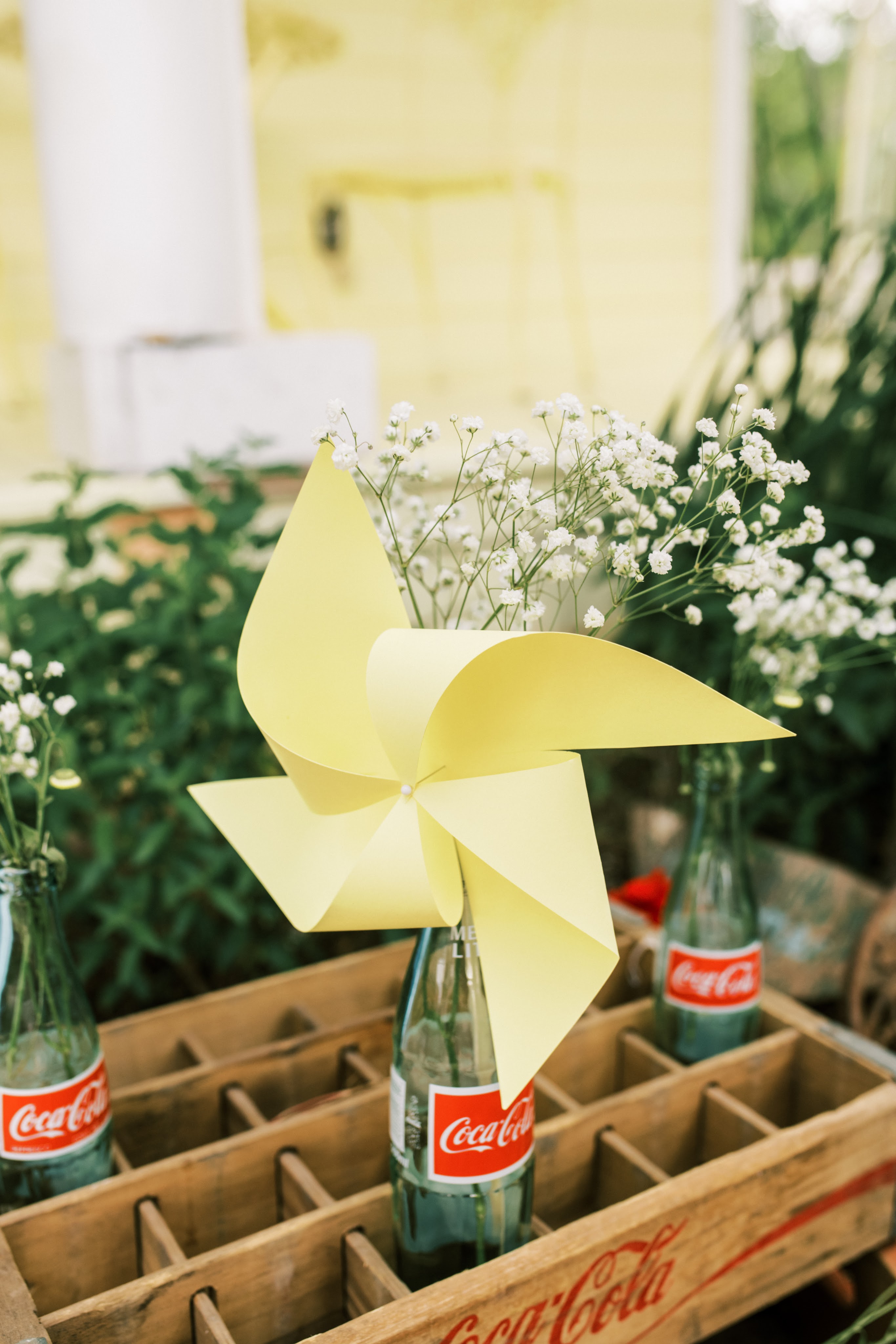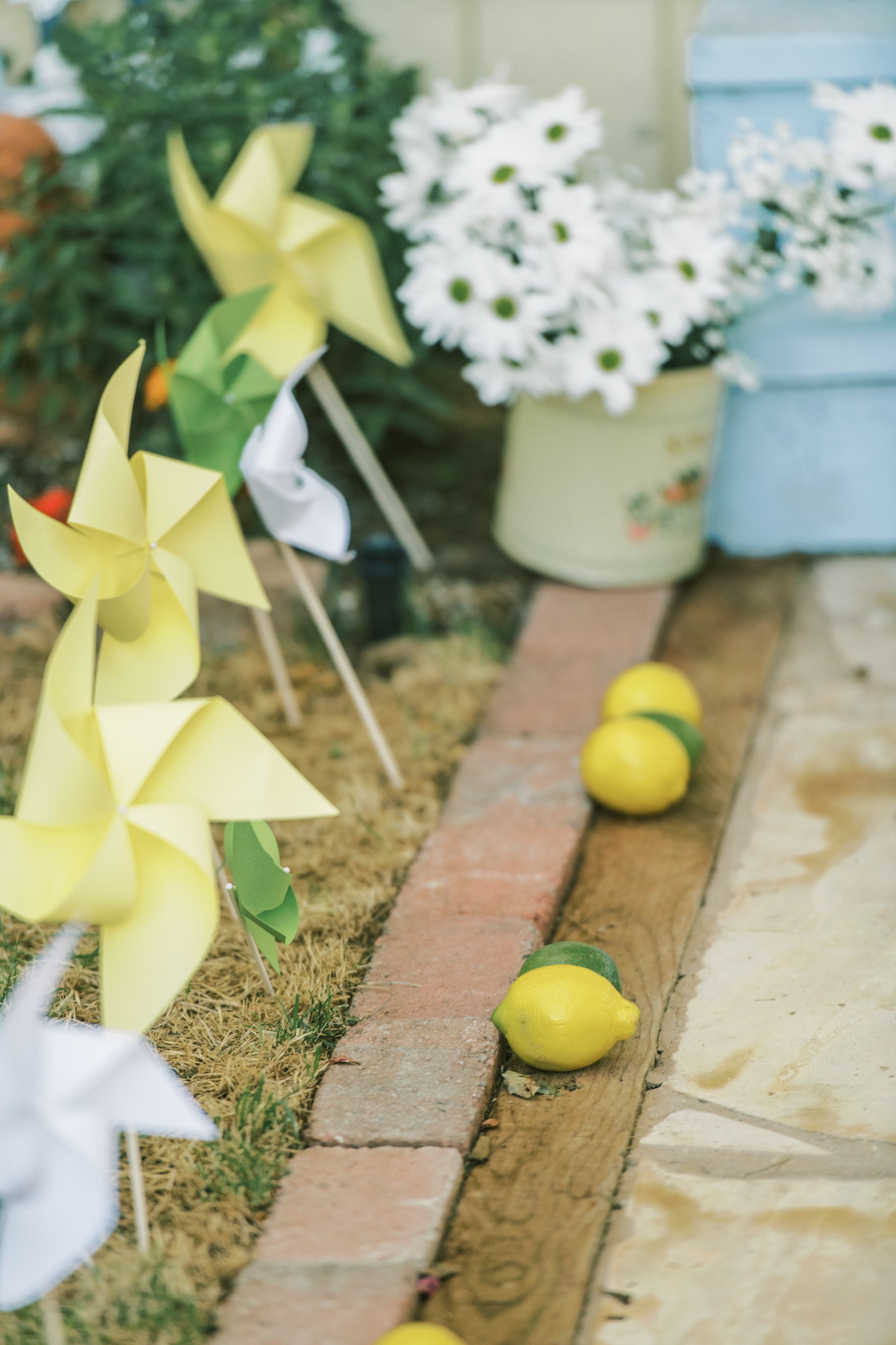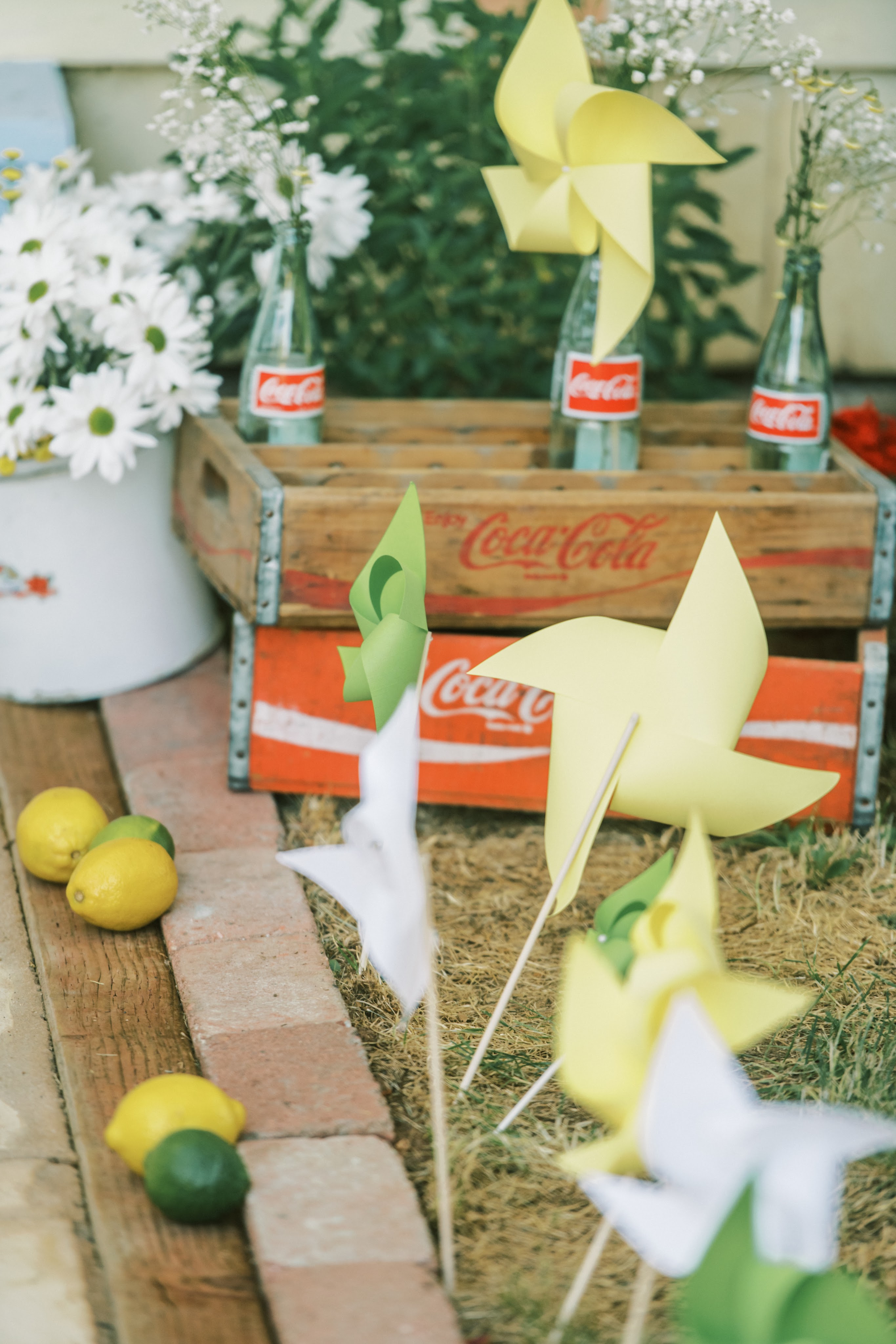 We set out retro lawn chairs in the quaint front yard for our guests and then lined the little walkway to the porch with pinwheels and lemons and daisies. We also hung up an American flag to keep that Americana theme we had going.