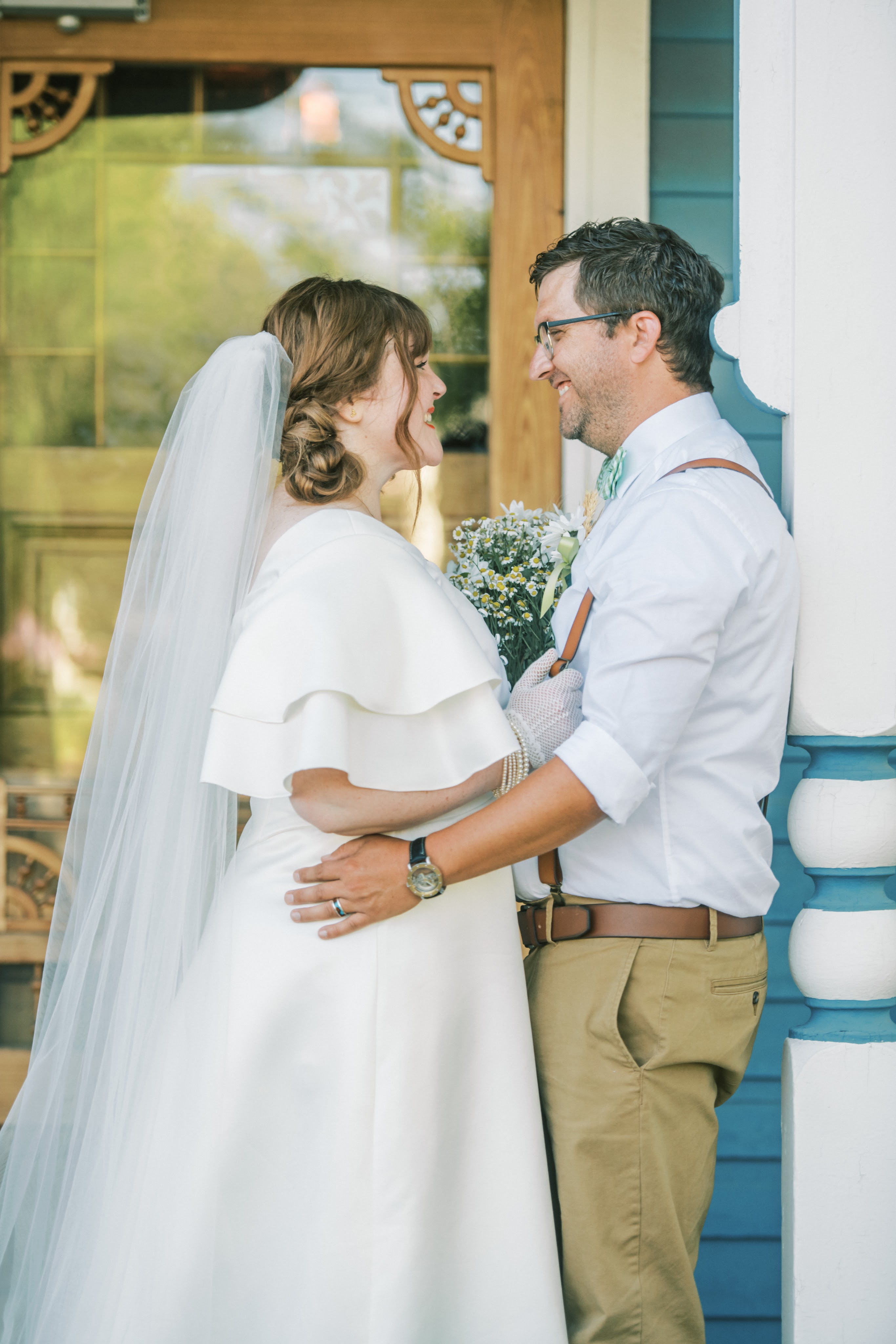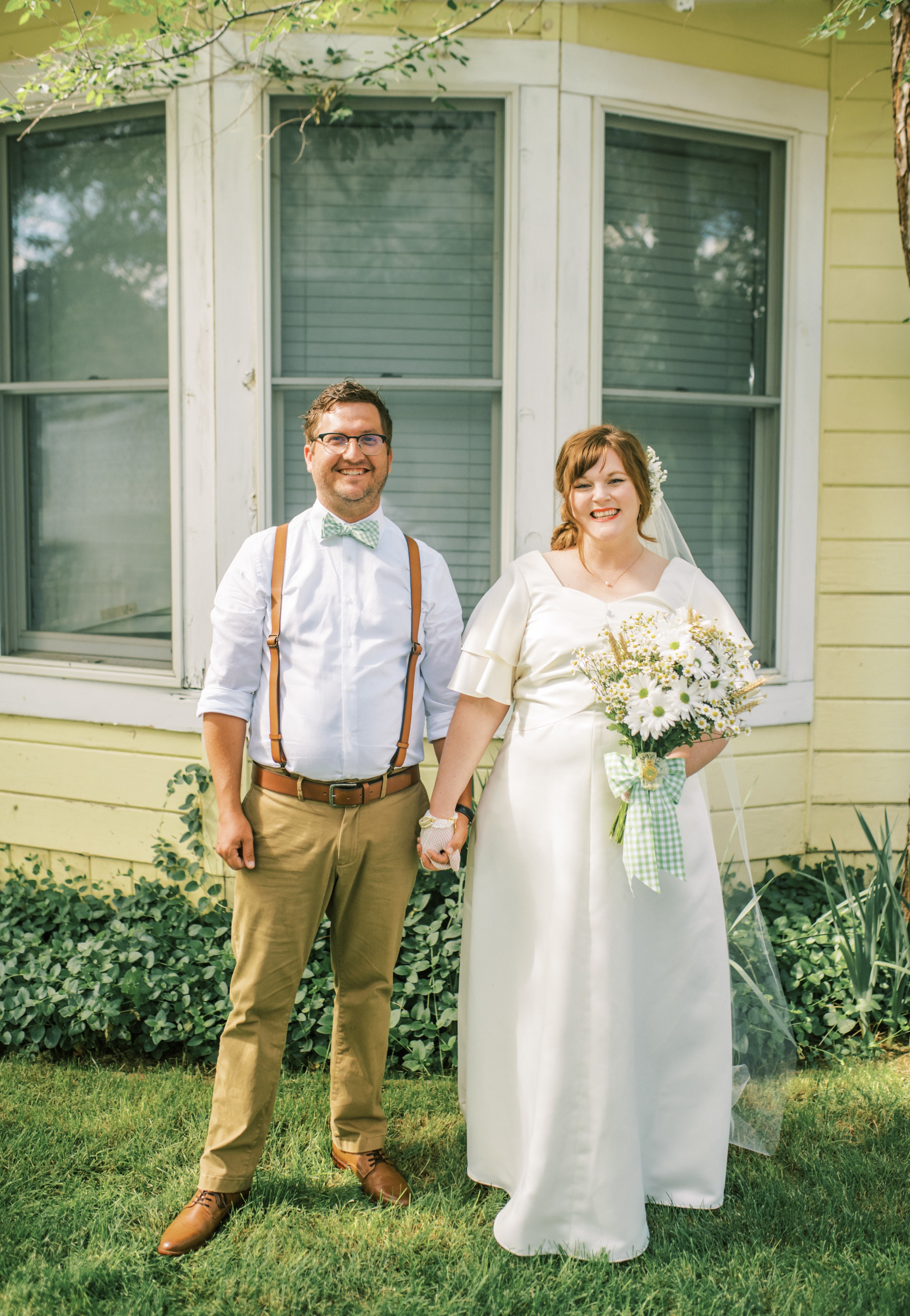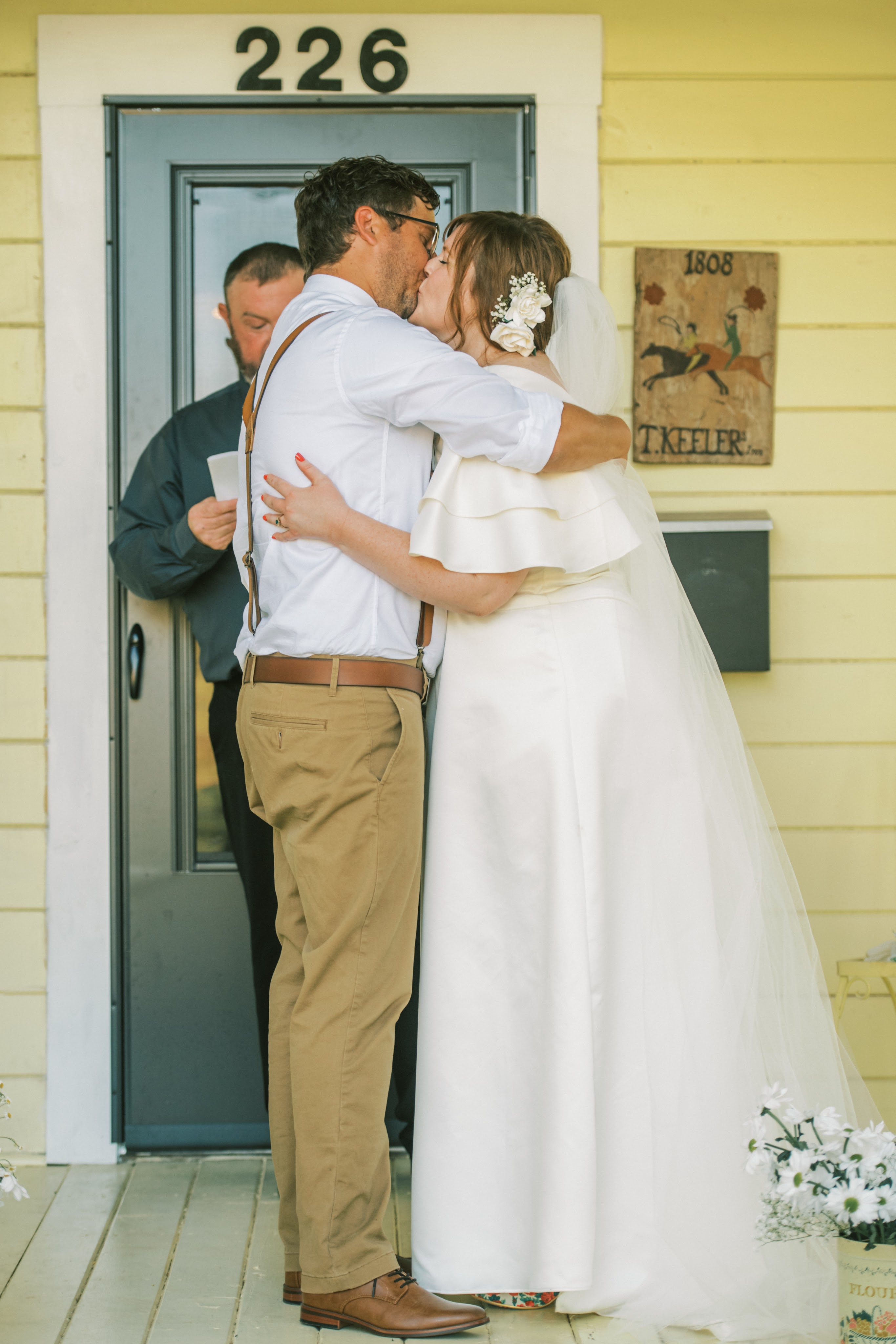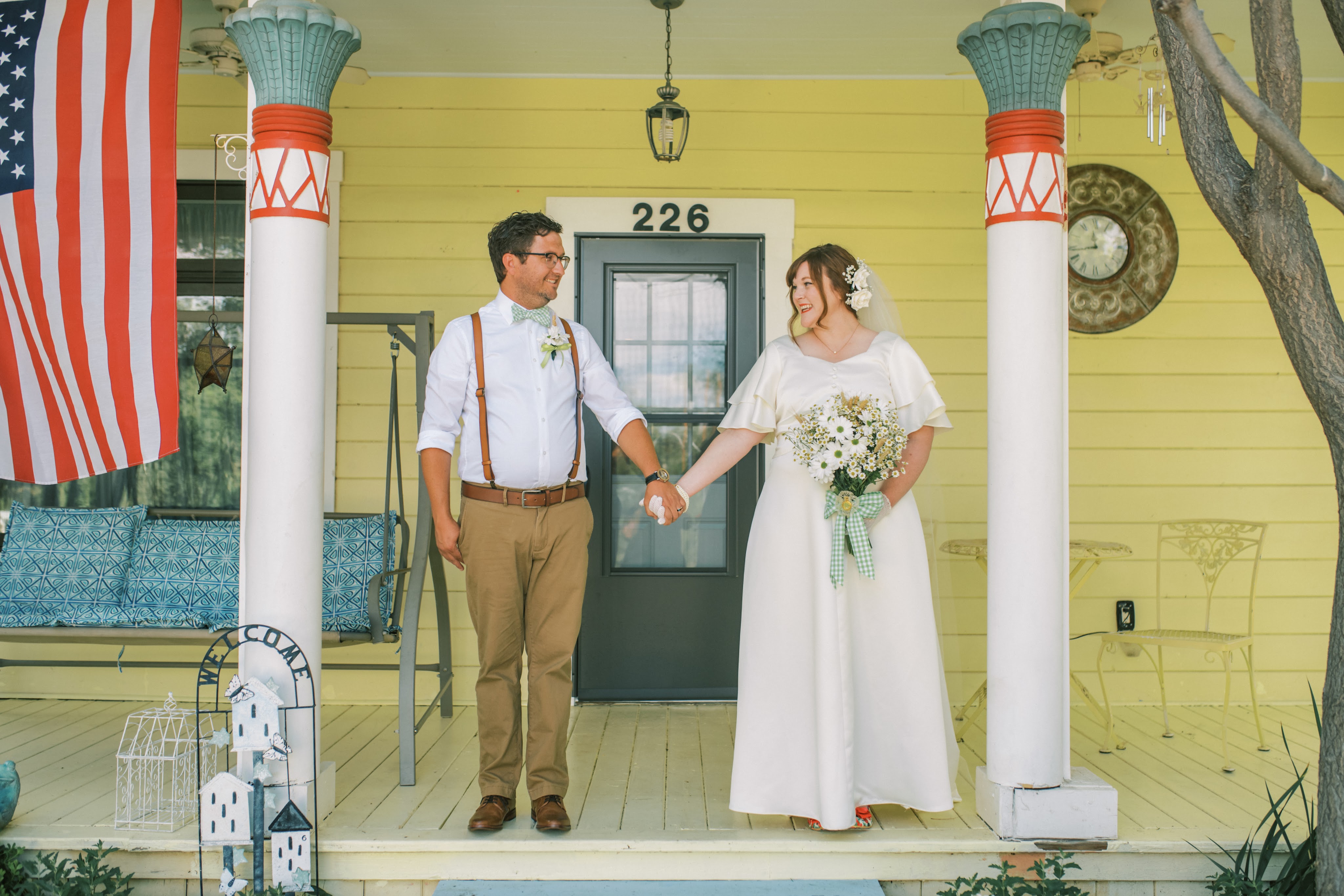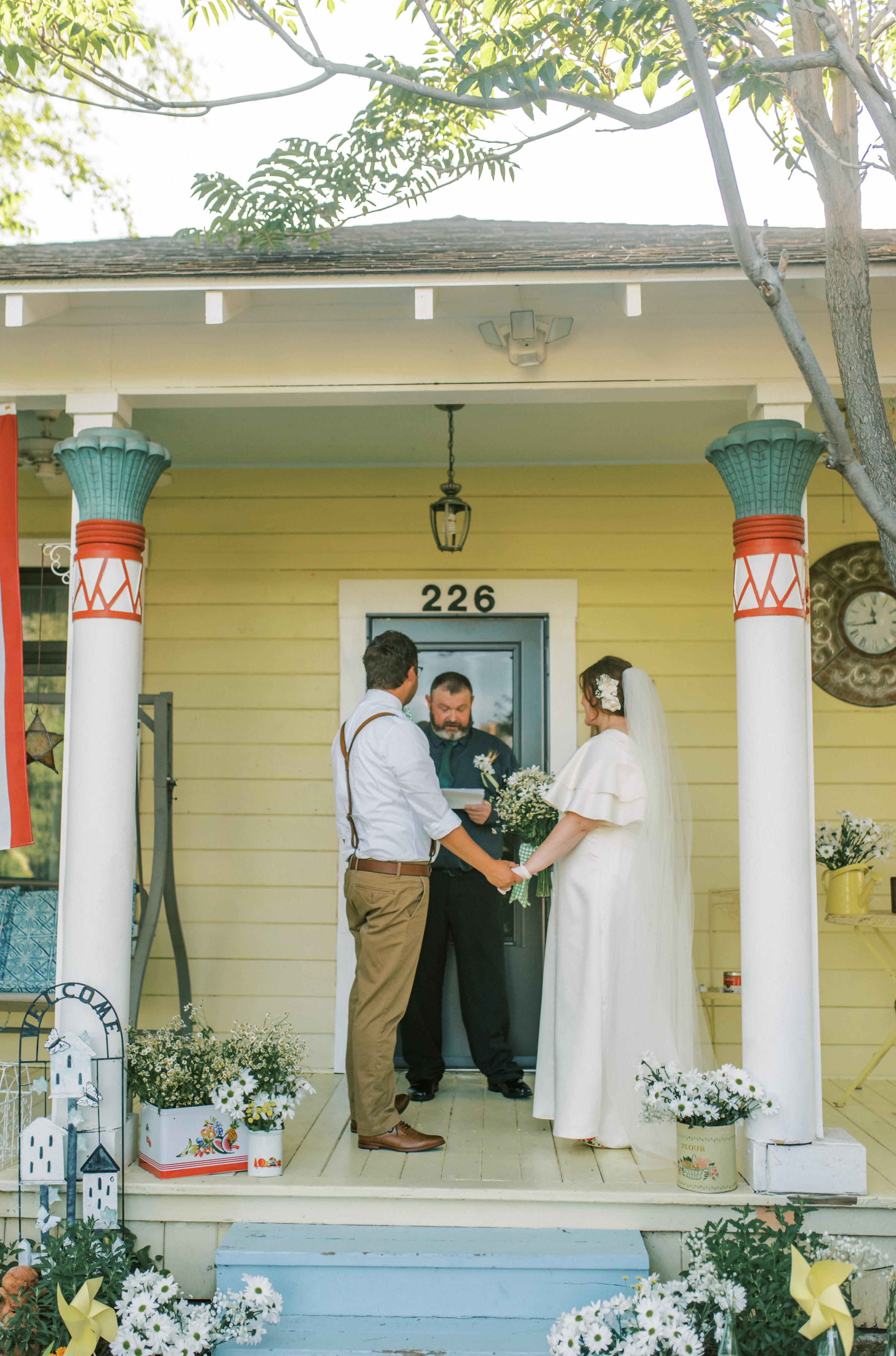 David and I got married on July 1, 2021 in Prescott, Arizona on the front porch of a darling historic yellow home affectionately called The Virginia Dollhouse. It was small and intimate, with only our parents and a few siblings that helped with the wedding: My sister’s boyfriend, Mike, married us, and my sister Shannon did my hair and make-up. The plan was to have a sweet and small wedding and then later have a large reception with family and friends, but for the actual wedding day, I wanted to keep it simple.