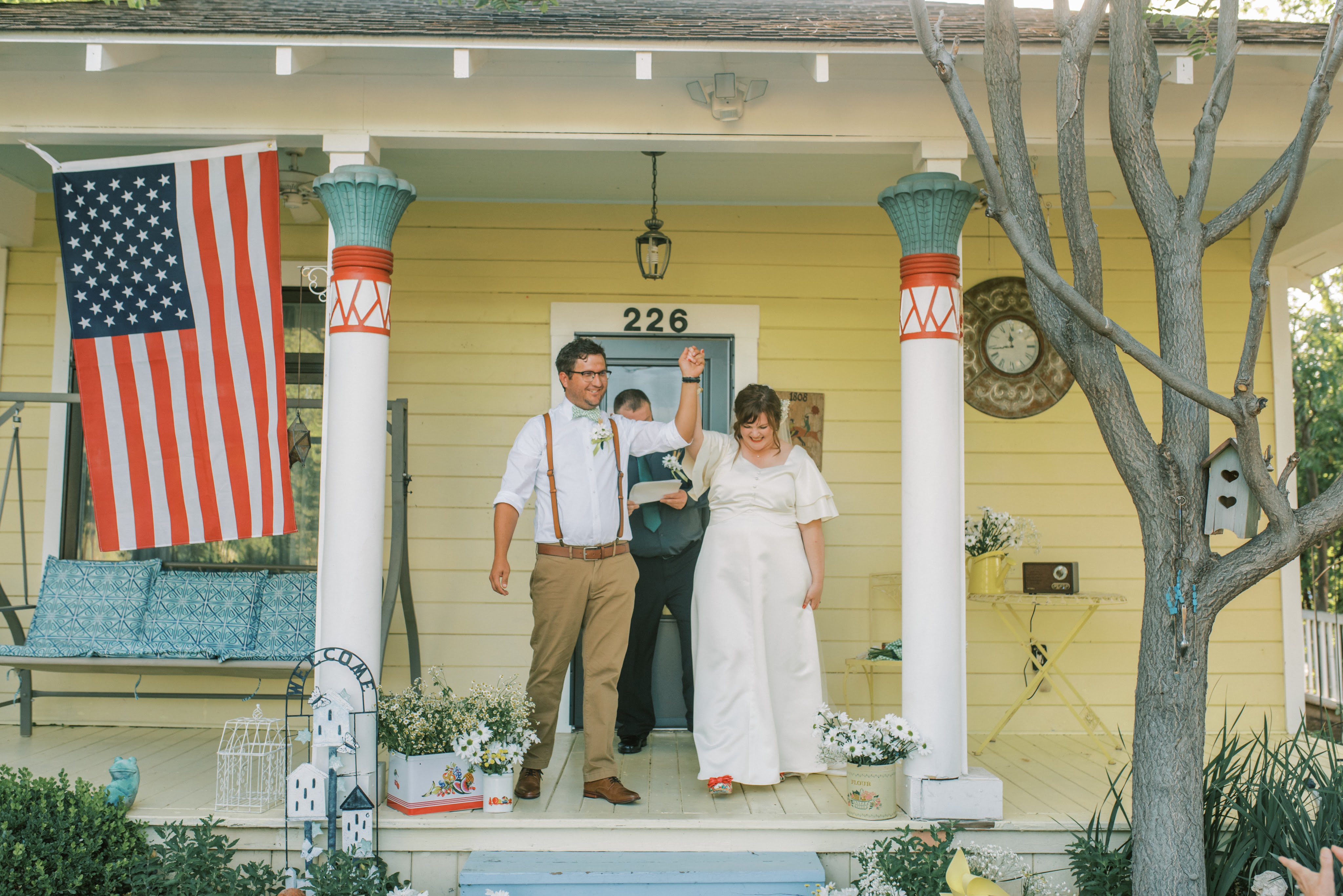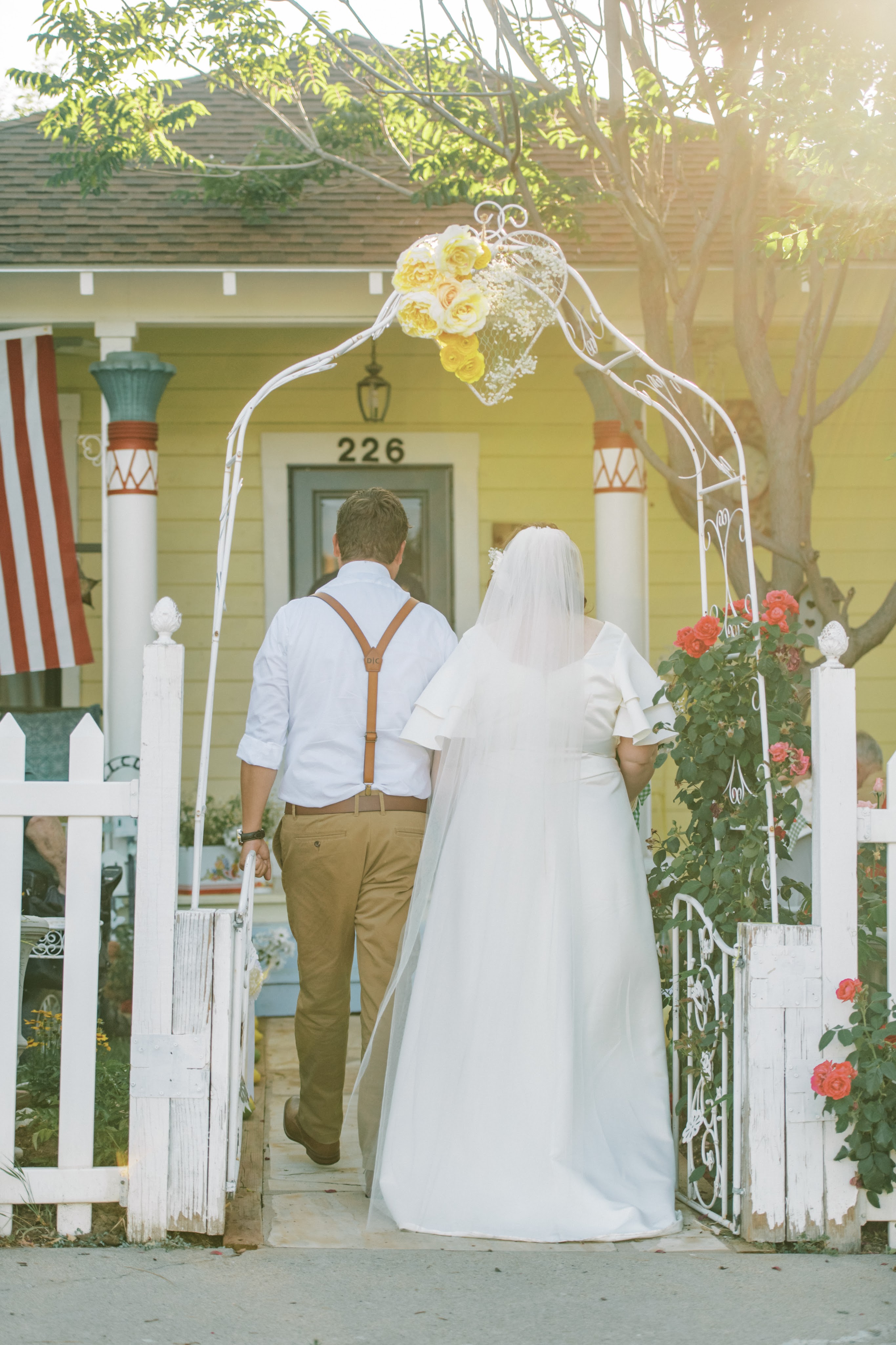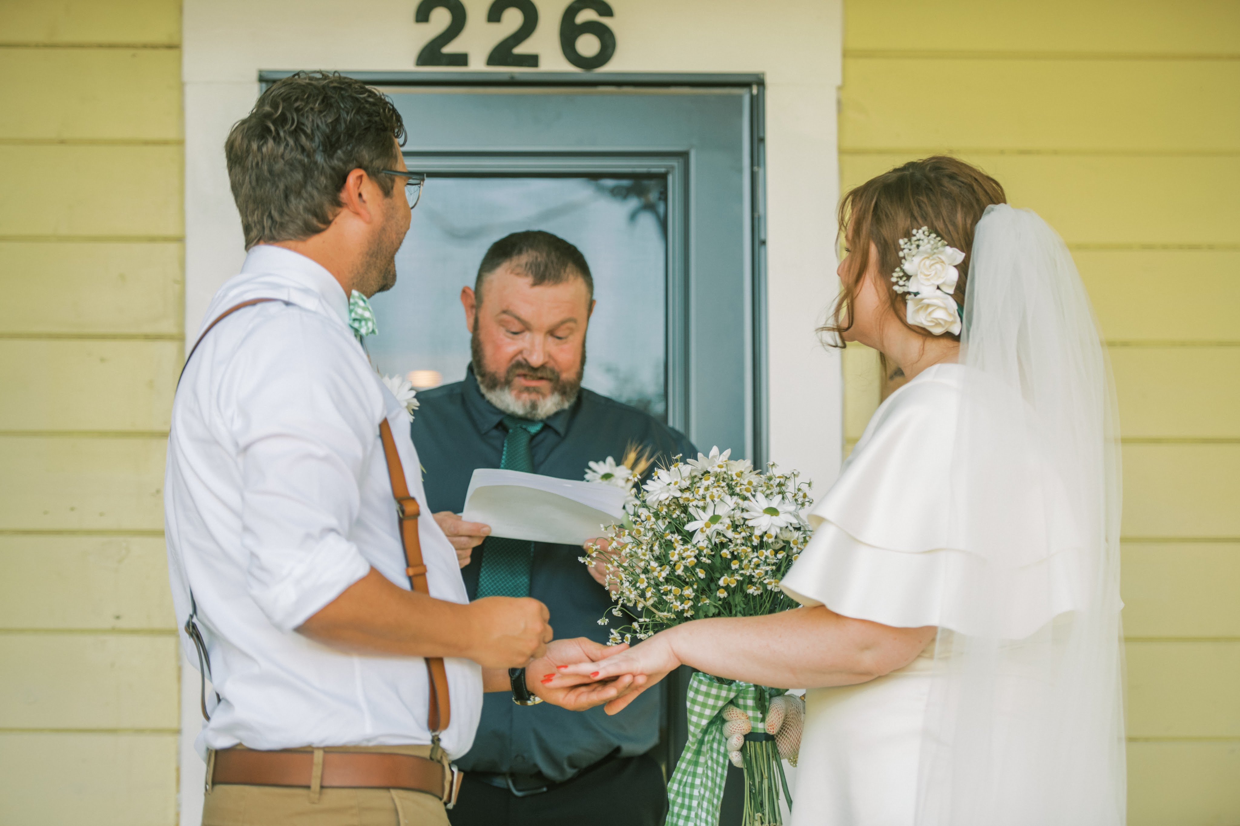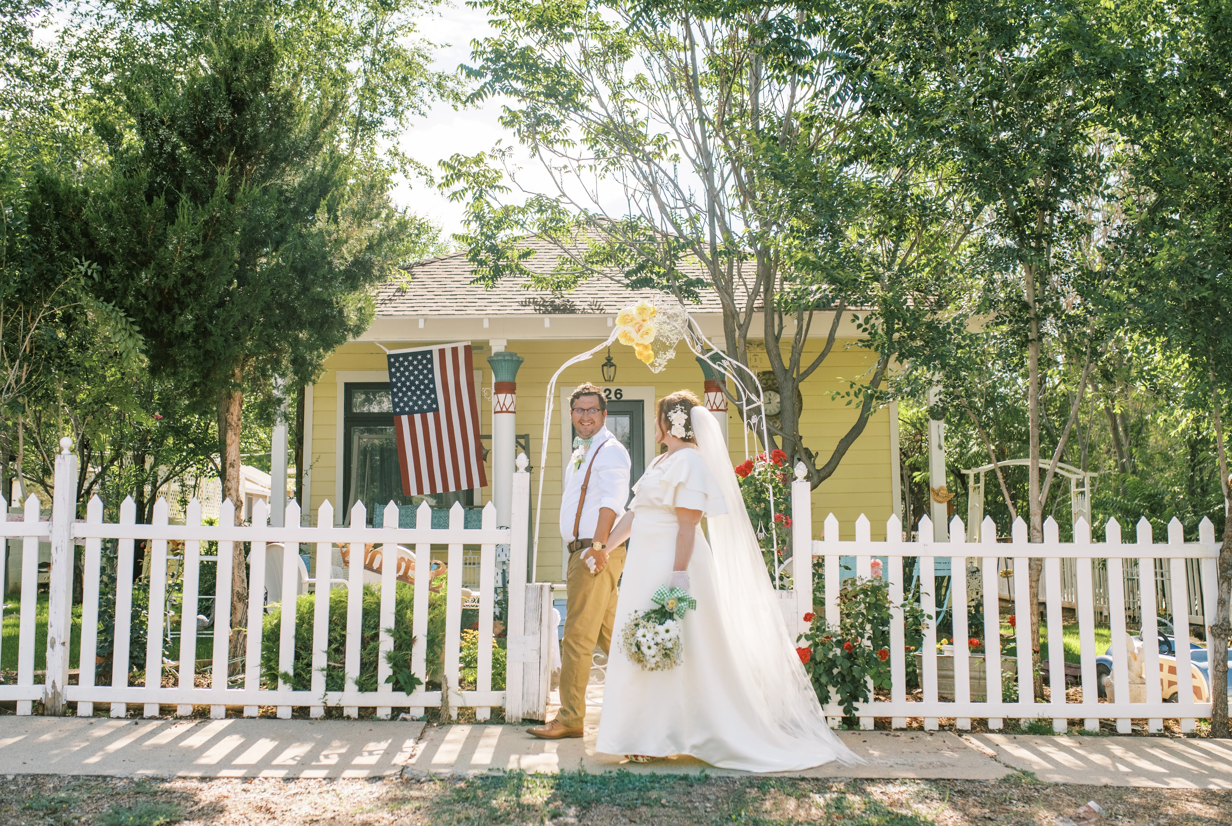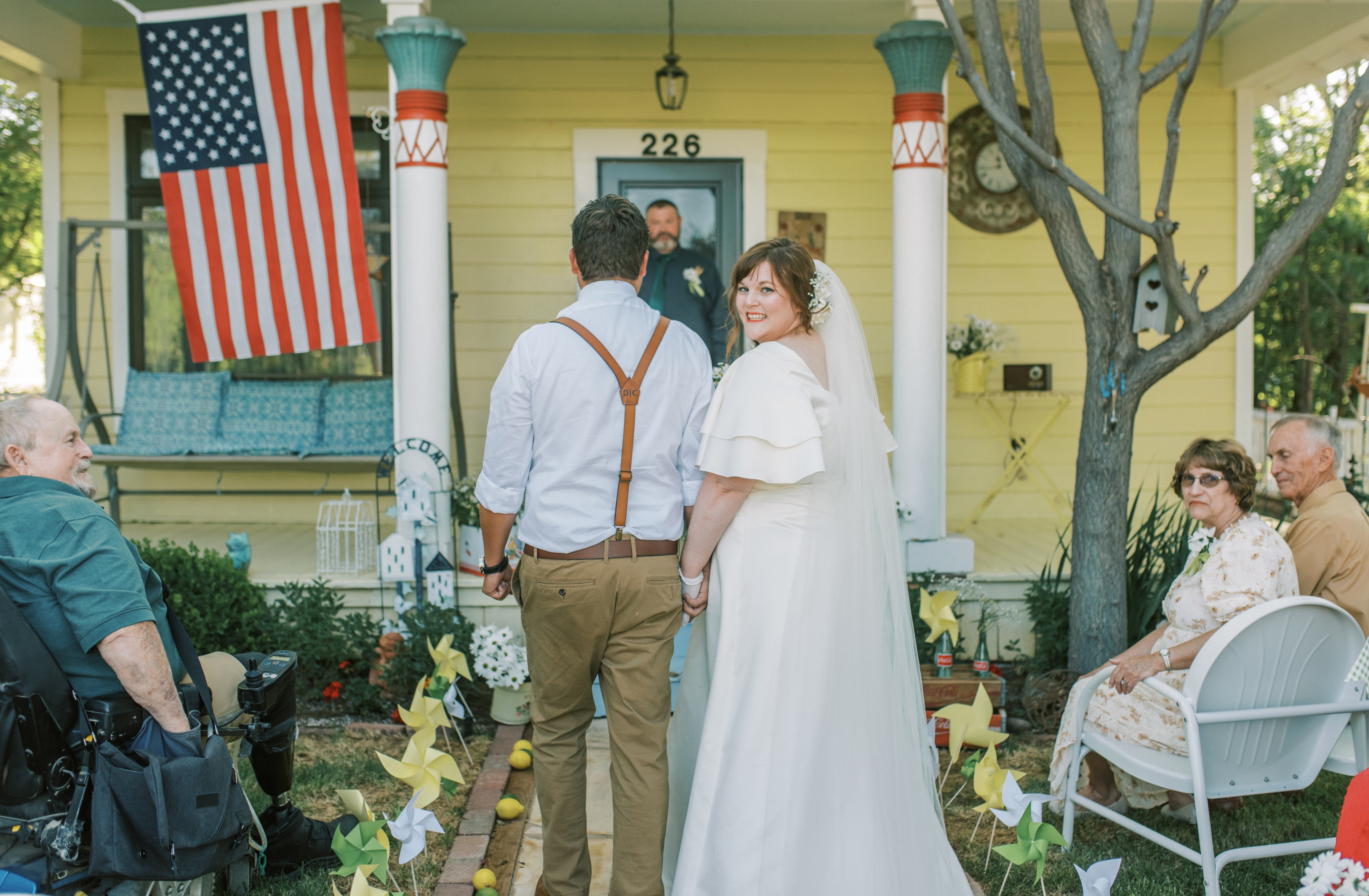 David and I got married on July 1, 2021 in Prescott, Arizona on the front porch of a darling historic yellow home affectionately called The Virginia Dollhouse. It was small and intimate, with only our parents and a few siblings that helped with the wedding: My sister’s boyfriend, Mike, married us, and my sister Shannon did my hair and make-up. The plan was to have a sweet and small wedding and then later have a large reception with family and friends, but for the actual wedding day, I wanted to keep it simple.