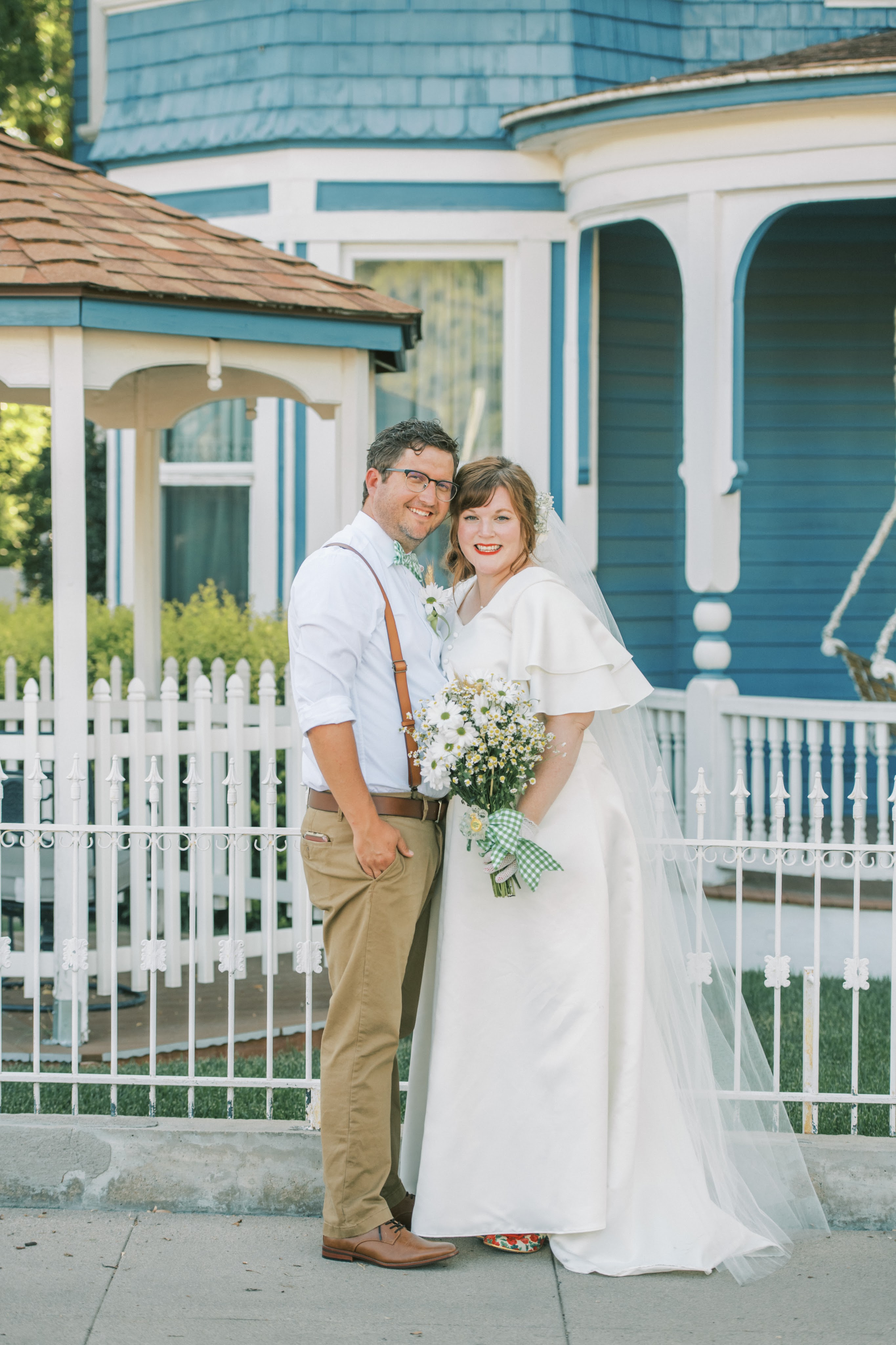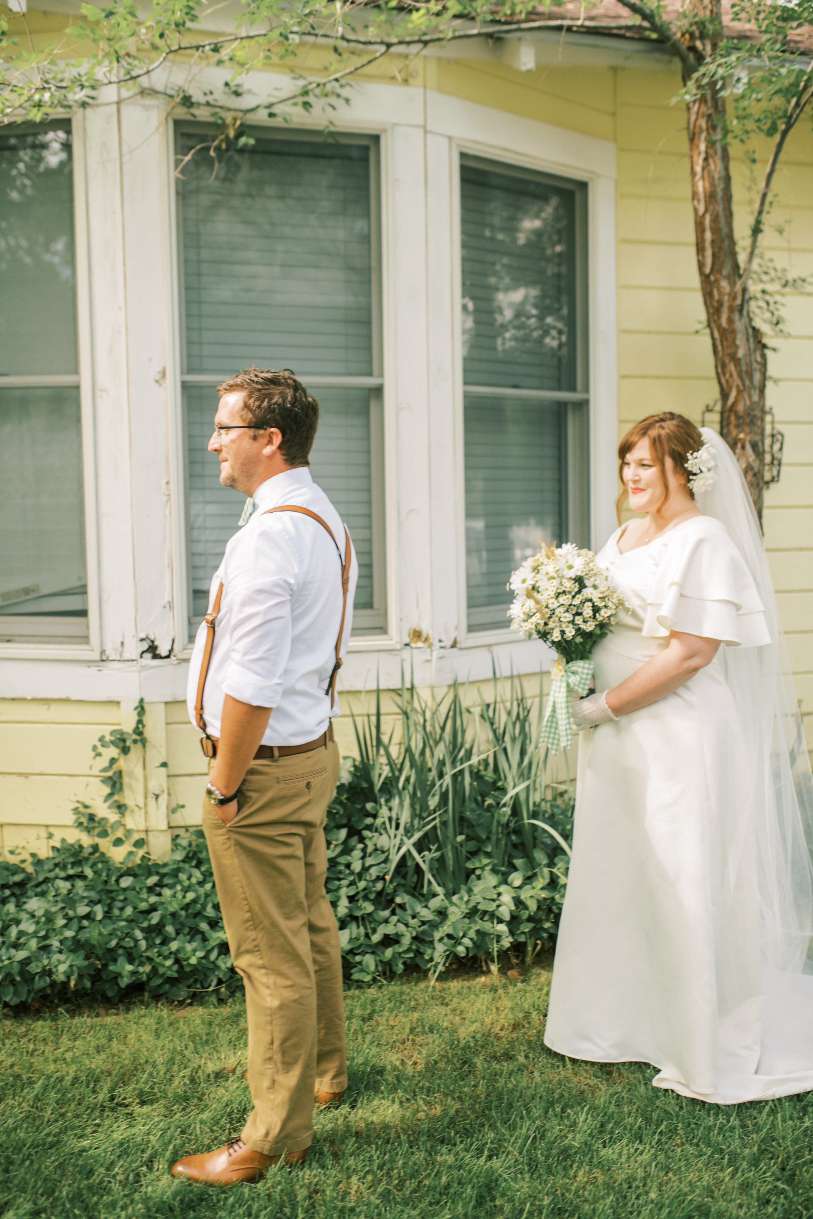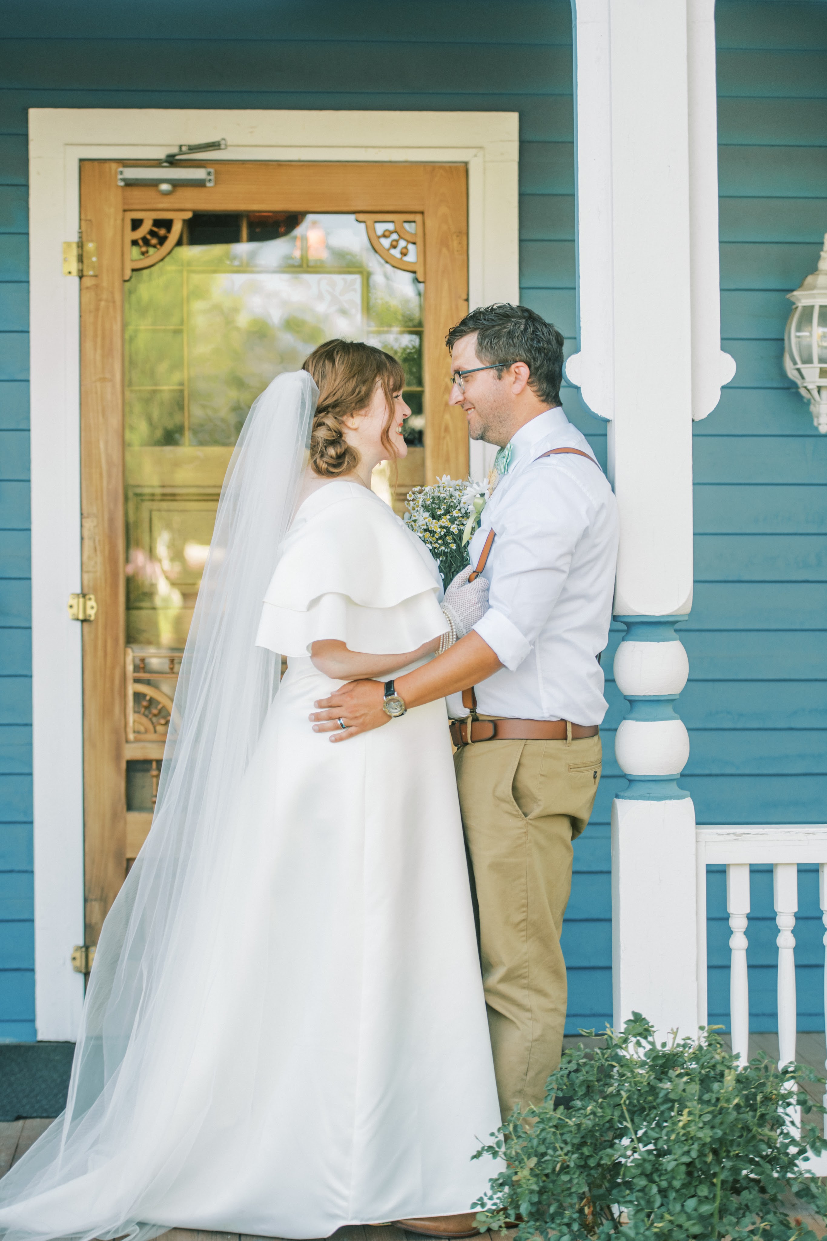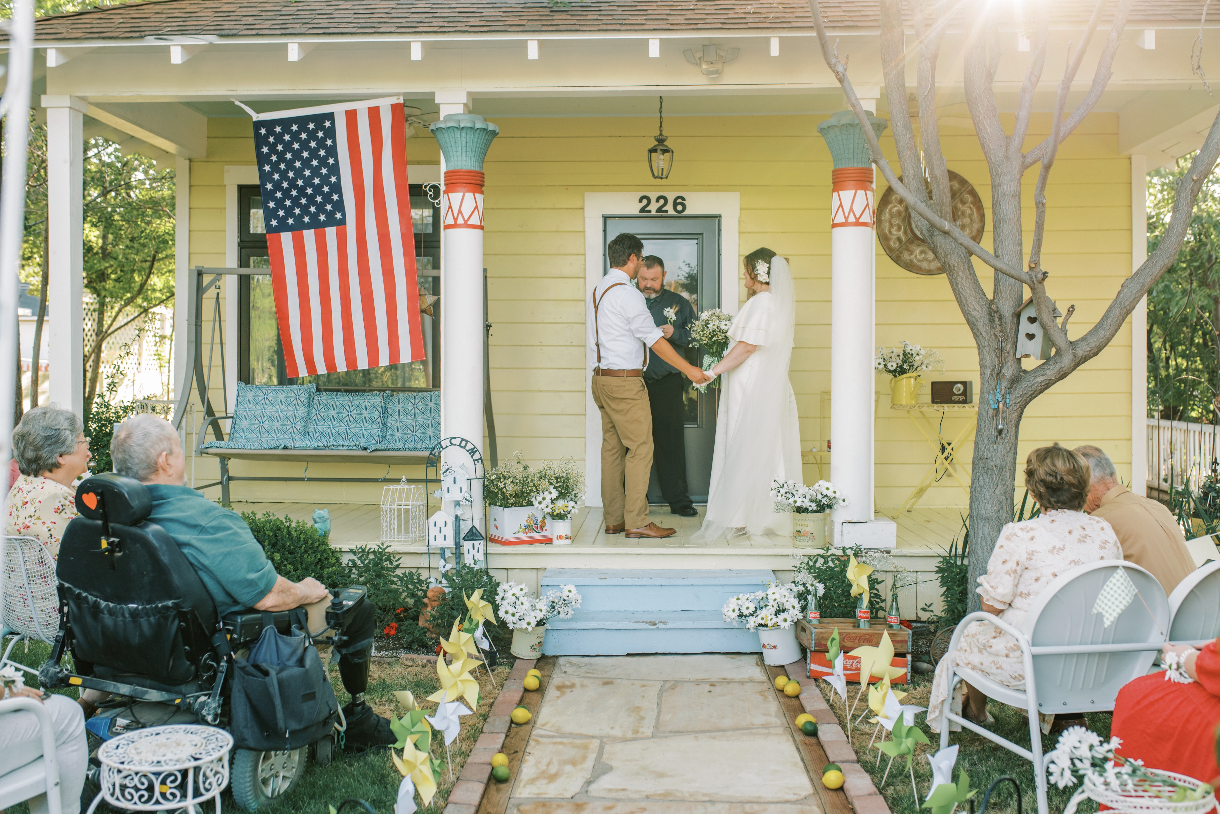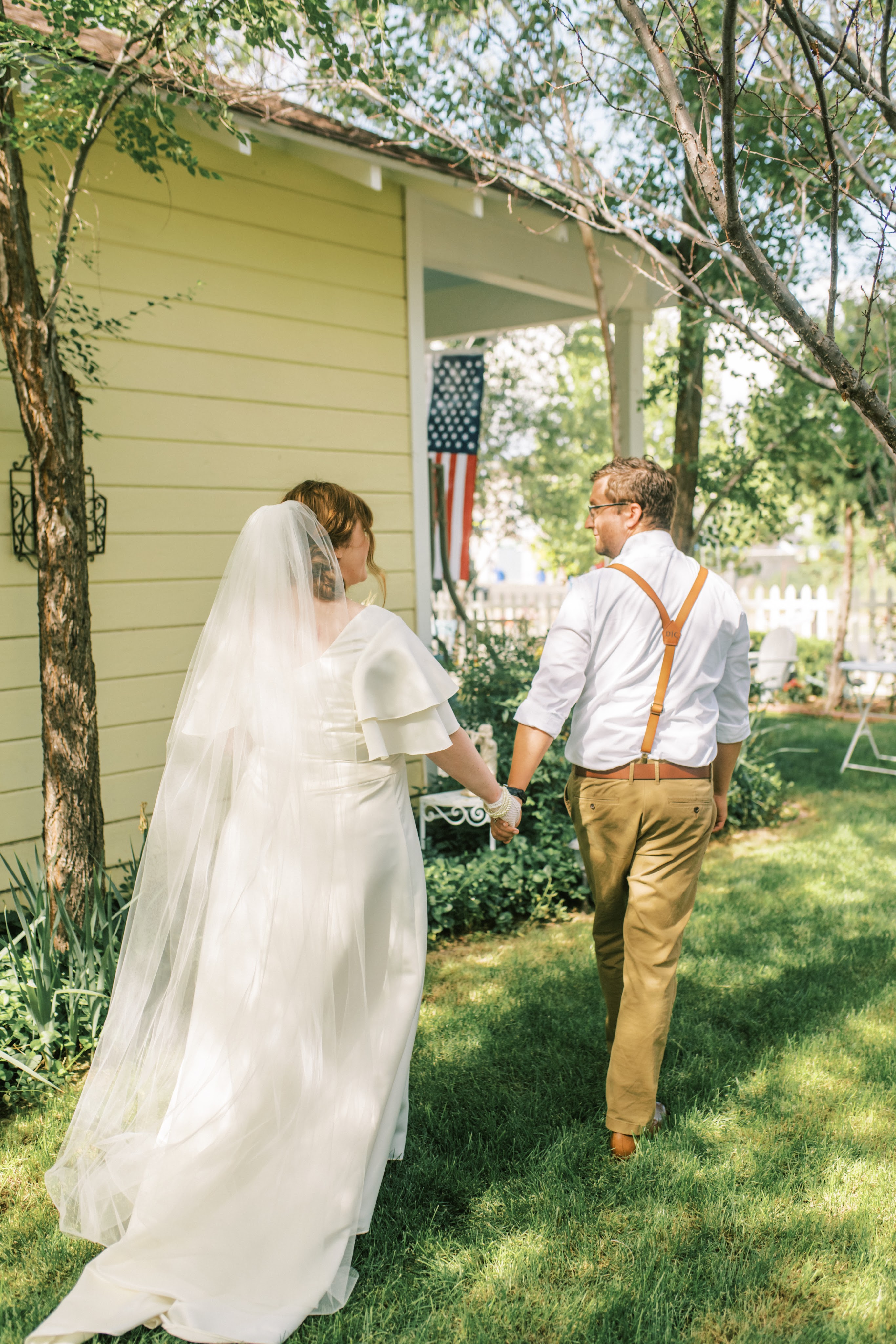 David and I got married on July 1, 2021 in Prescott, Arizona on the front porch of a darling historic yellow home affectionately called The Virginia Dollhouse. It was small and intimate, with only our parents and a few siblings that helped with the wedding: My sister’s boyfriend, Mike, married us, and my sister Shannon did my hair and make-up. The plan was to have a sweet and small wedding and then later have a large reception with family and friends, but for the actual wedding day, I wanted to keep it simple.
