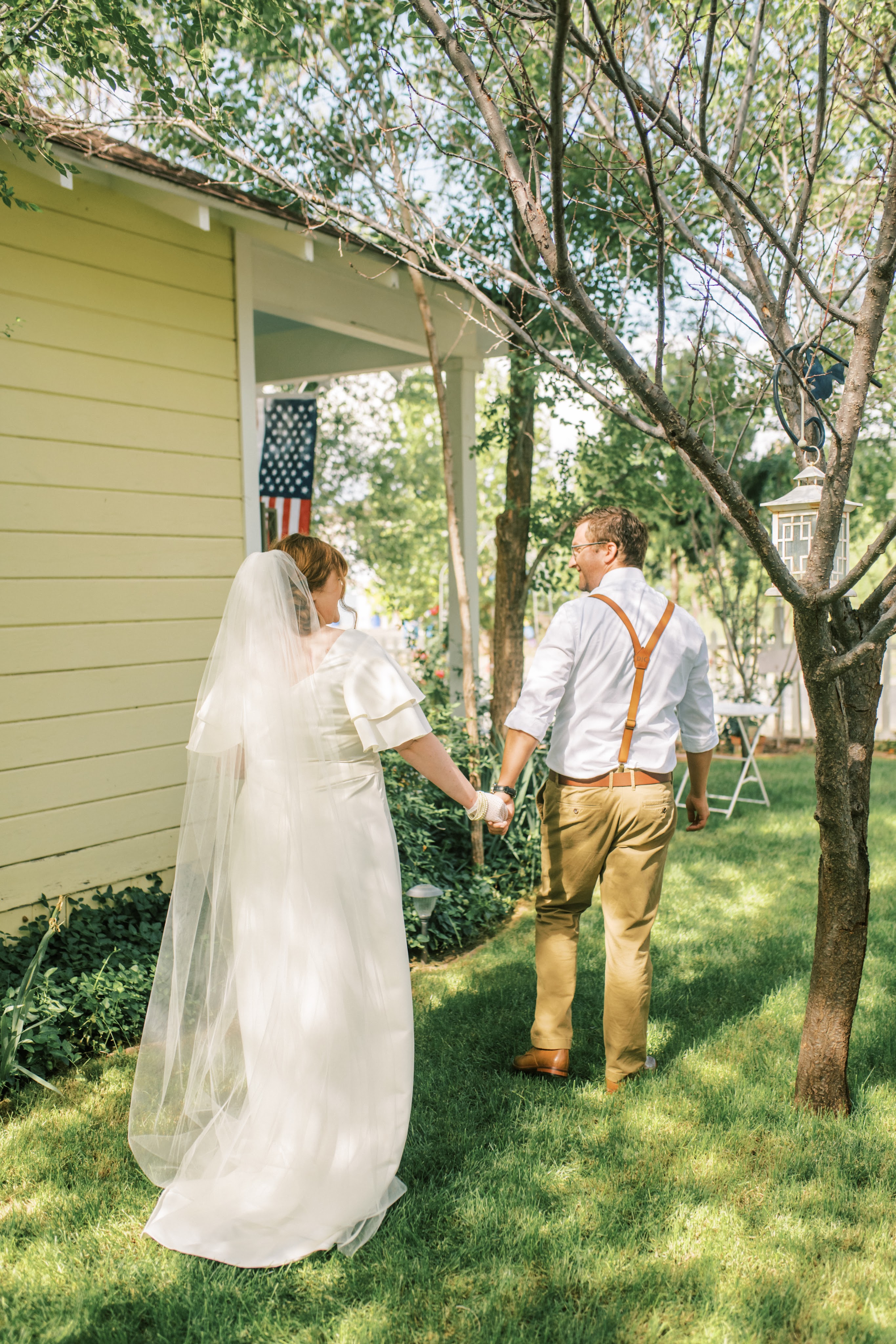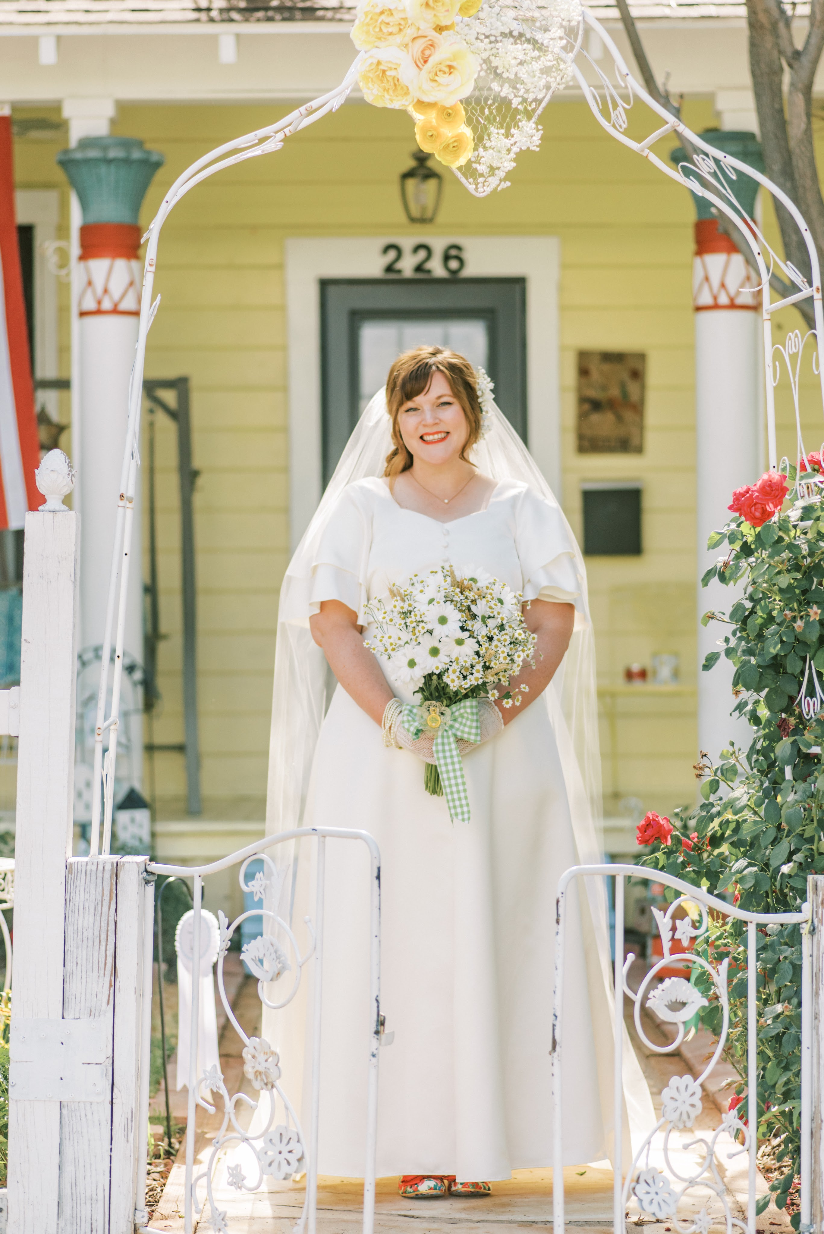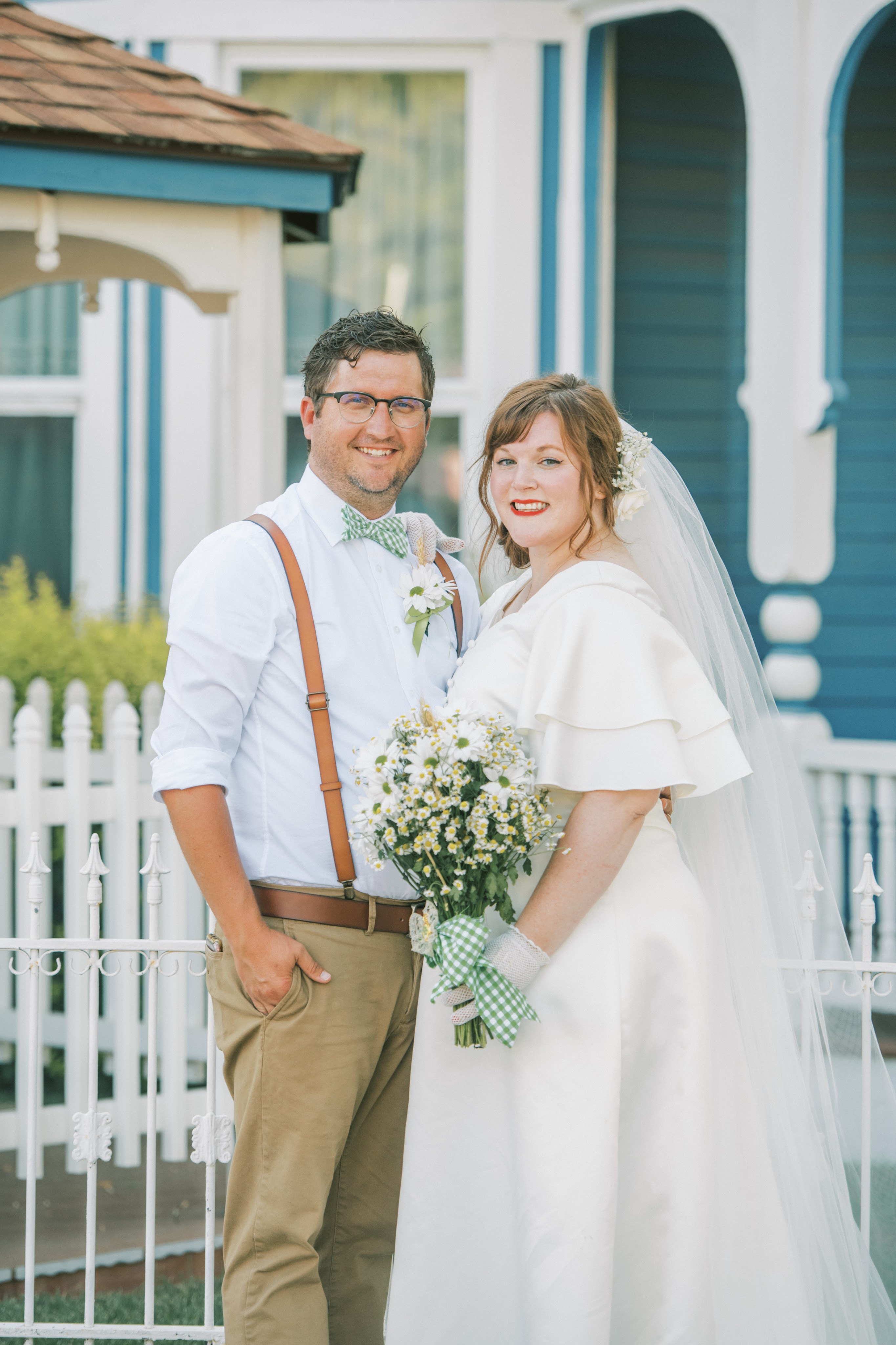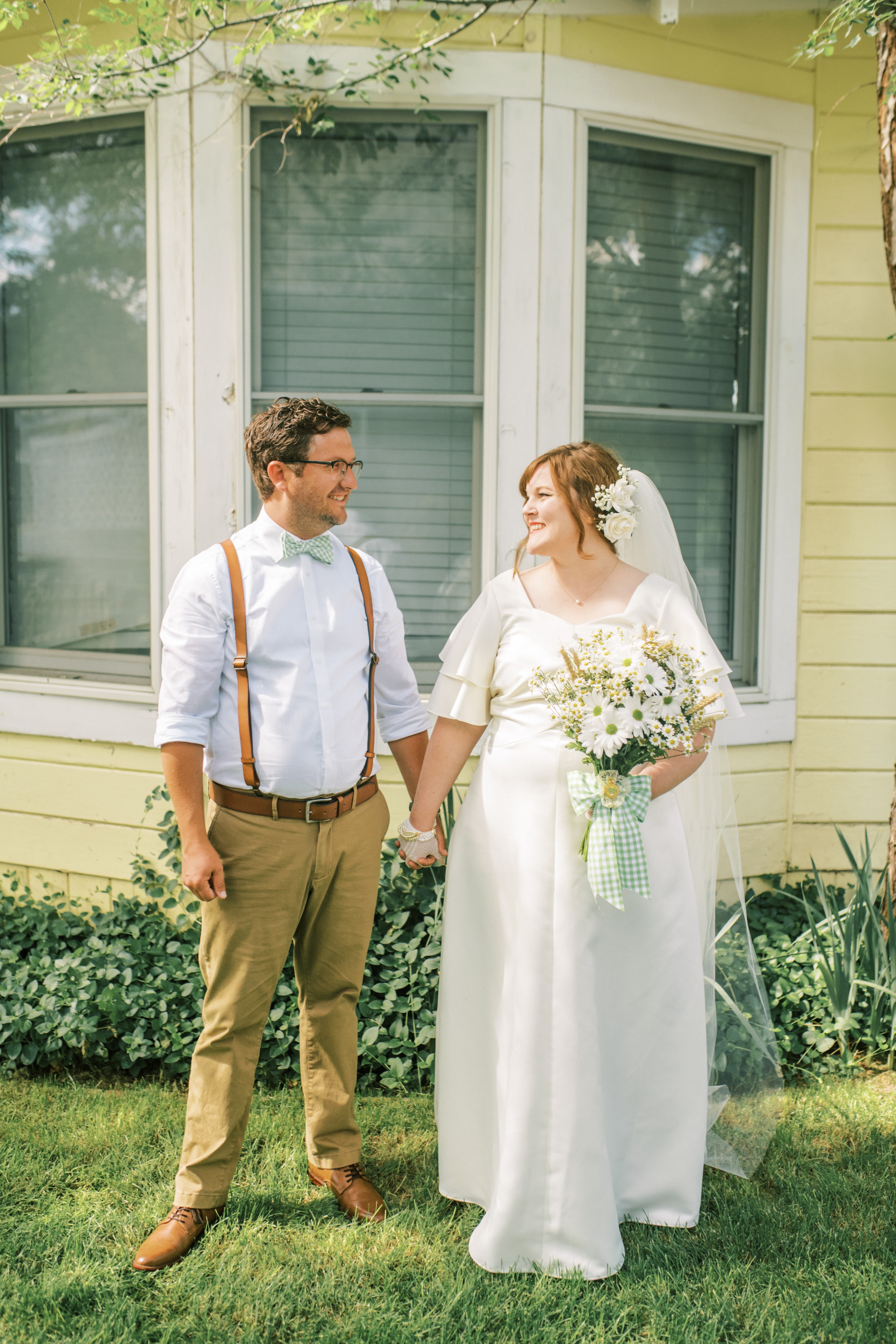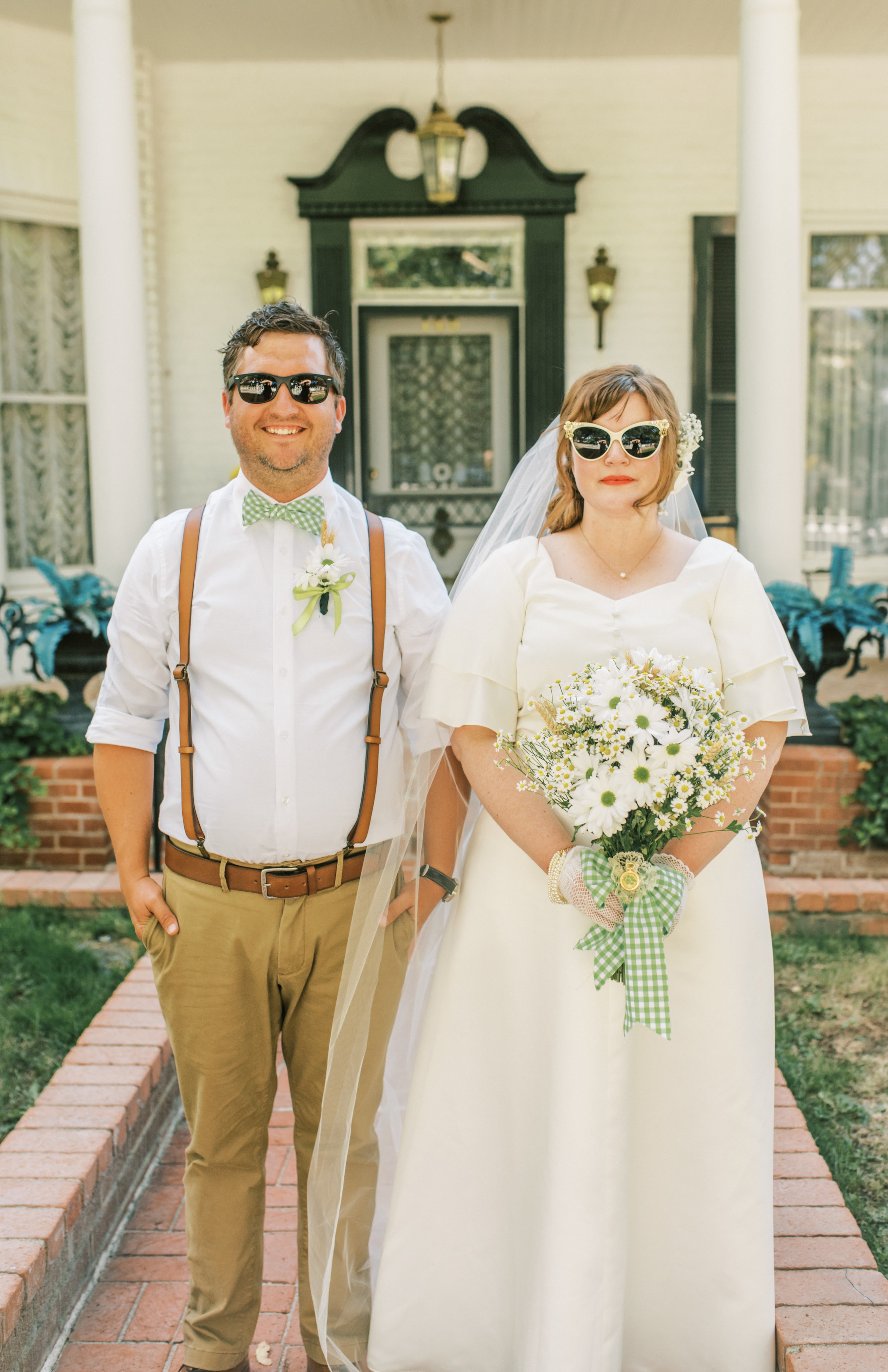 David and I got married on July 1, 2021 in Prescott, Arizona on the front porch of a darling historic yellow home affectionately called The Virginia Dollhouse. It was small and intimate, with only our parents and a few siblings that helped with the wedding: My sister’s boyfriend, Mike, married us, and my sister Shannon did my hair and make-up. The plan was to have a sweet and small wedding and then later have a large reception with family and friends, but for the actual wedding day, I wanted to keep it simple.