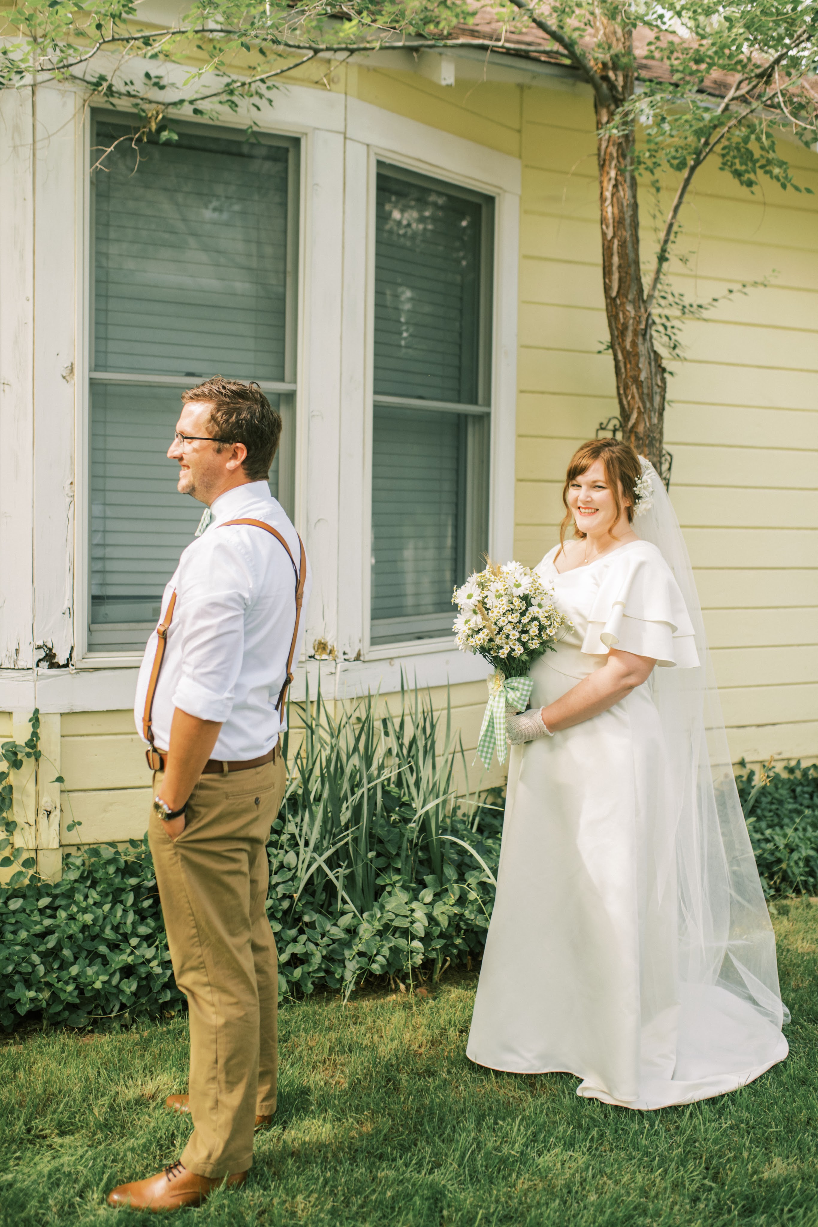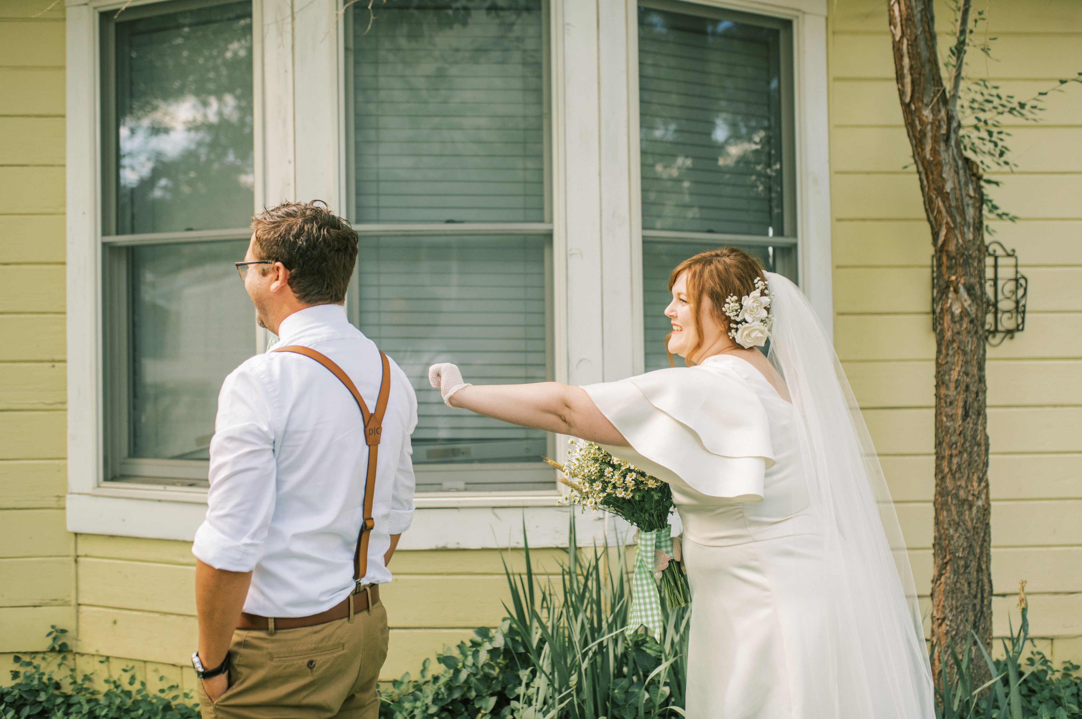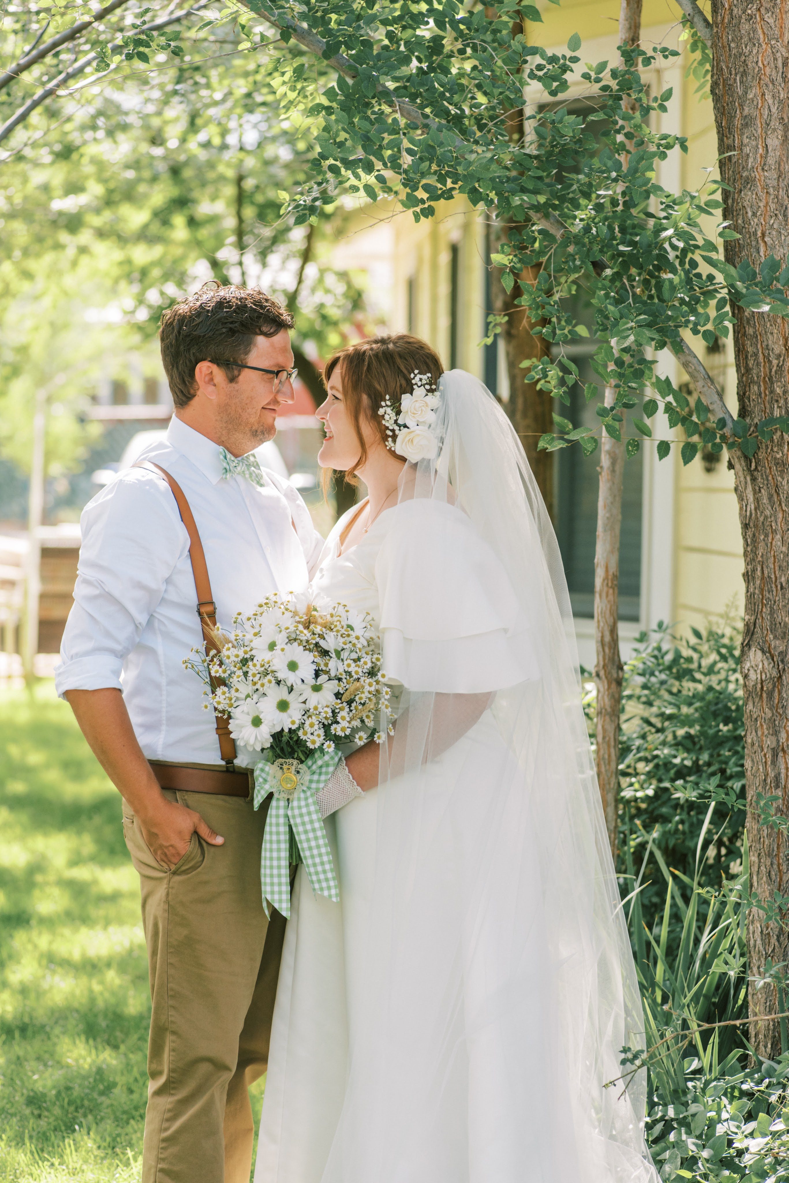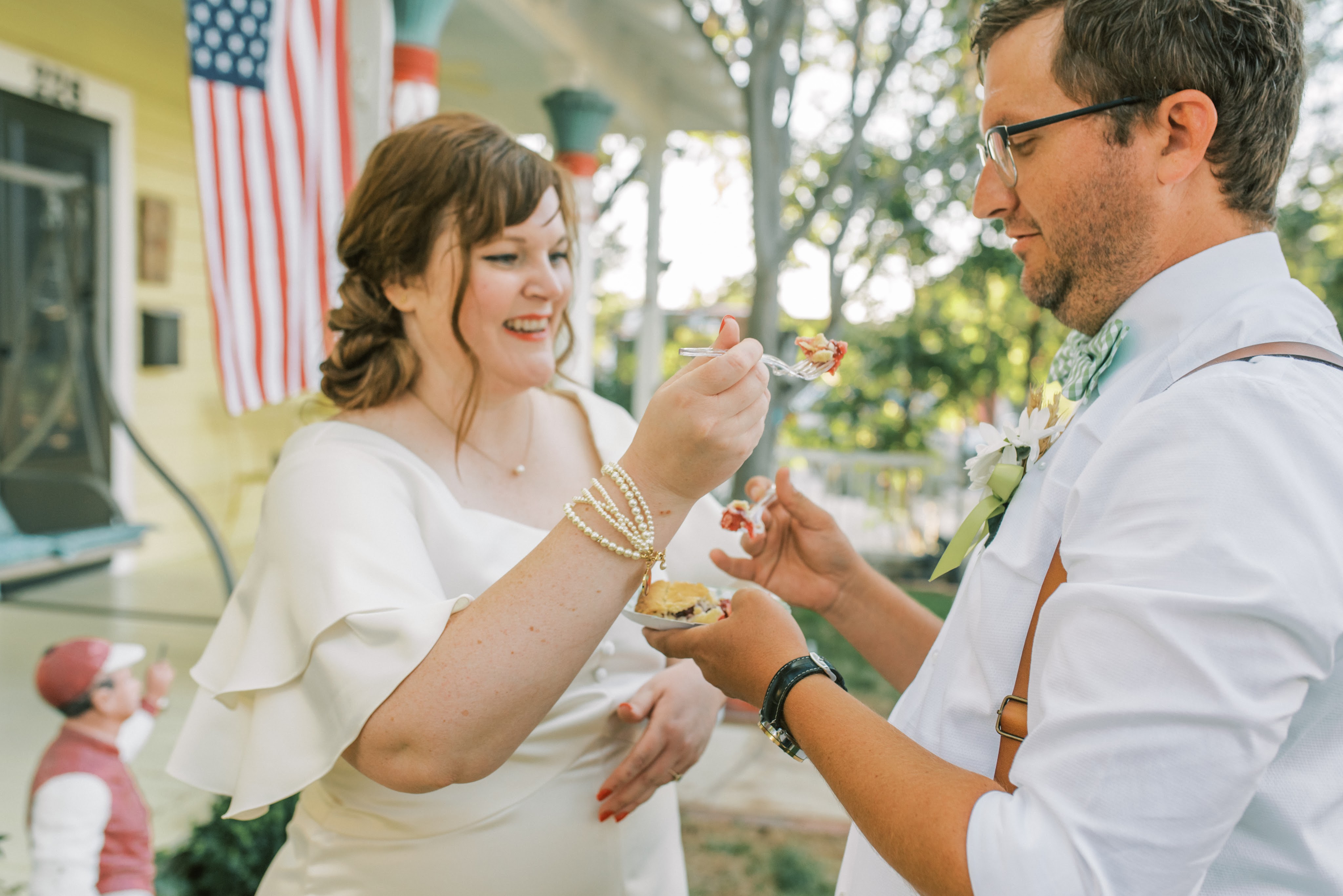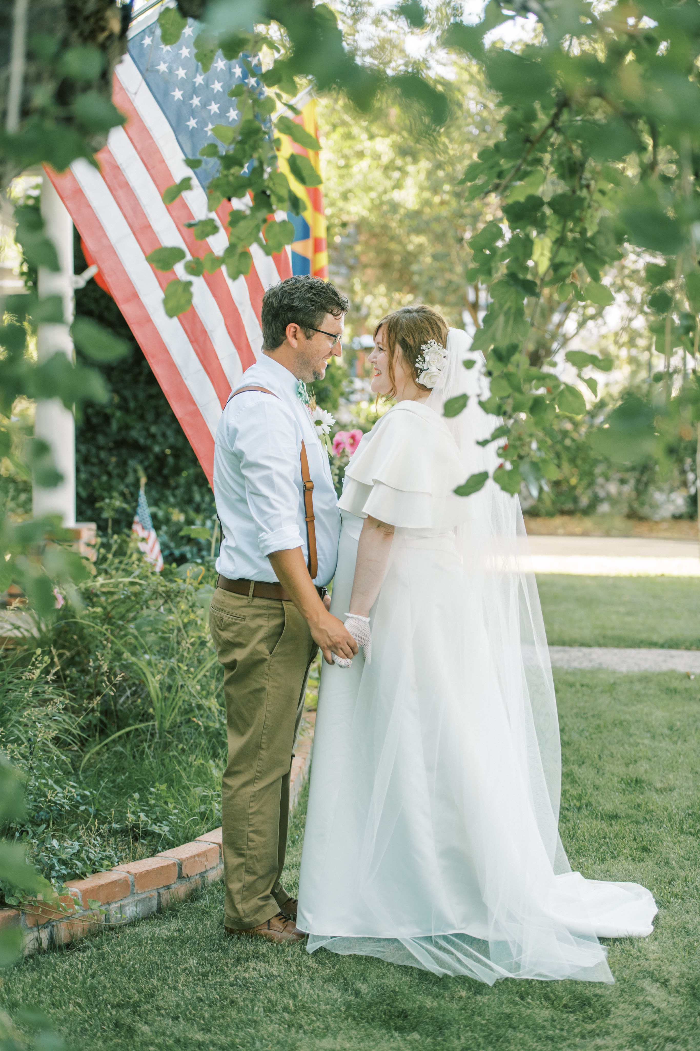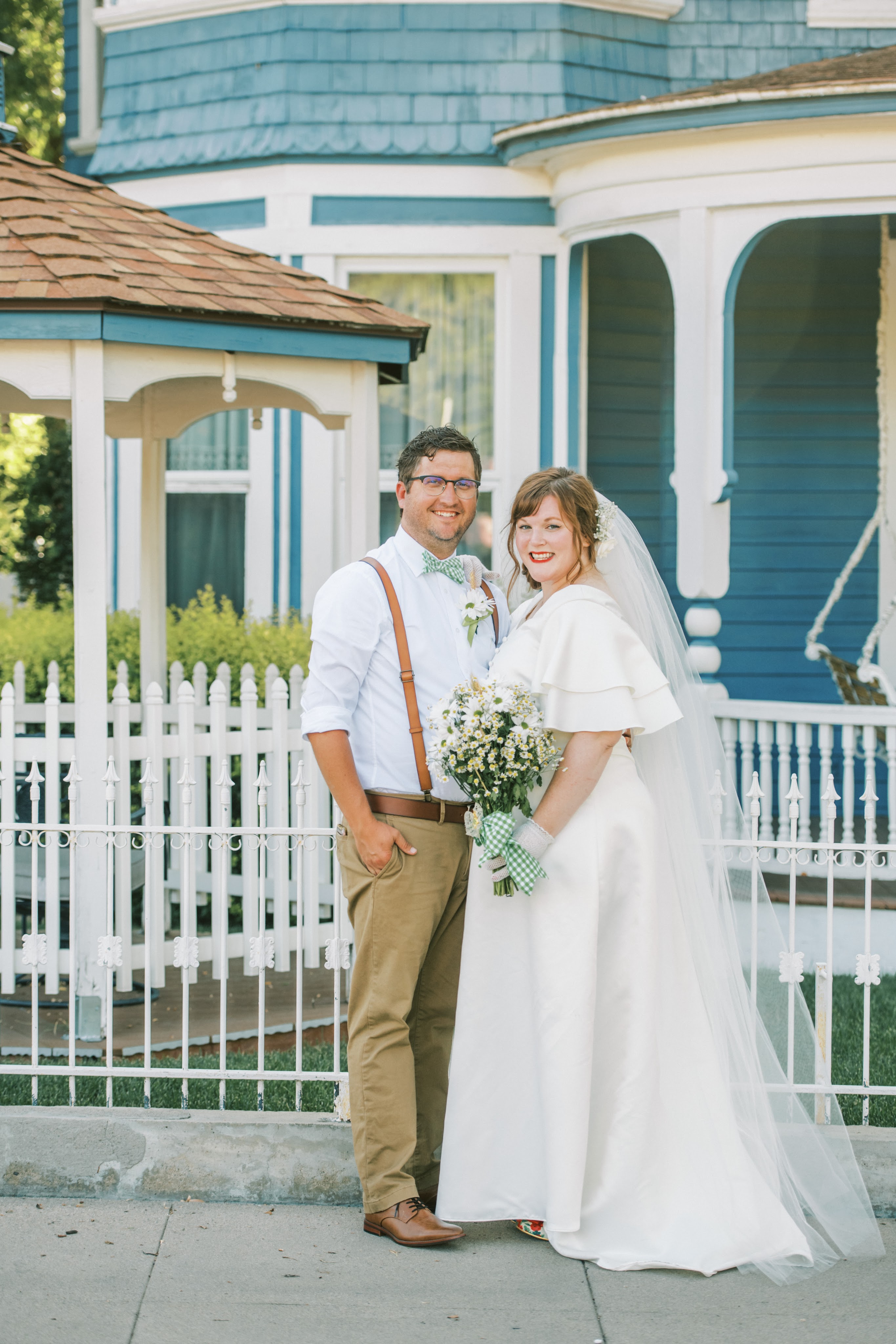 David and I got married on July 1, 2021 in Prescott, Arizona on the front porch of a darling historic yellow home affectionately called The Virginia Dollhouse. It was small and intimate, with only our parents and a few siblings that helped with the wedding: My sister’s boyfriend, Mike, married us, and my sister Shannon did my hair and make-up. The plan was to have a sweet and small wedding and then later have a large reception with family and friends, but for the actual wedding day, I wanted to keep it simple.