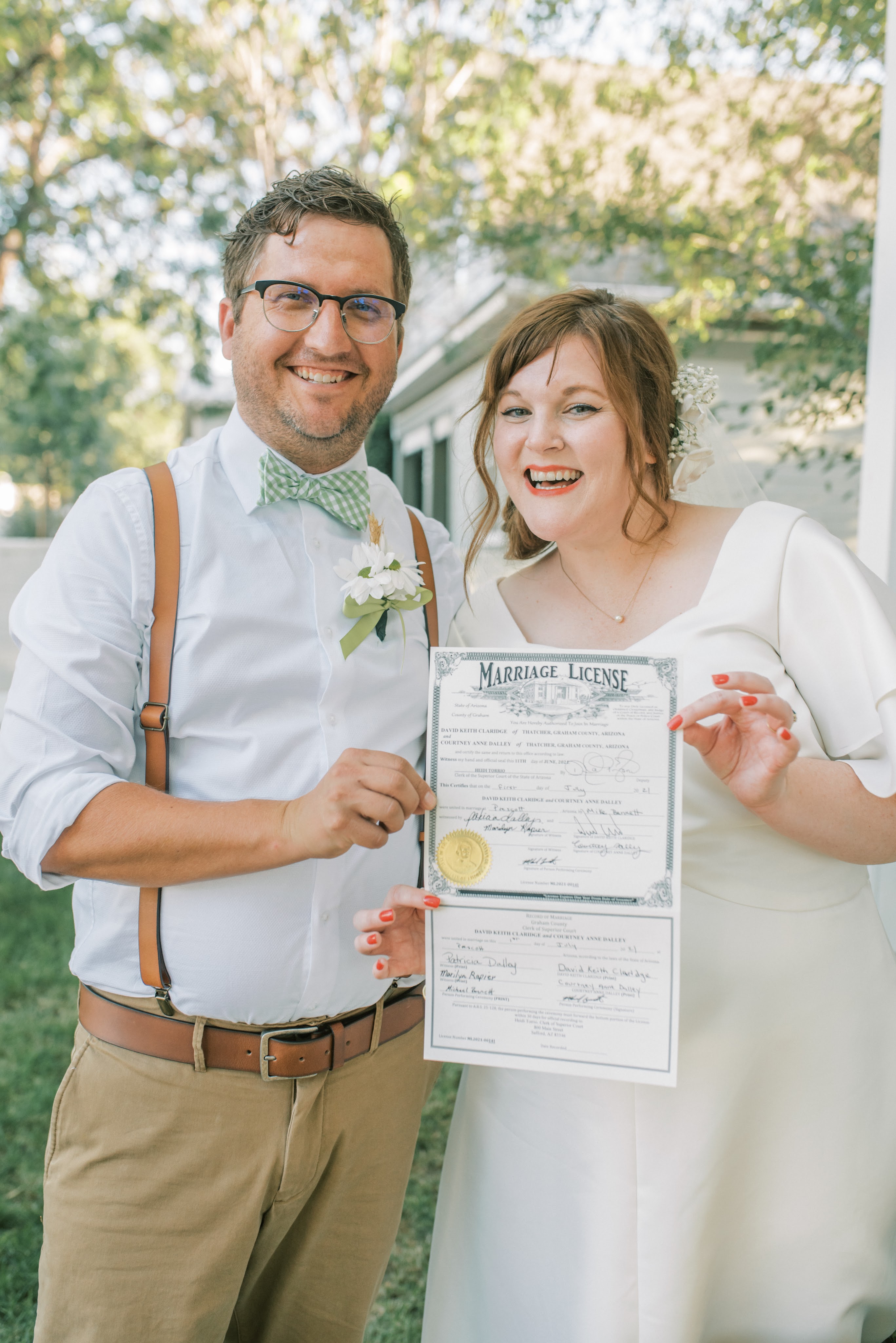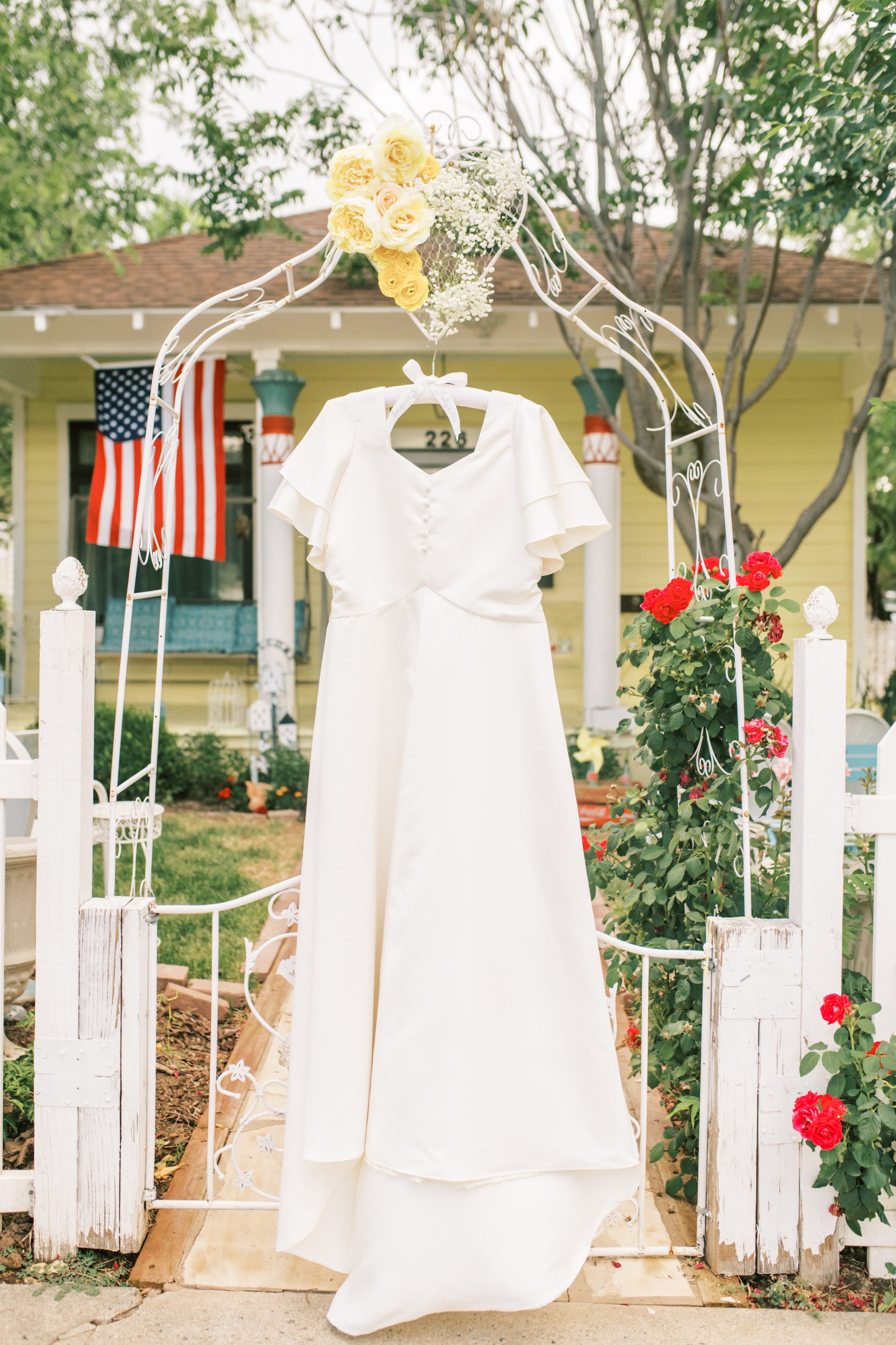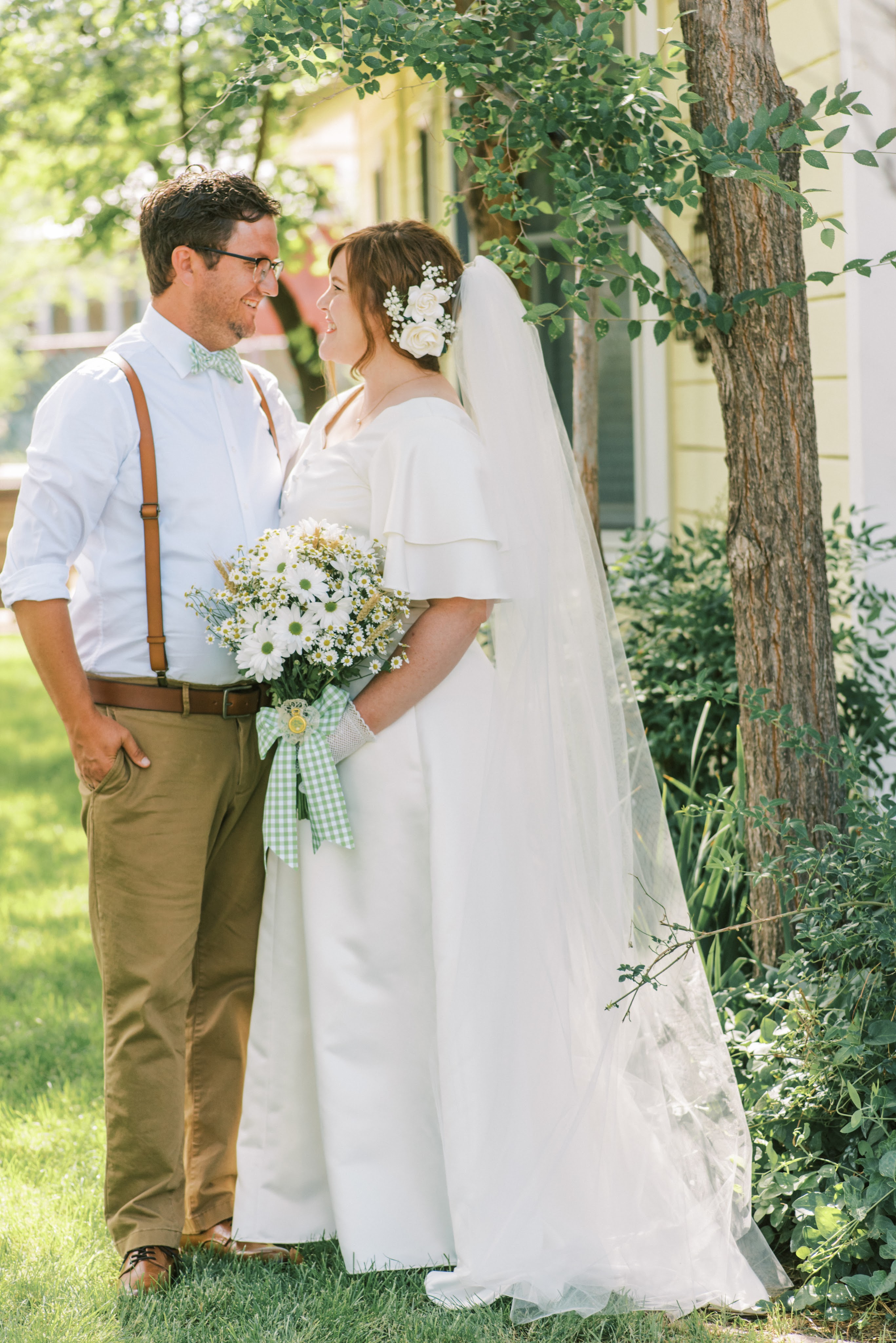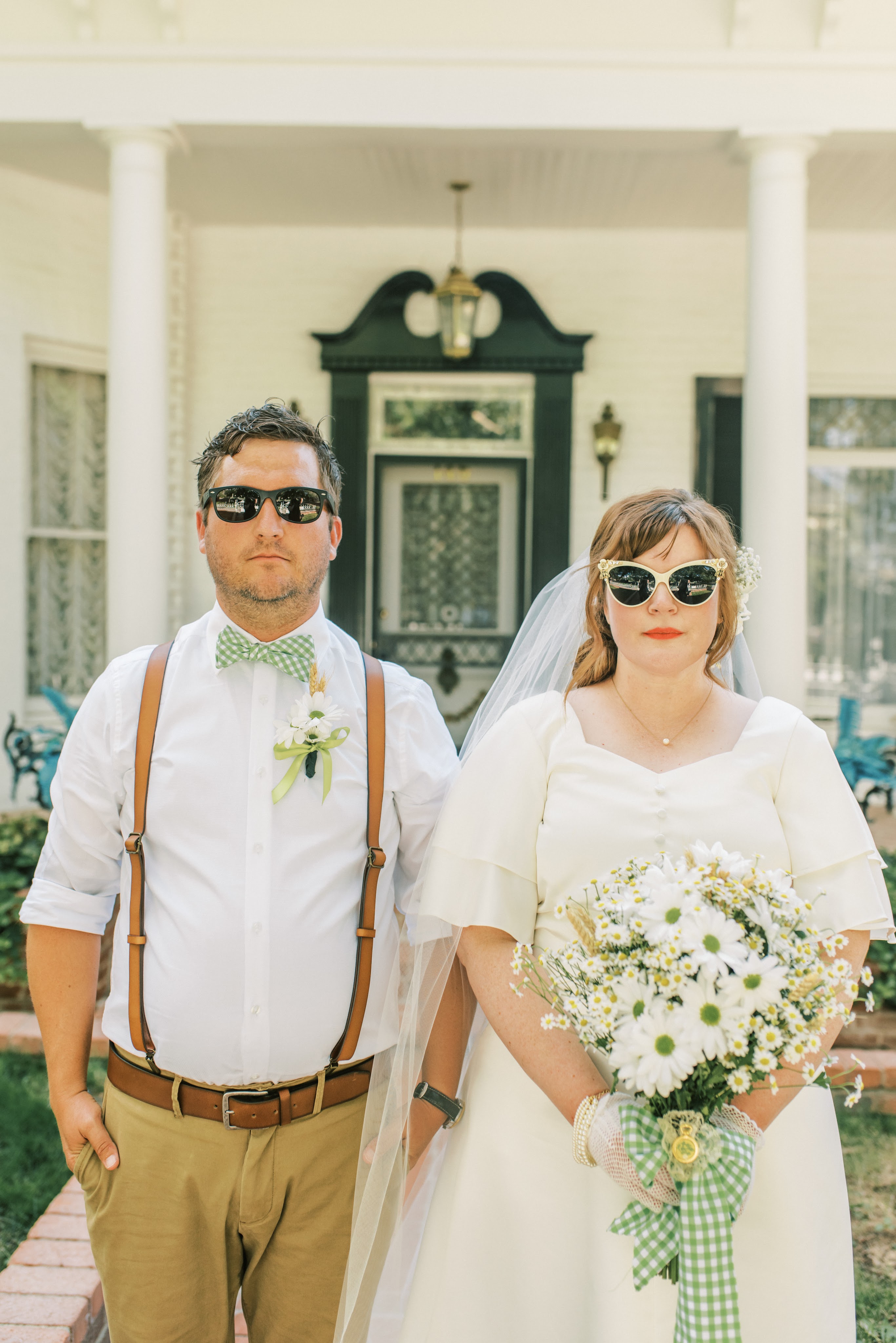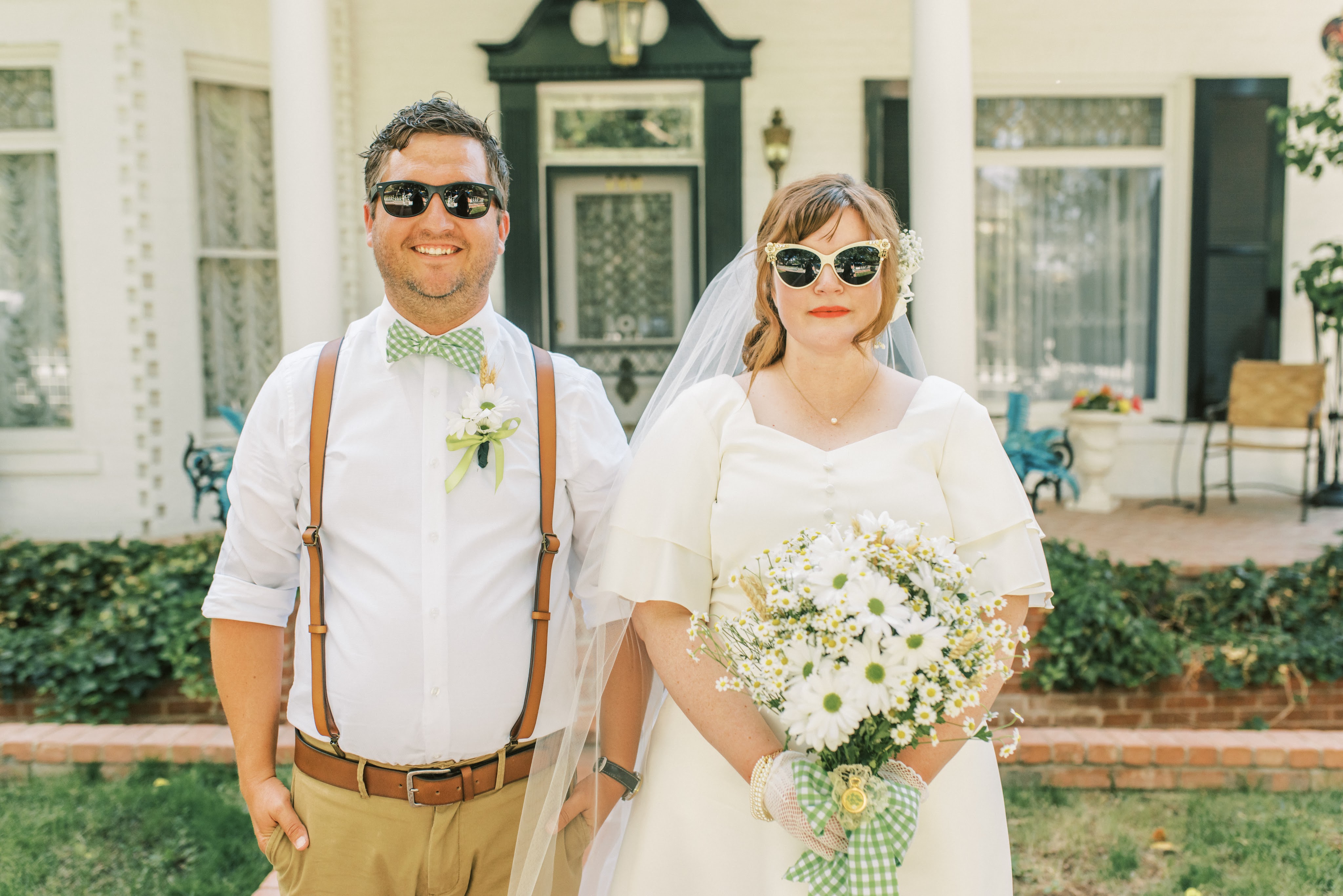 David and I got married on July 1, 2021 in Prescott, Arizona on the front porch of a darling historic yellow home affectionately called The Virginia Dollhouse. It was small and intimate, with only our parents and a few siblings that helped with the wedding: My sister’s boyfriend, Mike, married us, and my sister Shannon did my hair and make-up. The plan was to have a sweet and small wedding and then later have a large reception with family and friends, but for the actual wedding day, I wanted to keep it simple.