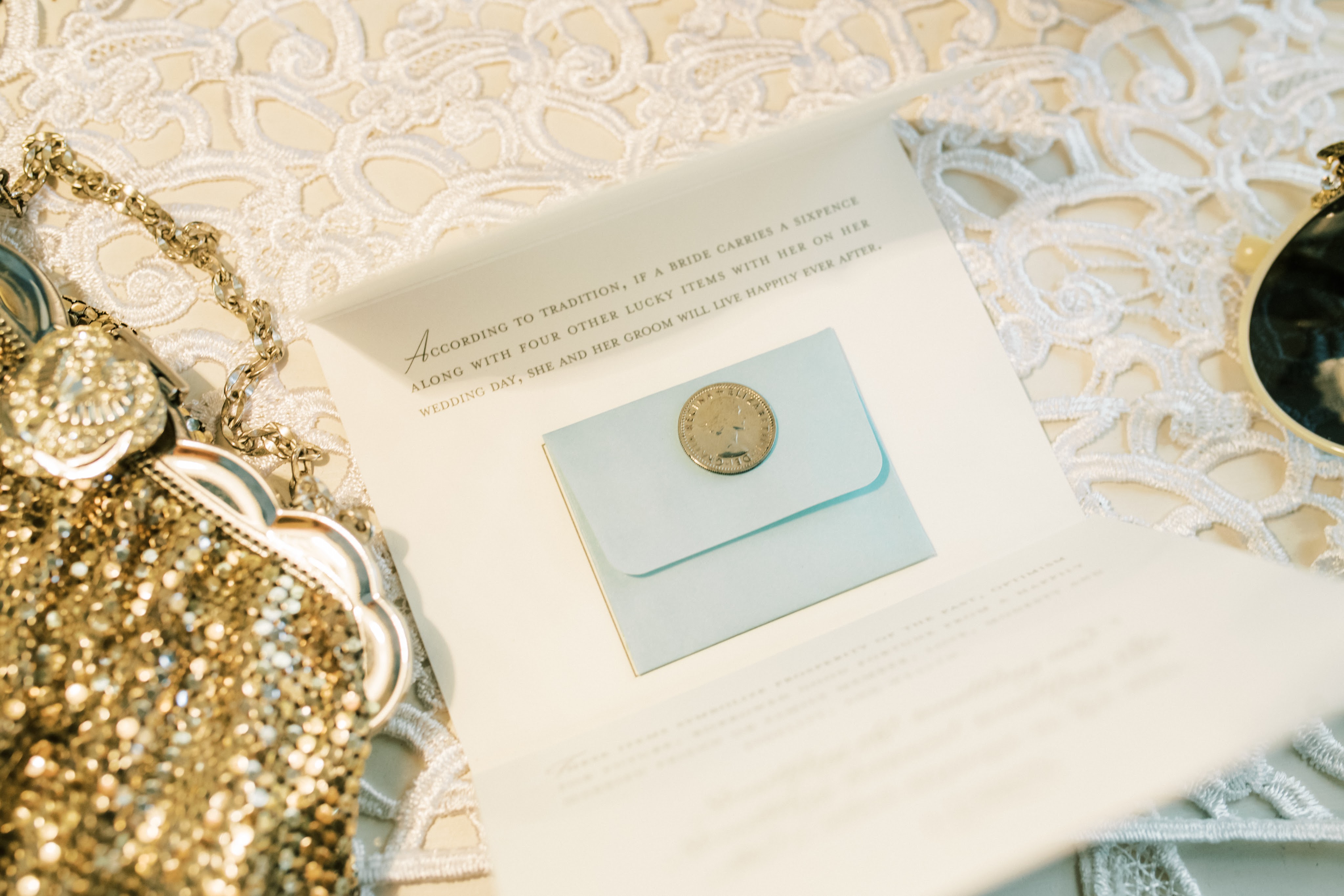 Since I’m a raging Anglophile, I really wanted an actual British sixpence which I found this beautiful keepsake piece along with an actual British sixpence from The Knot.
