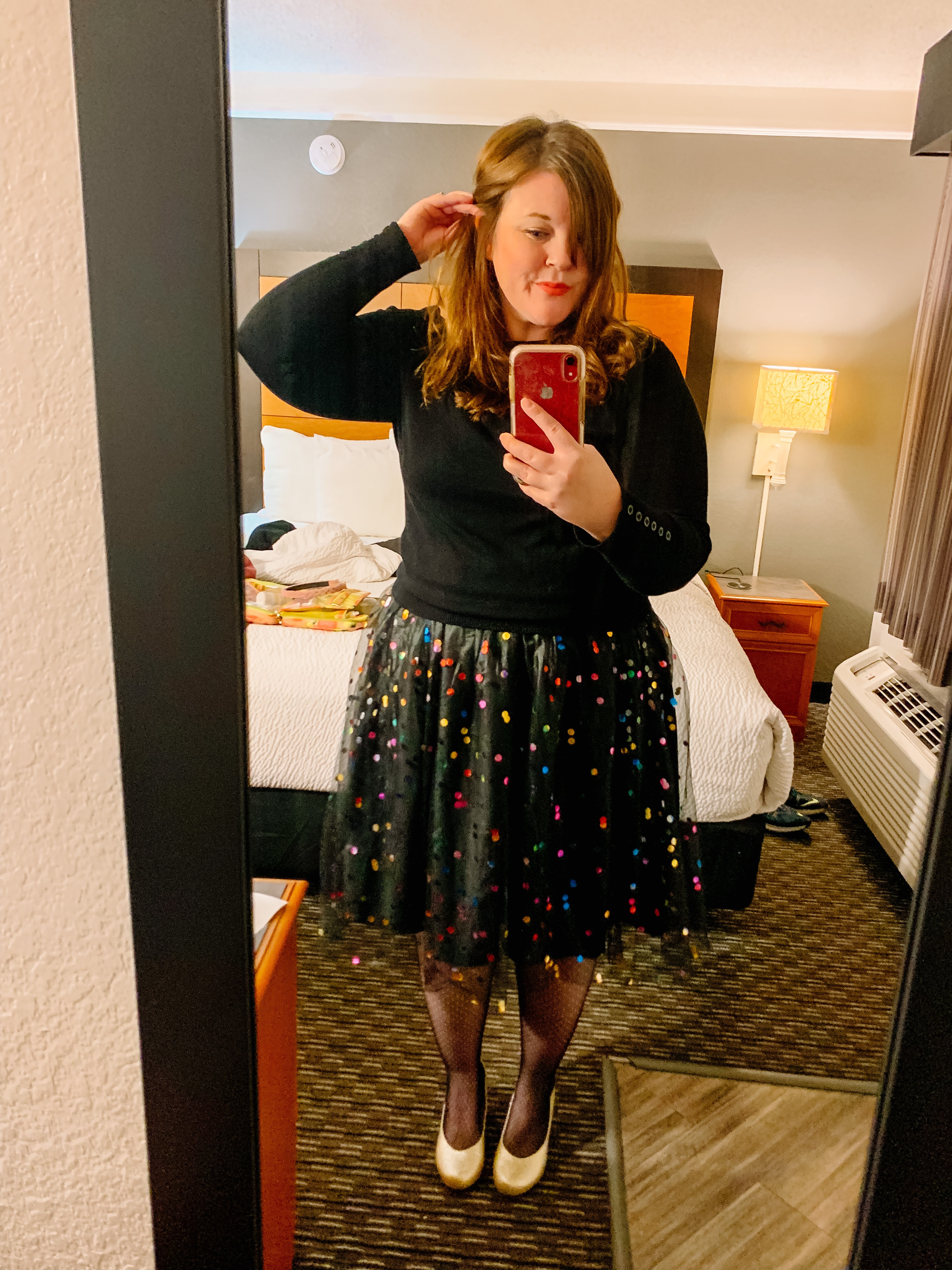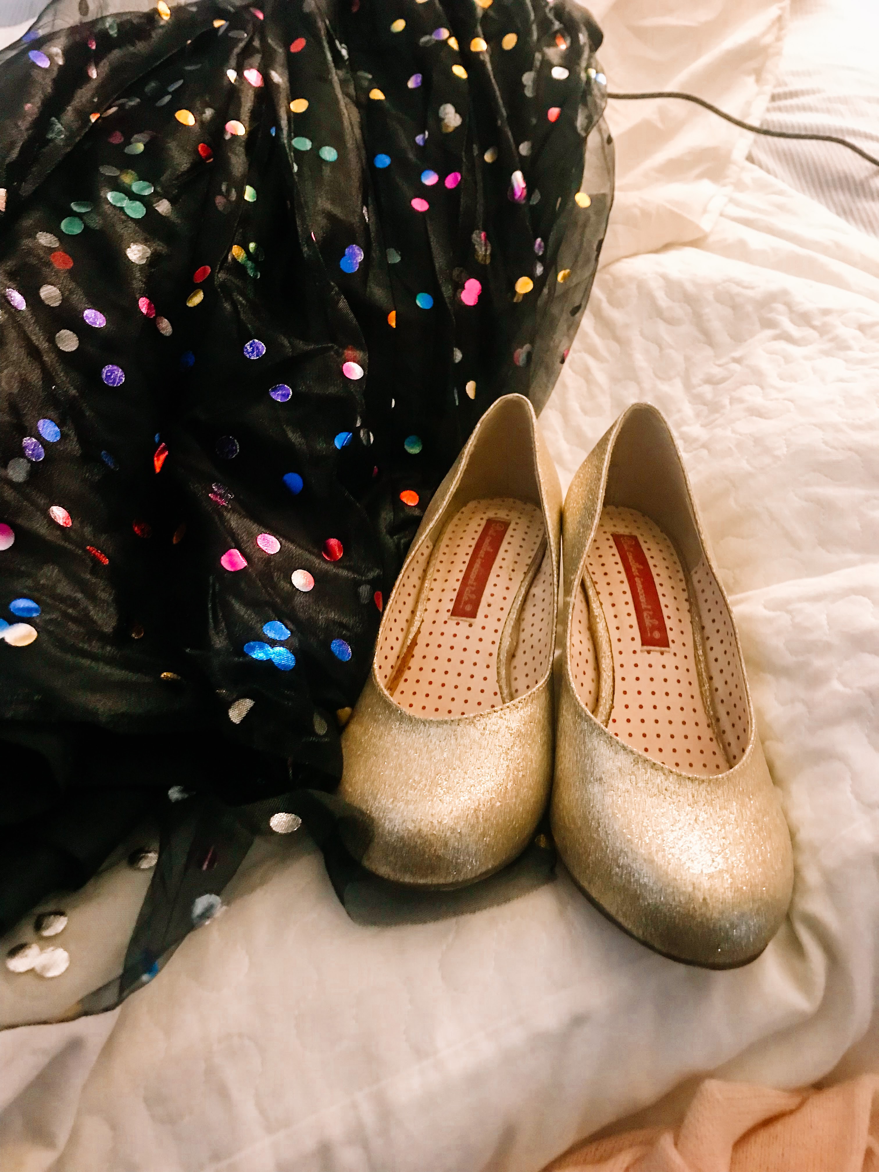 - I bought a sparkly skirt for the occasion, along with a dorky headband and brought my sparkly heels.
