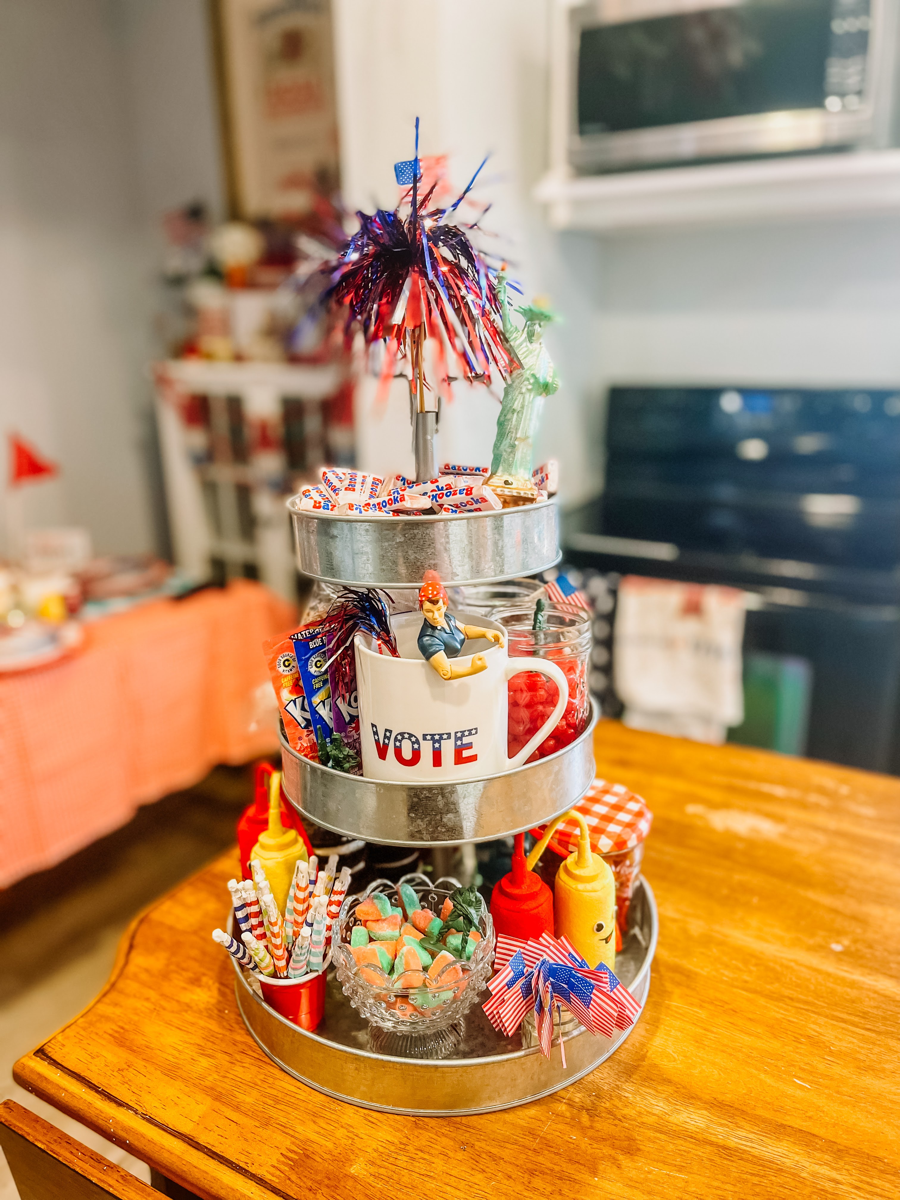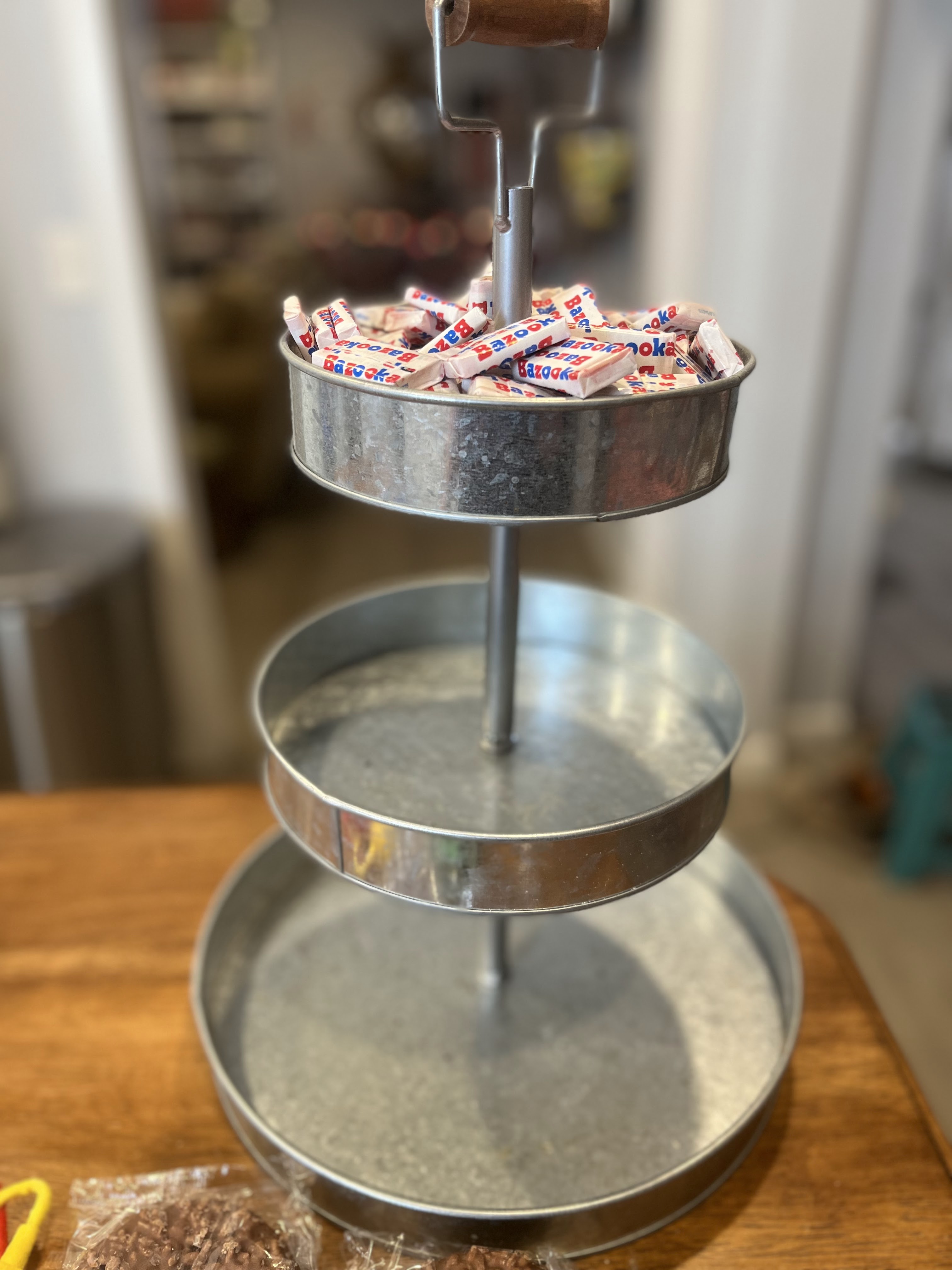 My kitchen tier tray! I love decorating our tier tray for every holiday. I like filling it with little quirky decor pieces but mostly, I love throwing in a bunch of seasonal candy and treats. David and I like to snack on some fun holiday snacks here and there which is just fun. Mostly an excuse to buy seasonal candy which as you may know, I looooove.