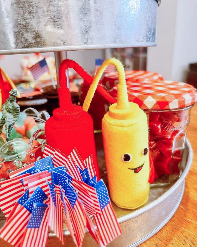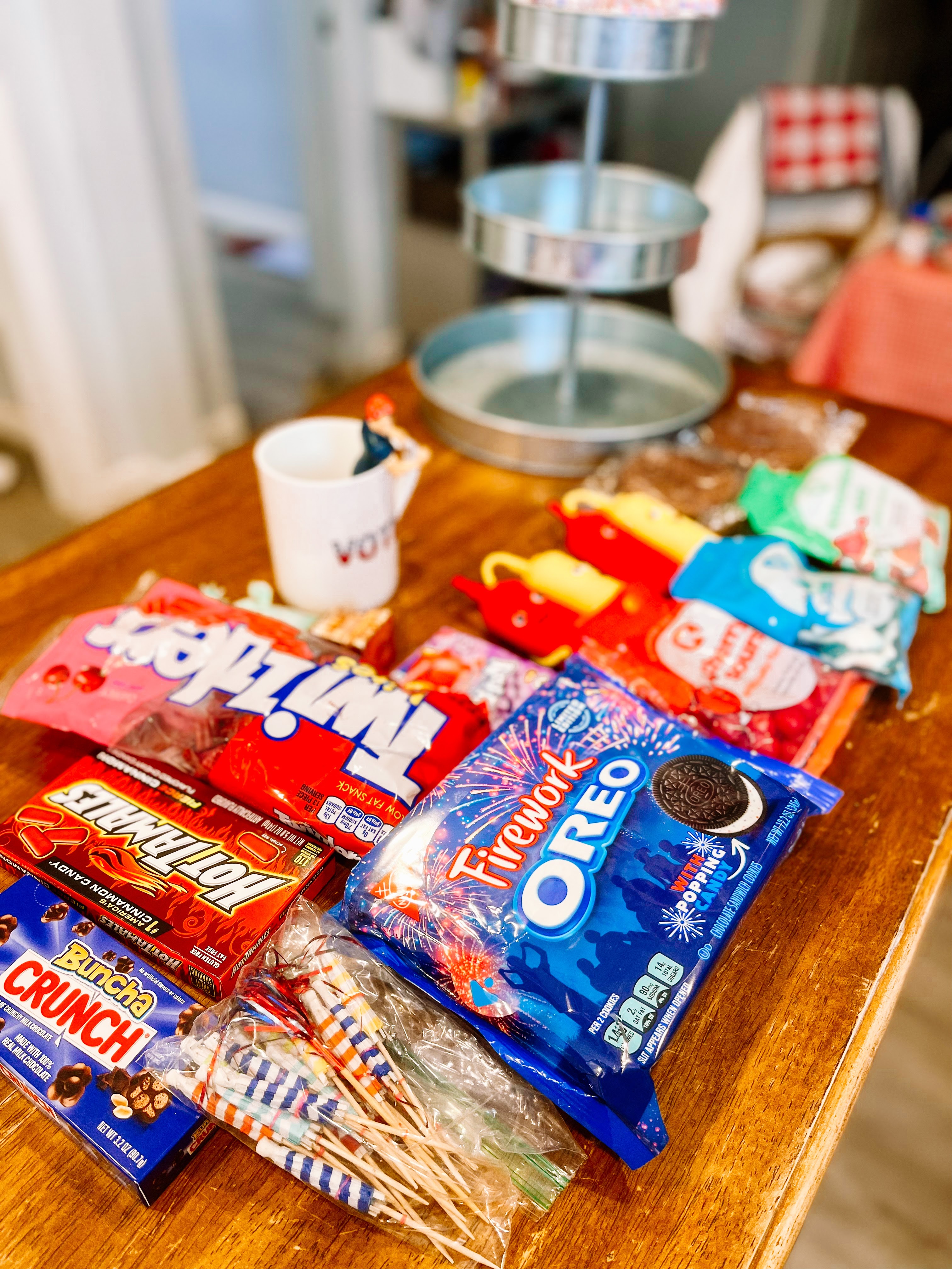 This year we got Koolaid packets, cherry sours, watermelon licorice, Twizzler licorice bites, watermelon dummies, these amazing firecracker Oreos (they had pop rock candy in the cream center. Umm YES) gummy sharks, and Hot Tamales. And for our Little Debbie bit (you must have Little Debbie seasonal sweets. You must. It’s the law) we had Star Crunch cookies. I threw in some green army men here and there and cocktail flags along with these new ketchup/mustard figurines from Target that I love so much I bought TWO.