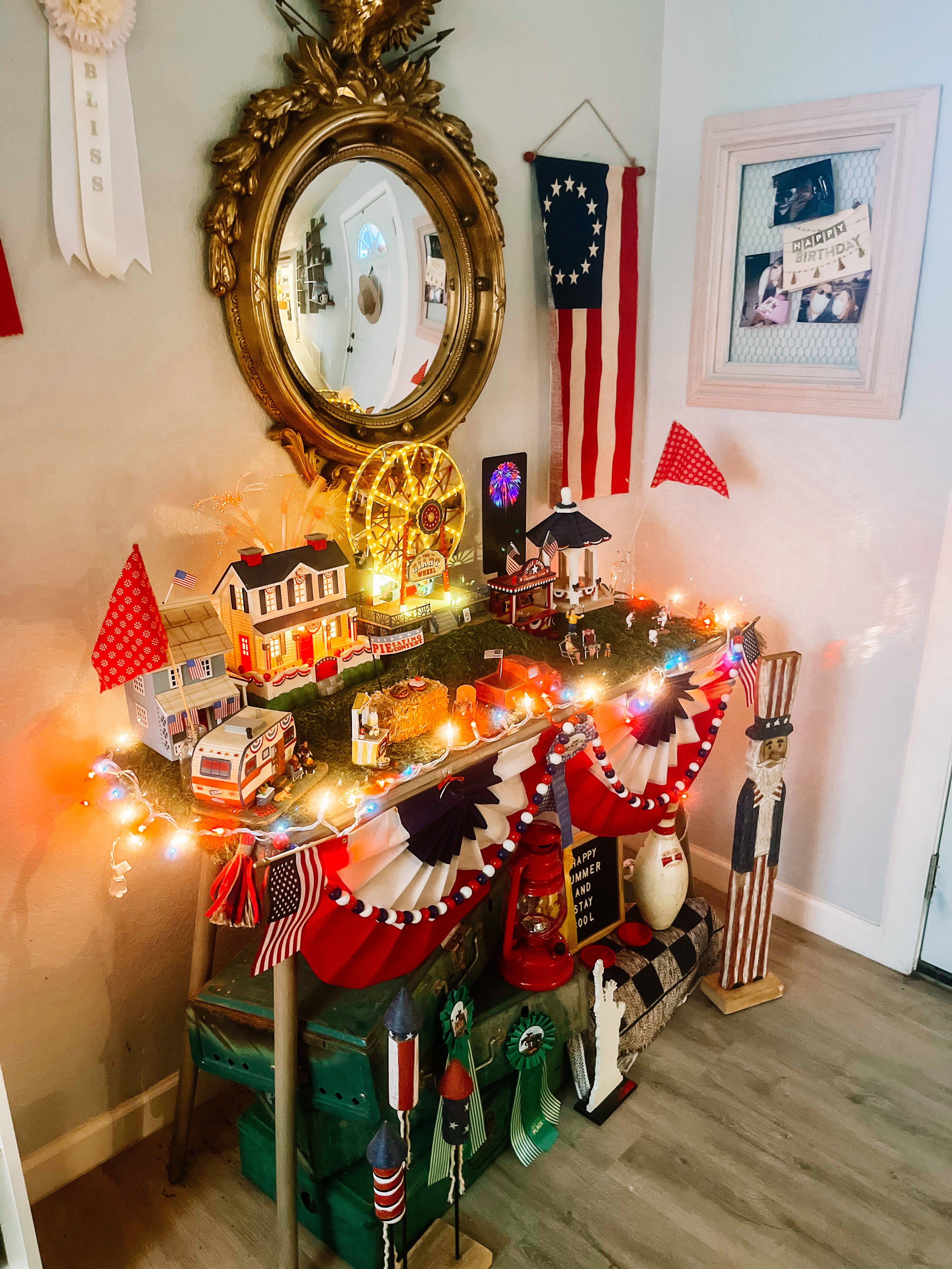 My 4th of July village! Yesssss this was a Covid 19 impulse buy. But I have absolutely no regrets. I plan to add to It every year. This year I found an adorable red and blue birdhouse that looks like an actual house. Sold!