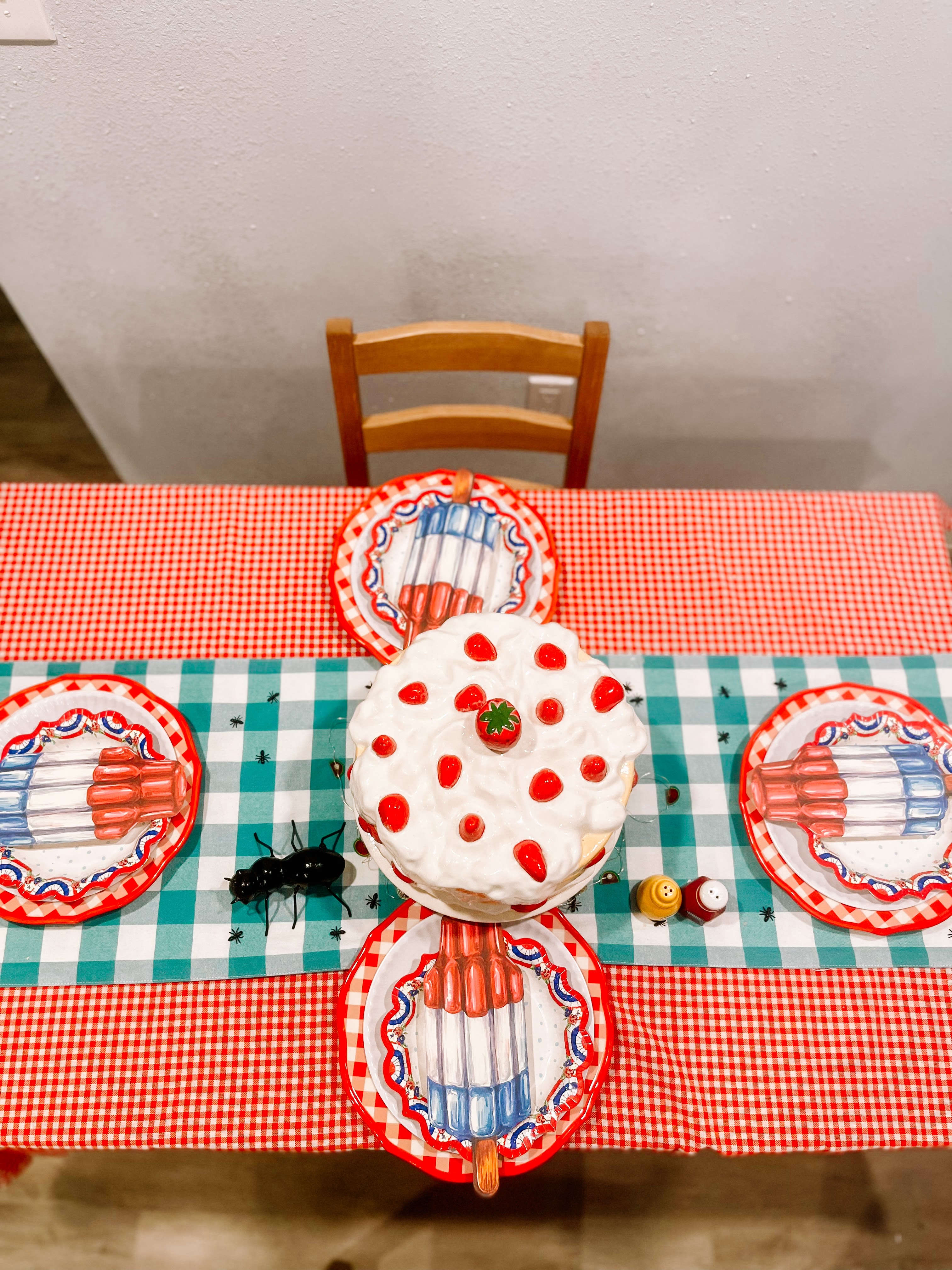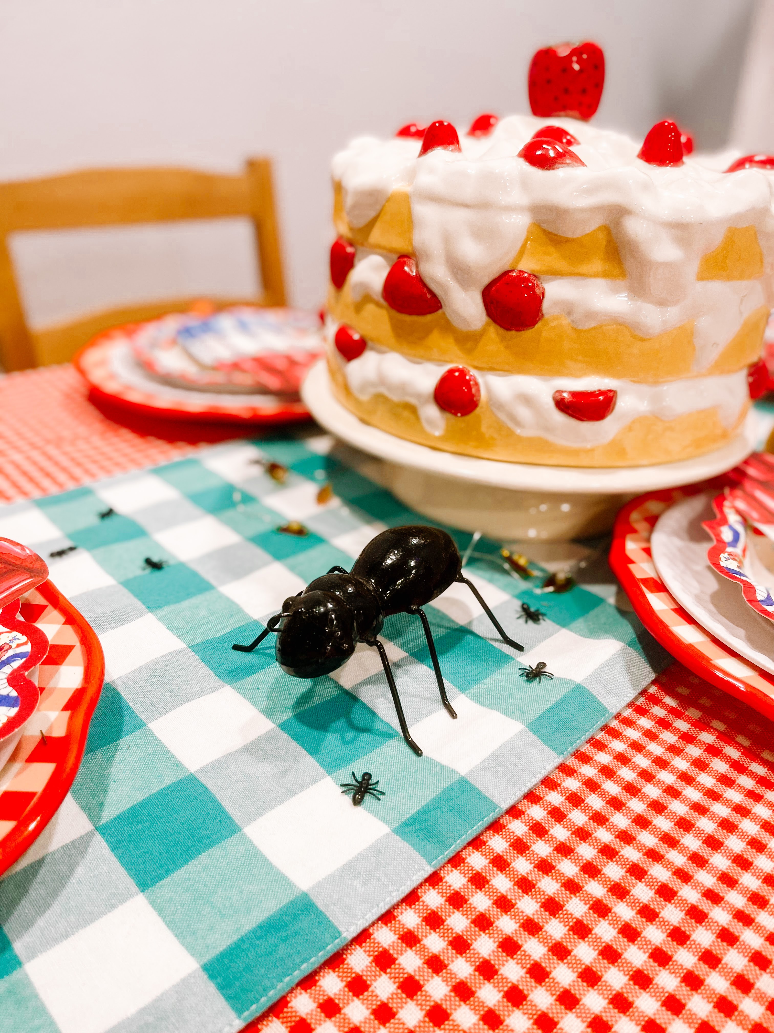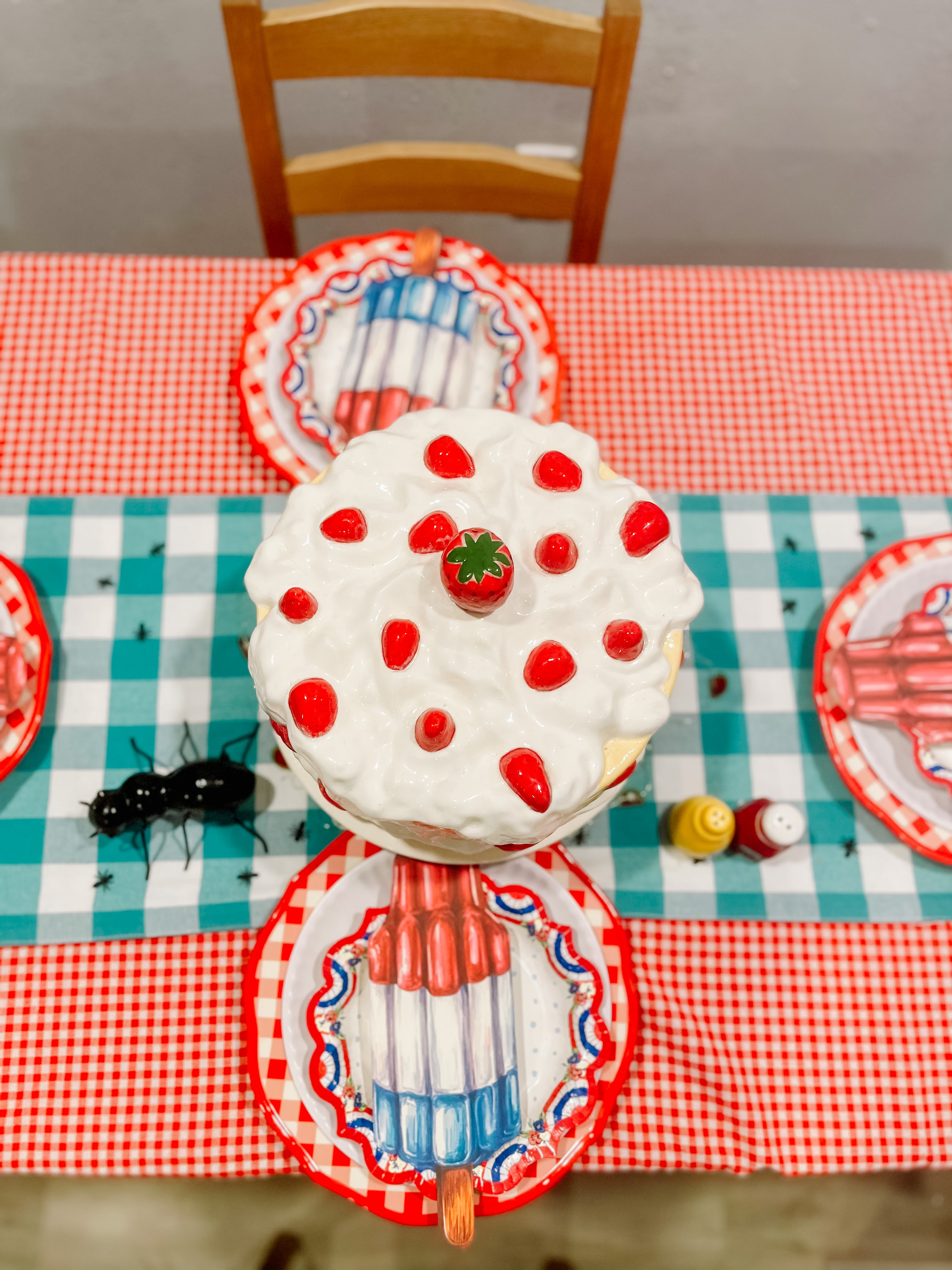 My little patriotic tablescape. Okay our table is pretty small. The THINGS I could I do with a bigger table but this is where we’re at right now. My favorite part are the bomb pops and the mini ants I sprinkled over the gingham tablecloth.