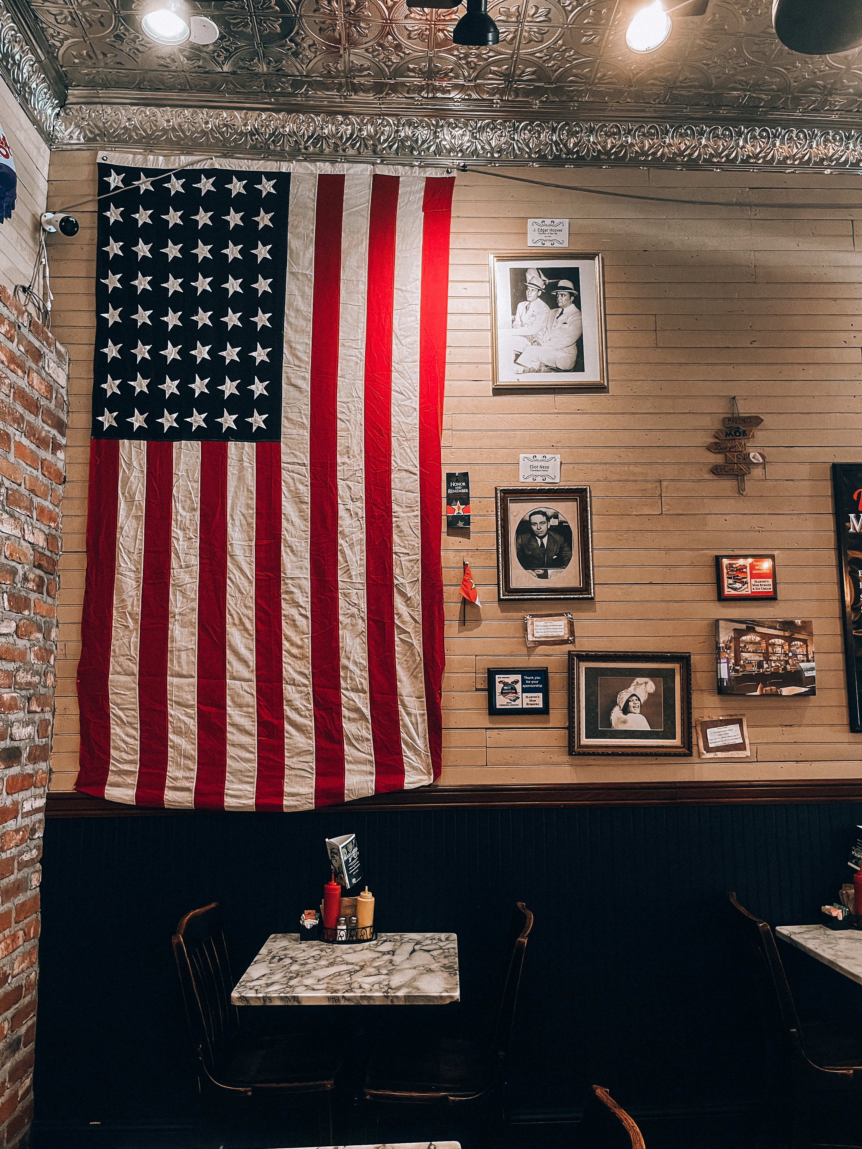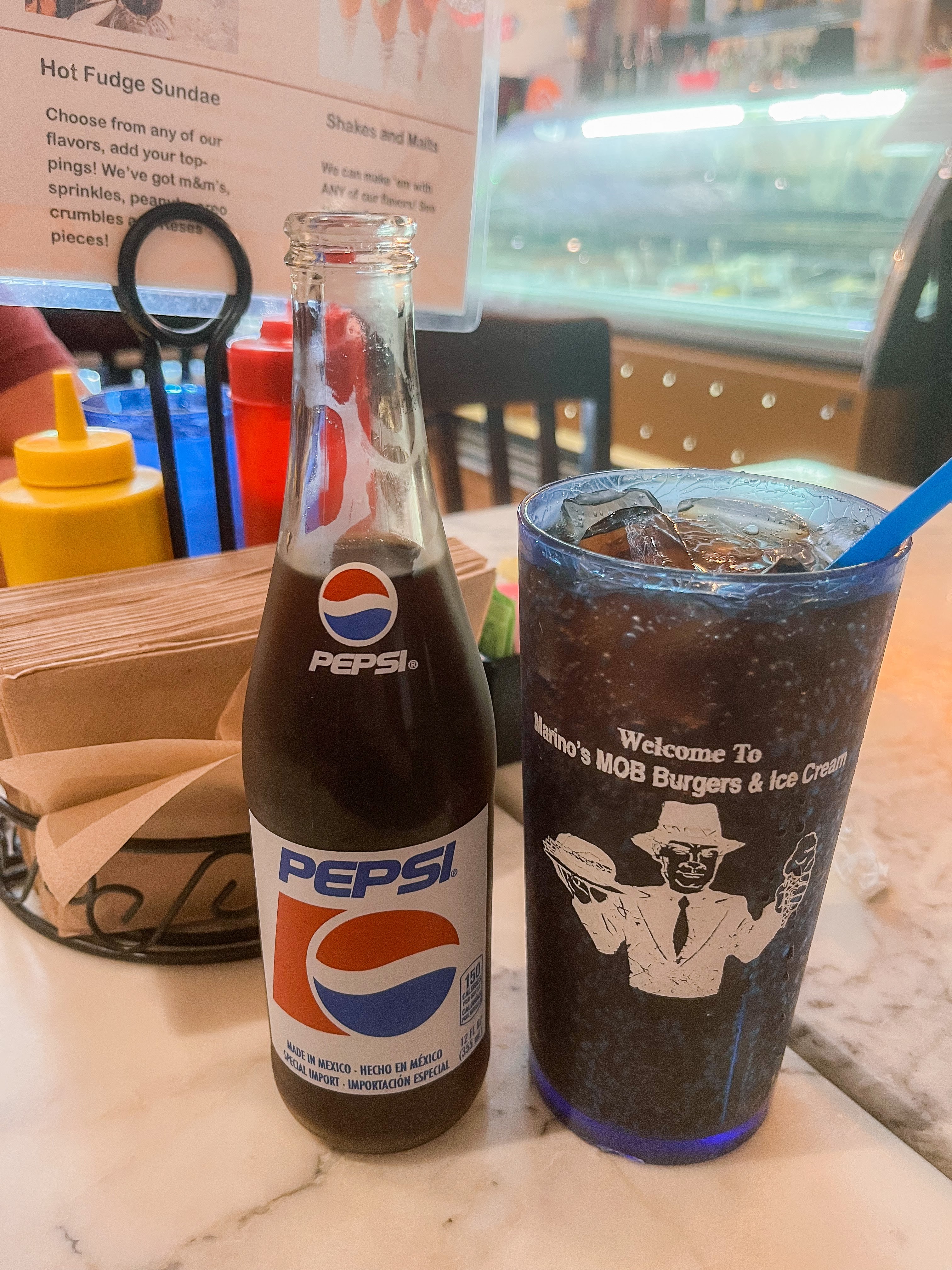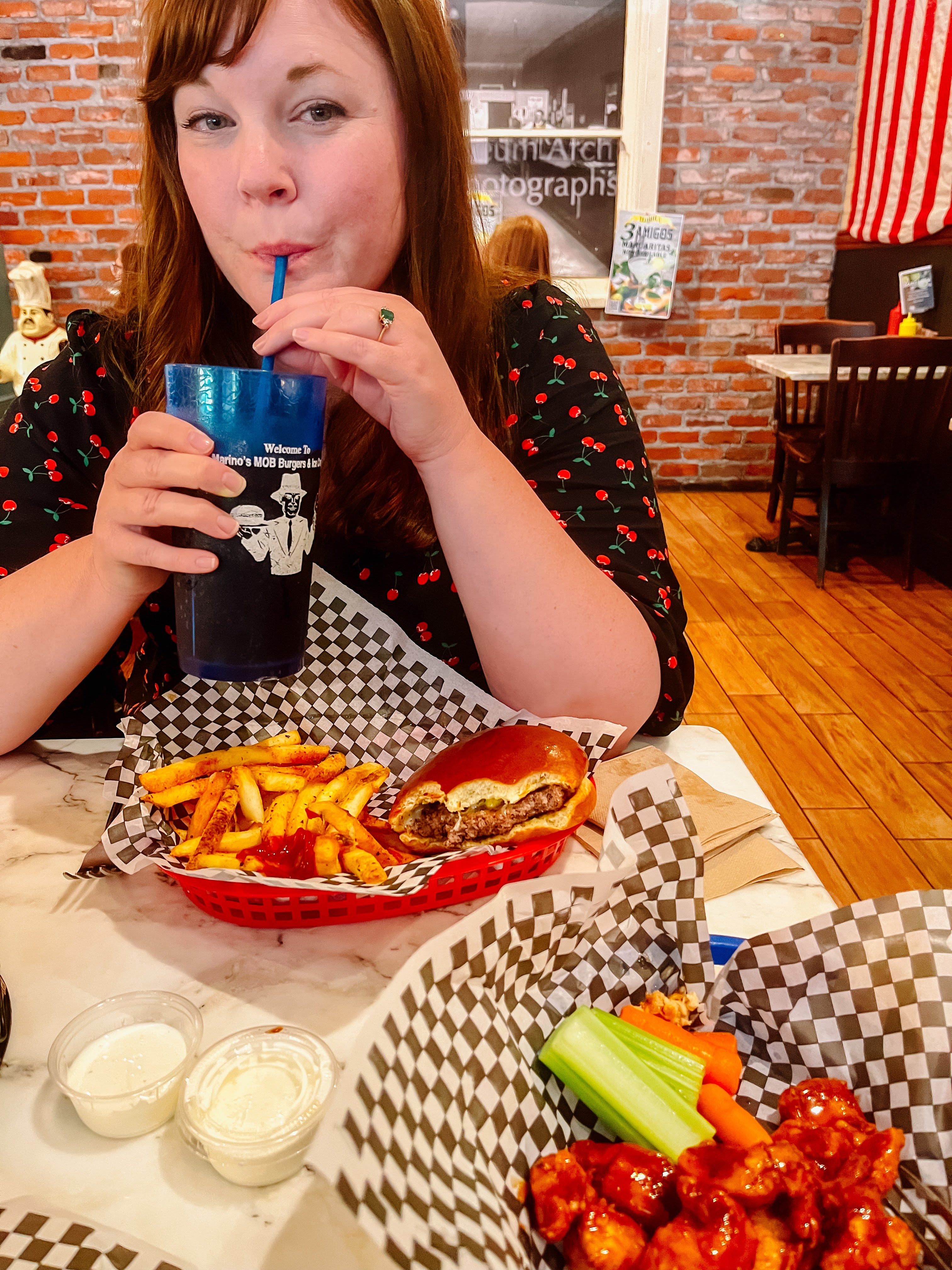 We wandered over to Marino’s Mob Burgers right off the square for some din din. I love this burger place, it’s mafia themed and the servers dress up like flappers and the entire menu has 1920’s gangster names like “tommy gun milkshake” or “sleepin’ with the fishes and chips.”