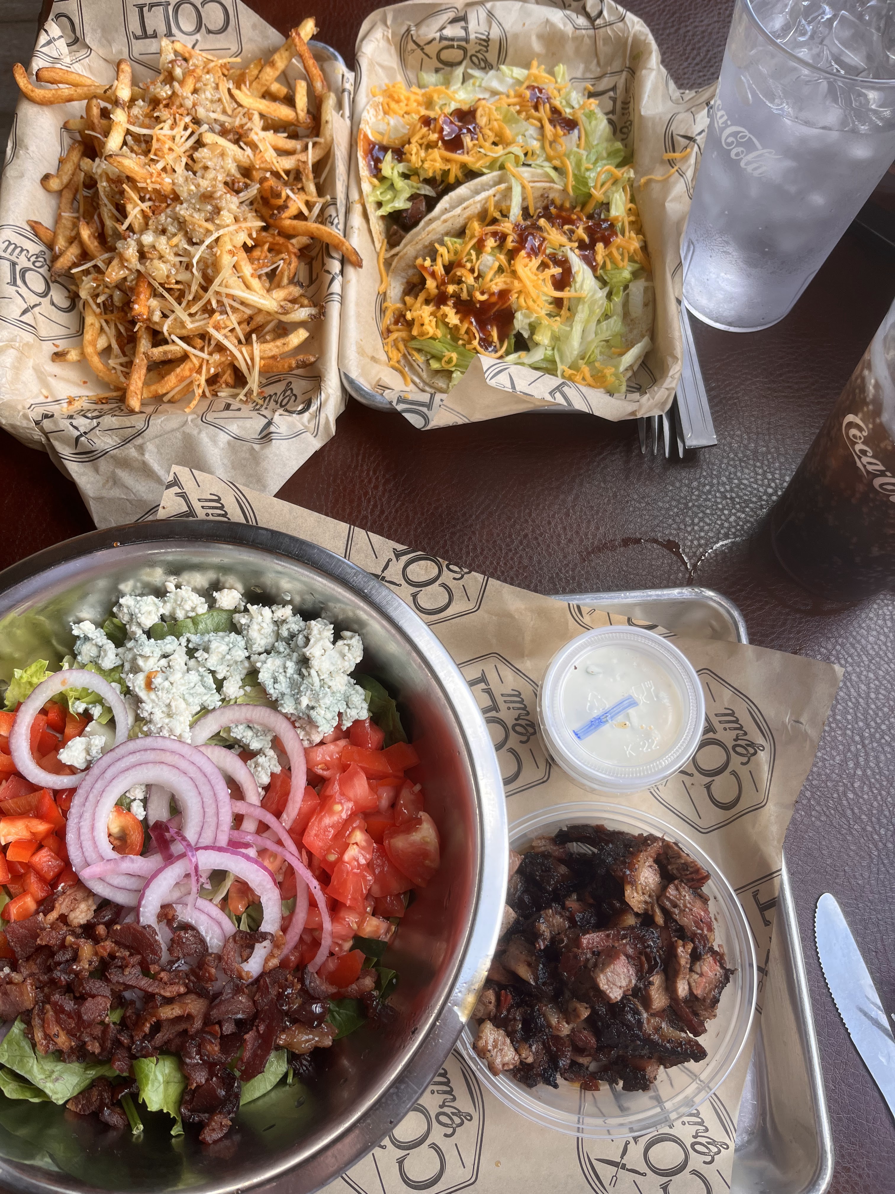 David got the brisket tacos and butter garlic fries and I got the Cobb salad with brisket.