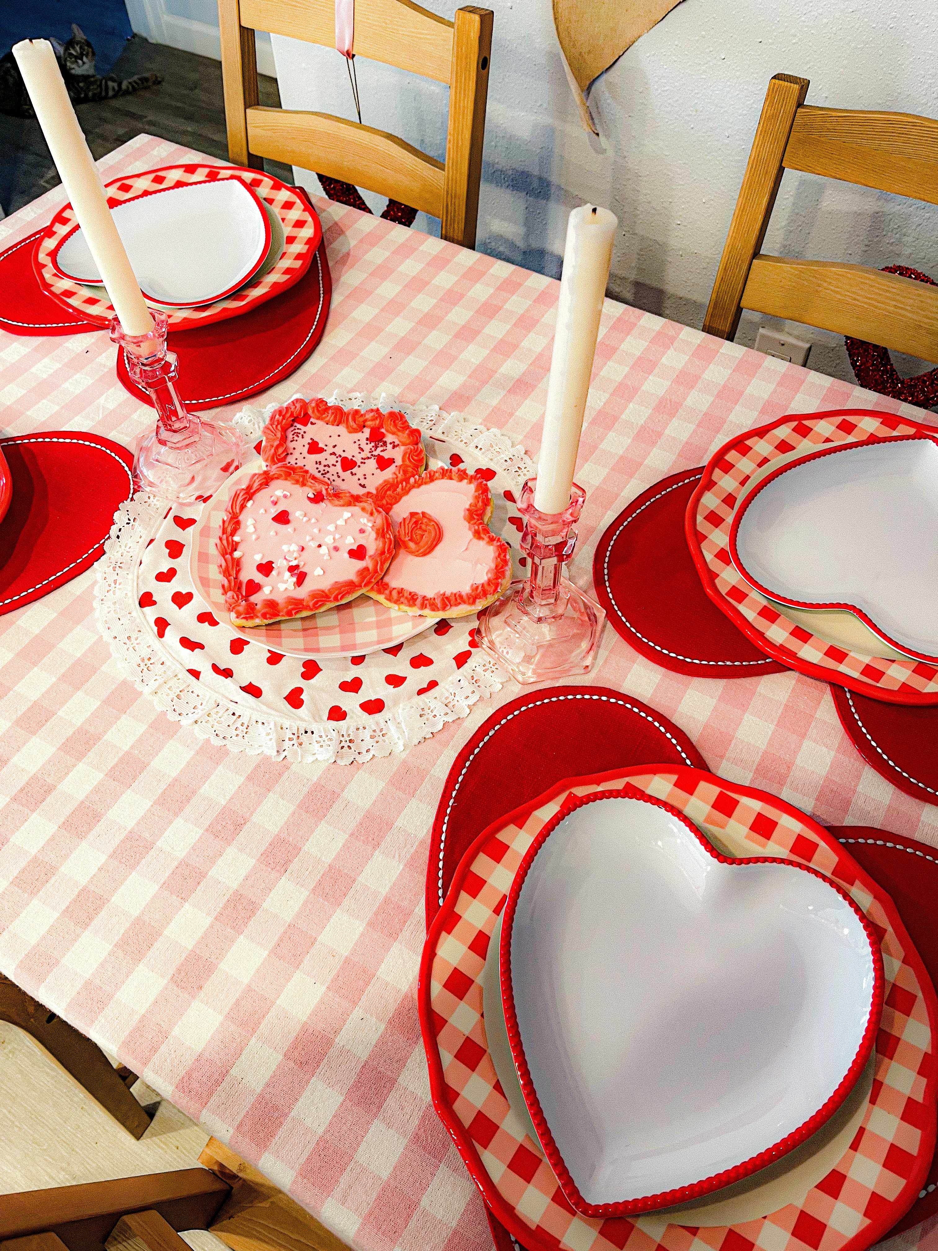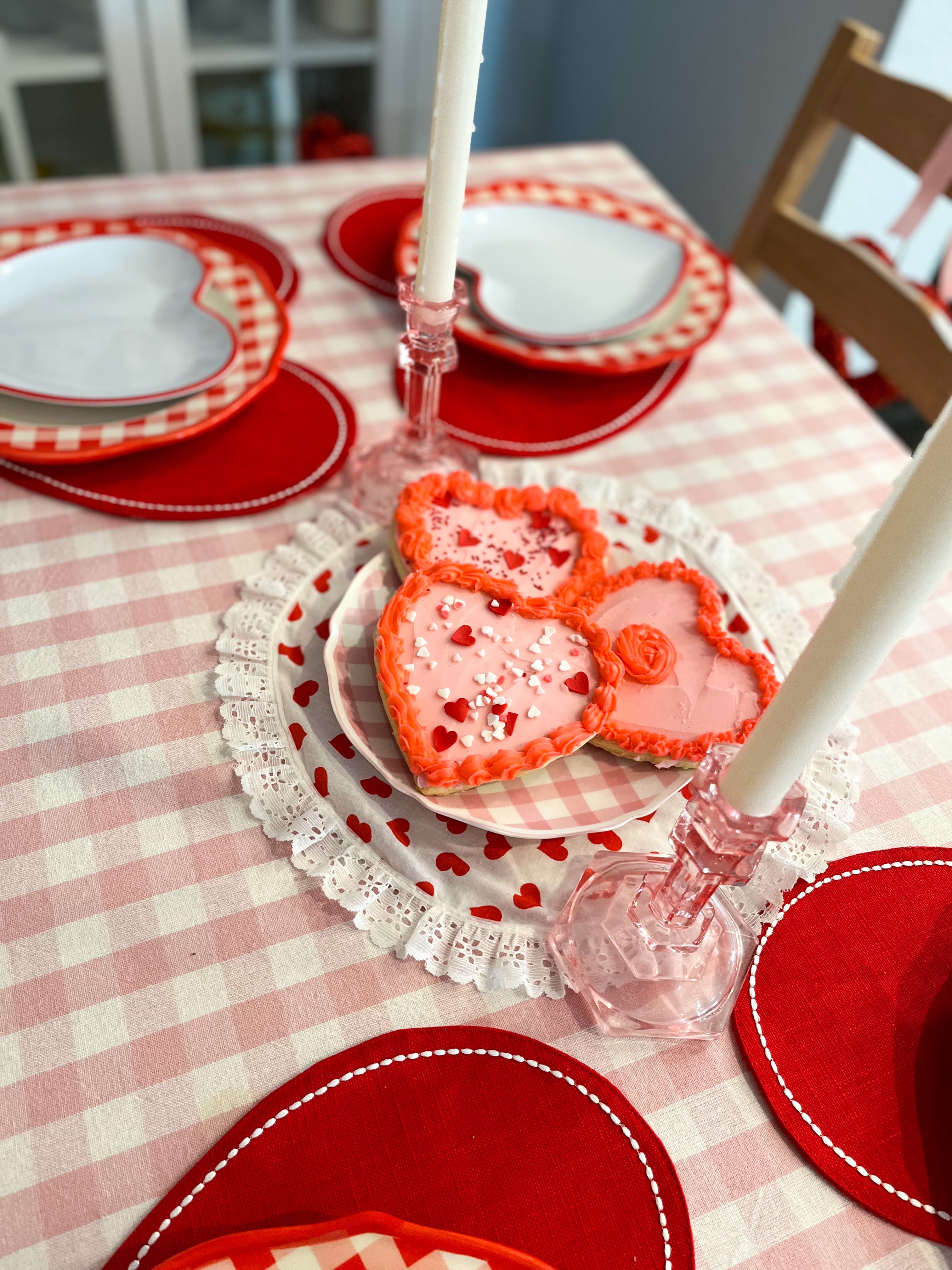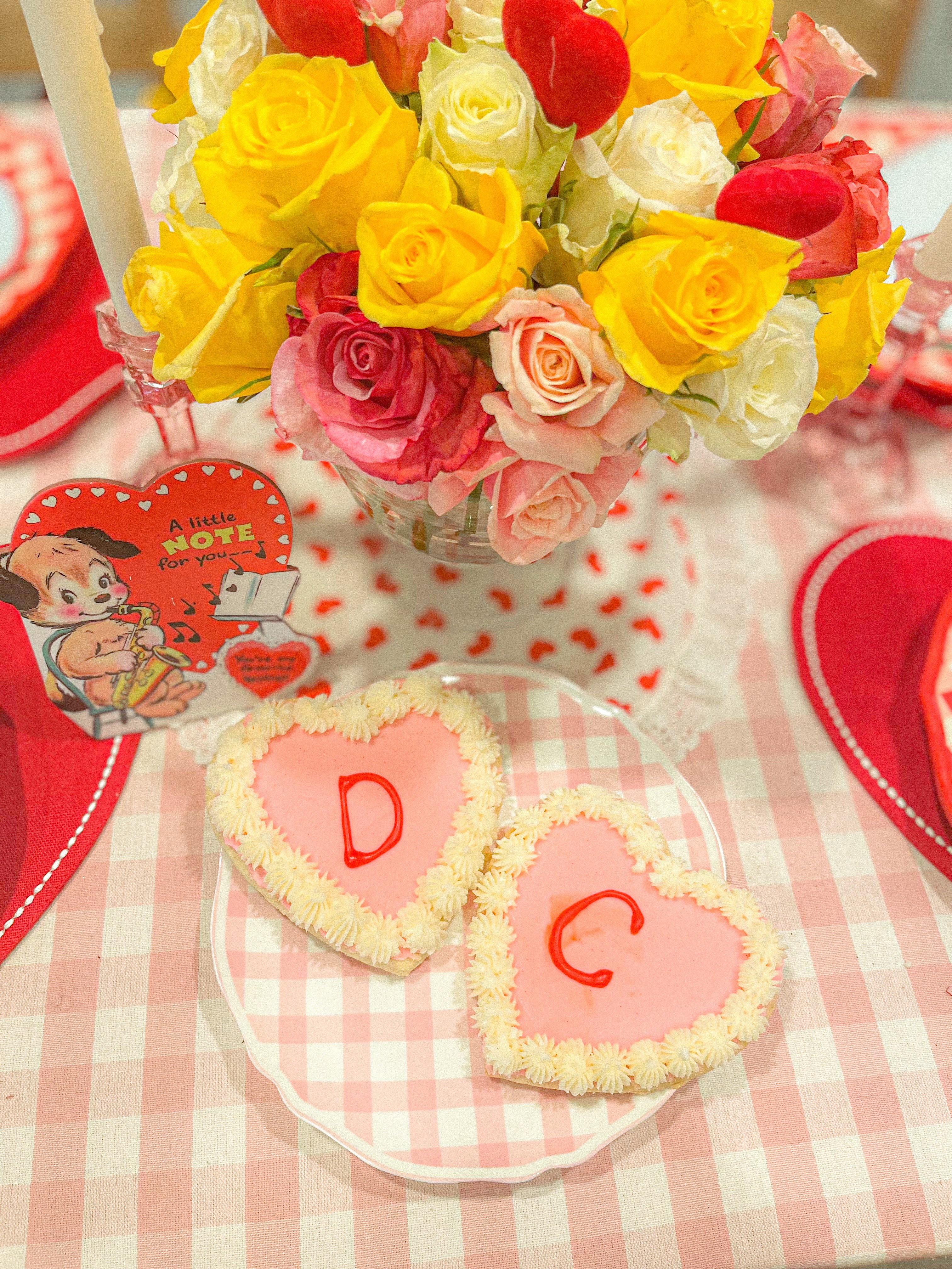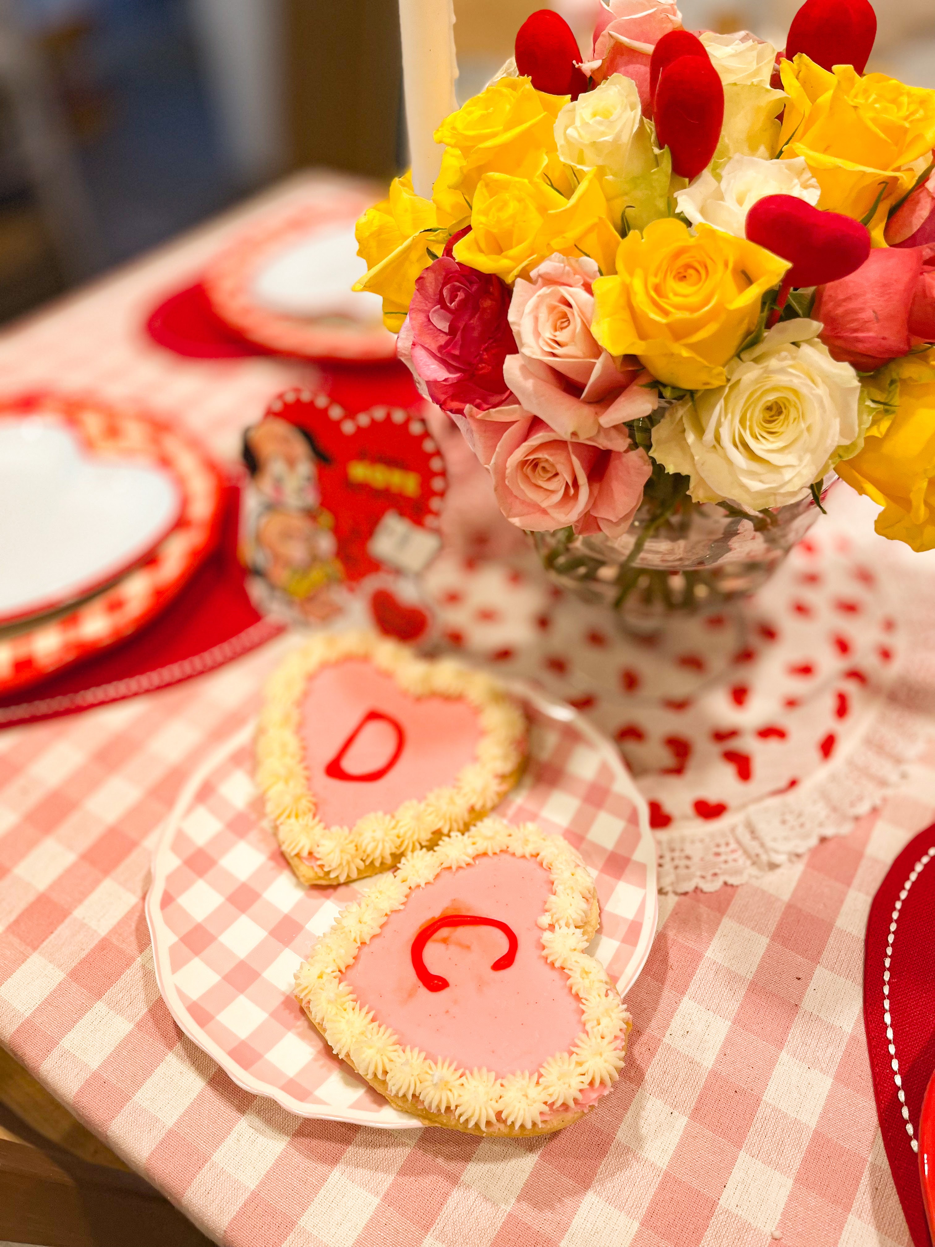 The fun thing about getting married with the possibility of babies (fingers crossed) in the future, is the conscious effort of creating traditions. Holidays and traditions are essentially synonymous, and one of the things I always wanted to make into my lil’ V-Day tradition with my own family is to bake giant heart shaped sugar cookies with pink and red frosting. I wanted to spell out everyone’s names in frosting and use it as a place card for a fancy schmancy V-day breakfast or for dinner.