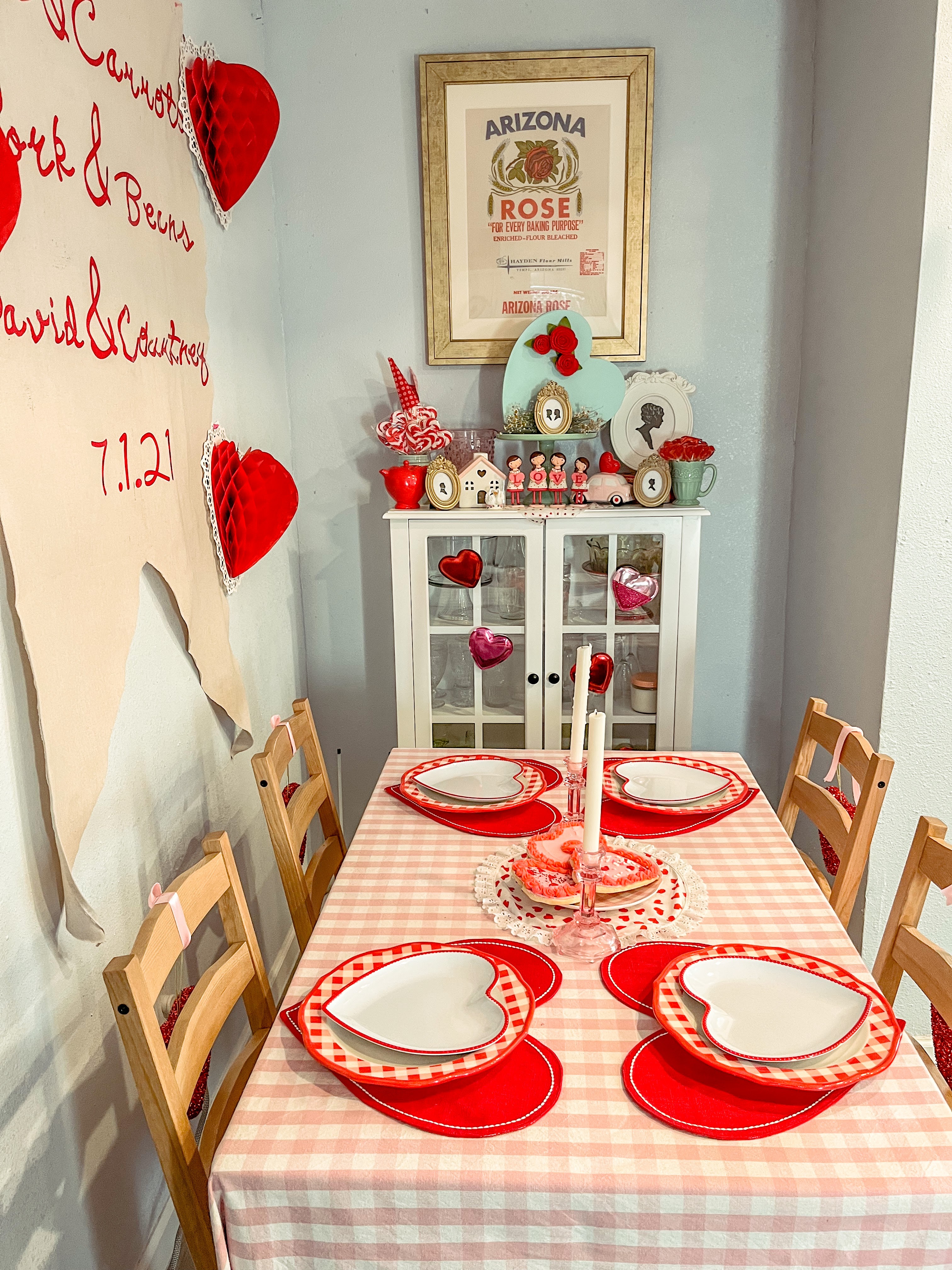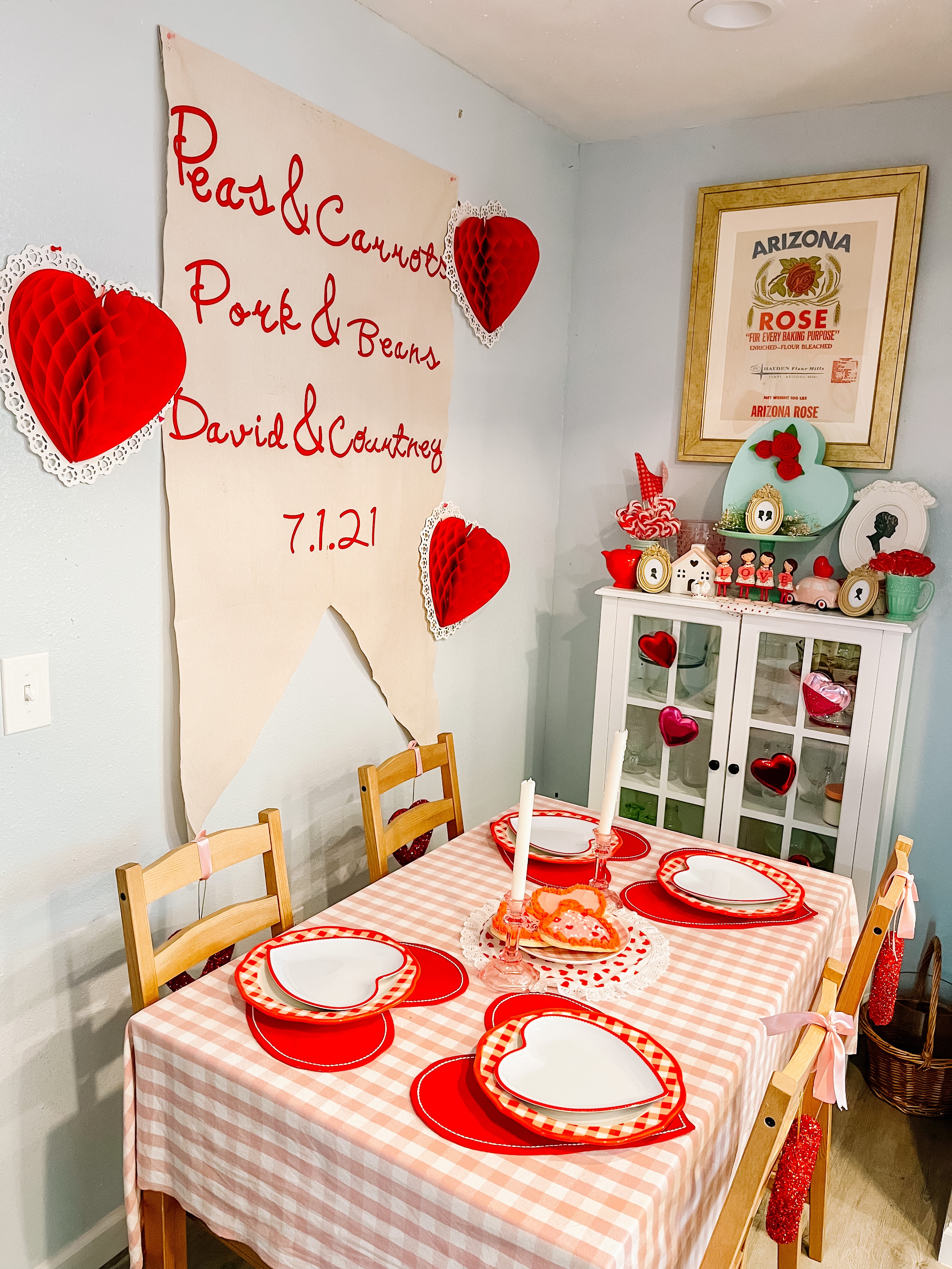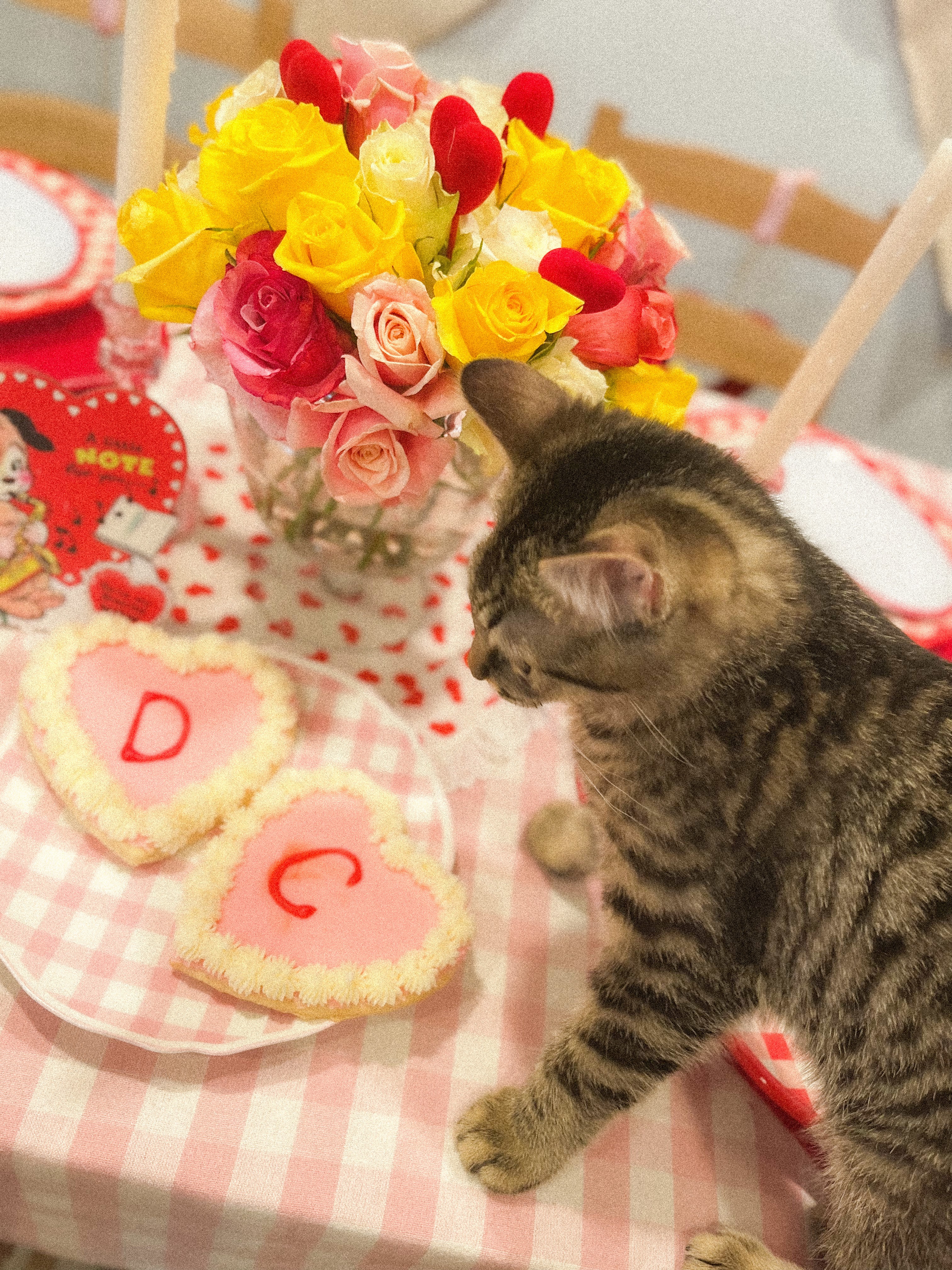 The fun thing about getting married with the possibility of babies (fingers crossed) in the future, is the conscious effort of creating traditions. Holidays and traditions are essentially synonymous, and one of the things I always wanted to make into my lil’ V-Day tradition with my own family is to bake giant heart shaped sugar cookies with pink and red frosting. I wanted to spell out everyone’s names in frosting and use it as a place card for a fancy schmancy V-day breakfast or for dinner.