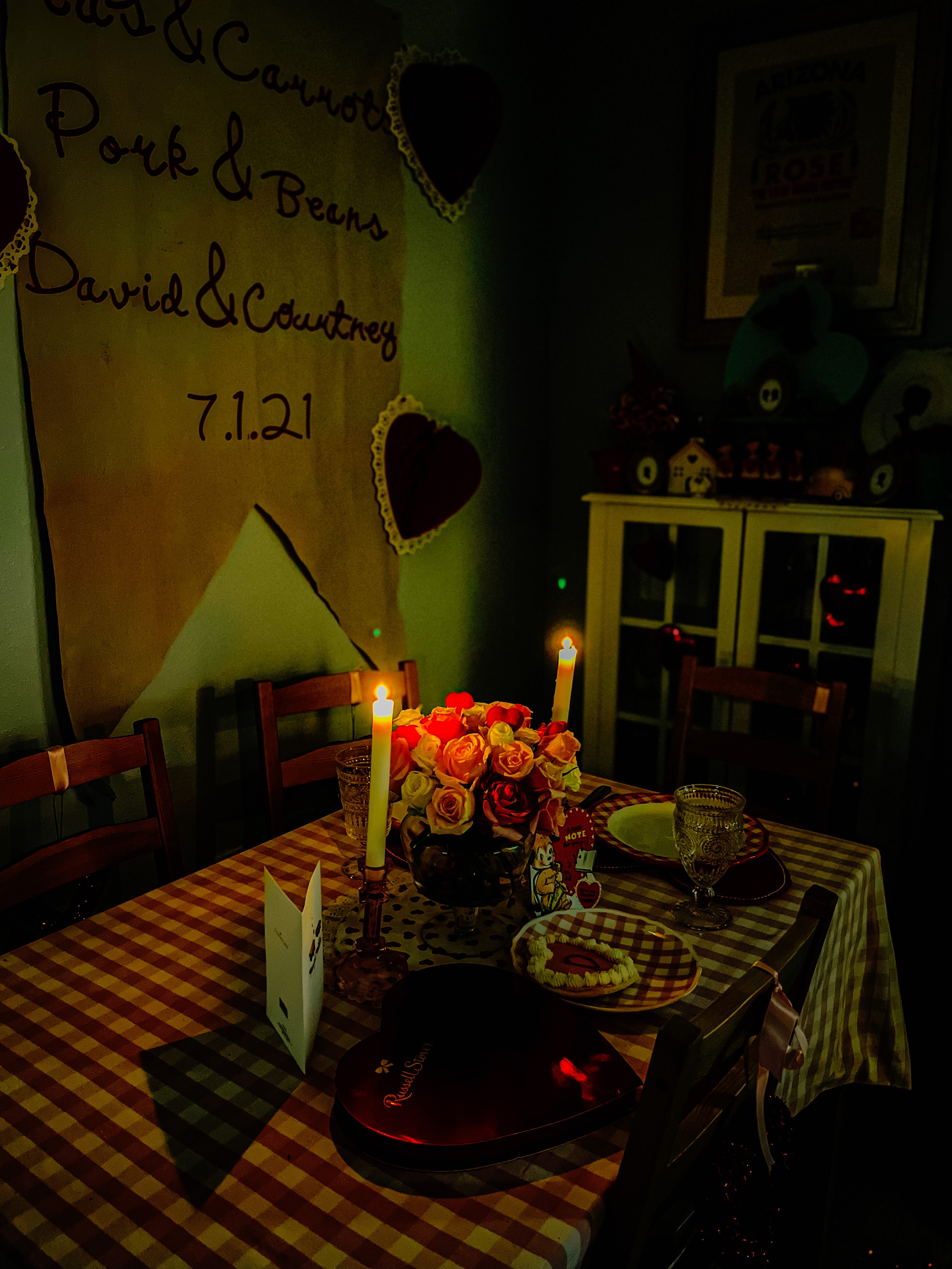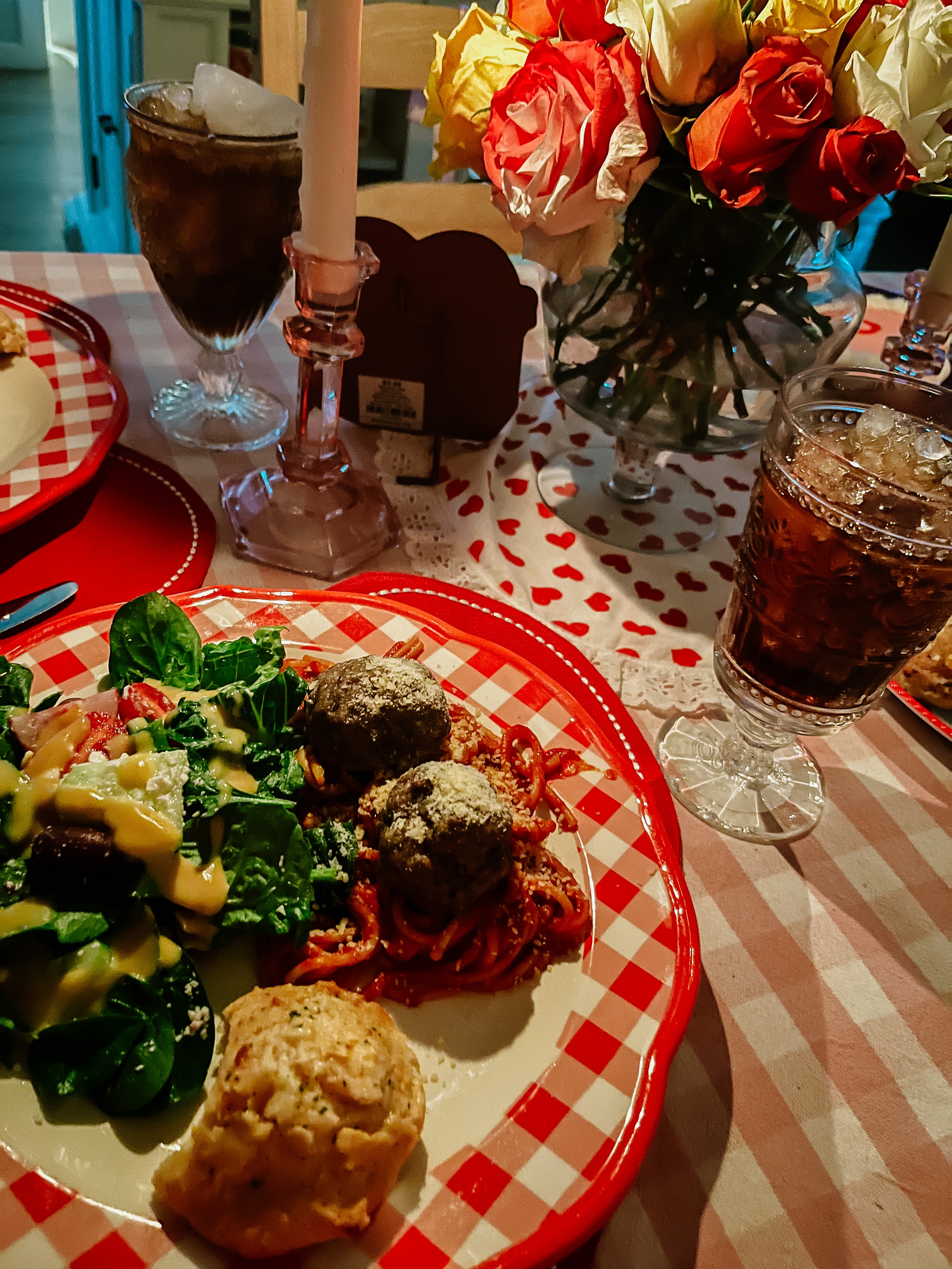 We had spaghetti and meatballs. So of course, not only did I force David to eat by candlelight where “he couldn’t see his food” I also forced him into a Lady and the Tramp picture op. Look closely at his face in the pics below. He was losing patience with his crazy ass wife LOL. But did crazy ass wife care?