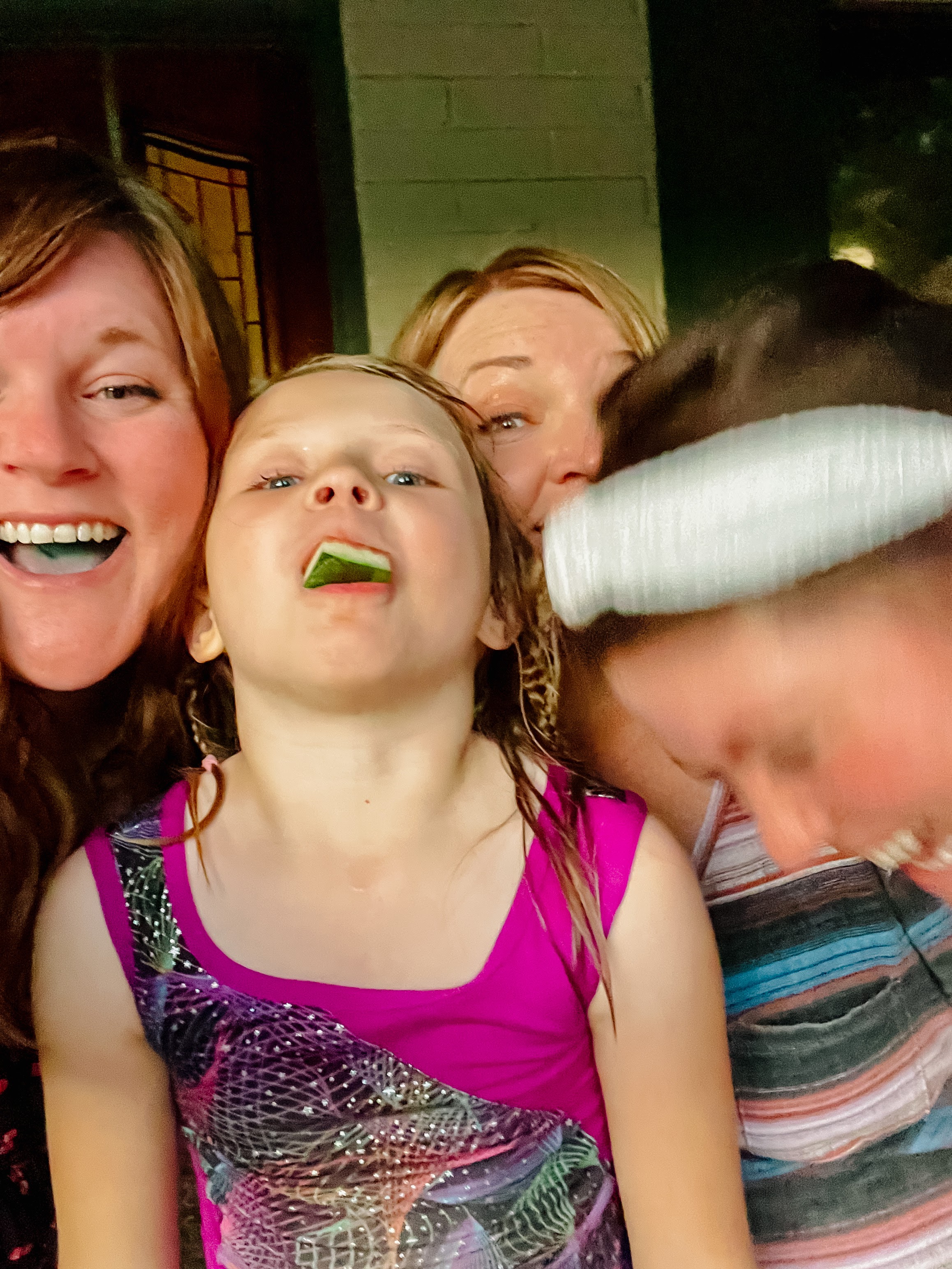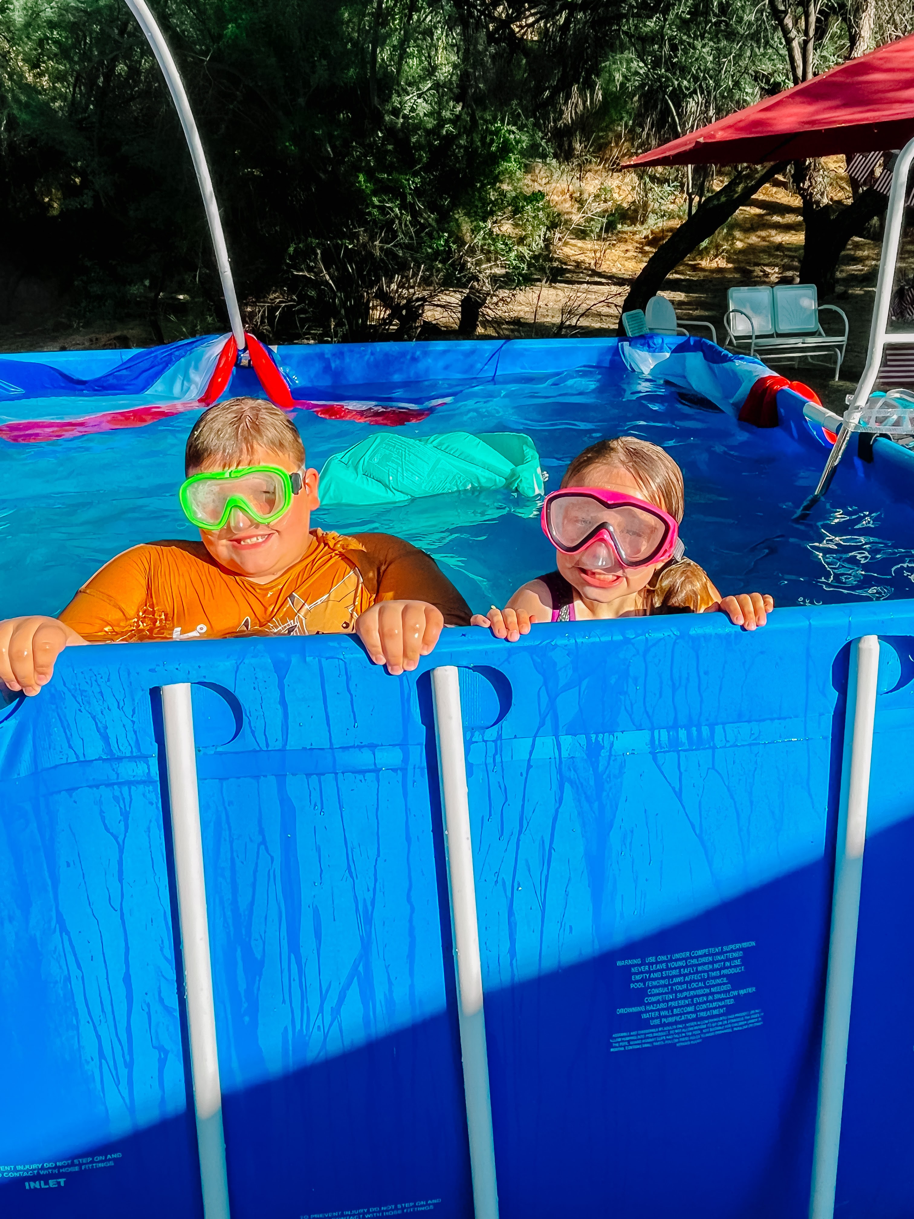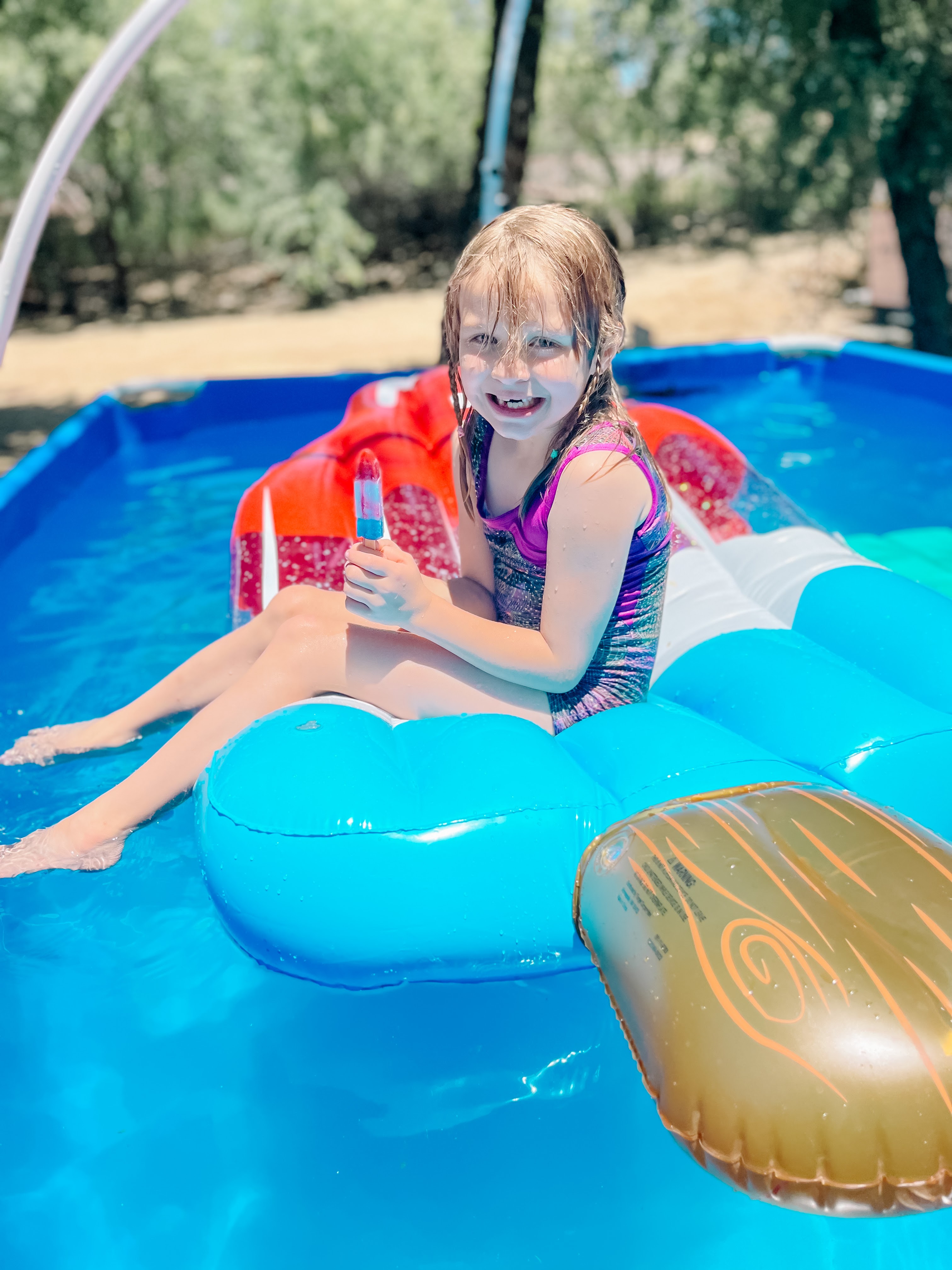 My sister had set up one of those stationary/exercise pools in my parent’s backyard. It quickly became the grandkid’s play pool LOL. So what the heck, I threw in a 4th of July bomb pop floatie and tried to decorate the pool with bunting LOL. Yeah. a bit of an epic Pinterest Fail but hey! STILL FREAKING FESTIVE.
