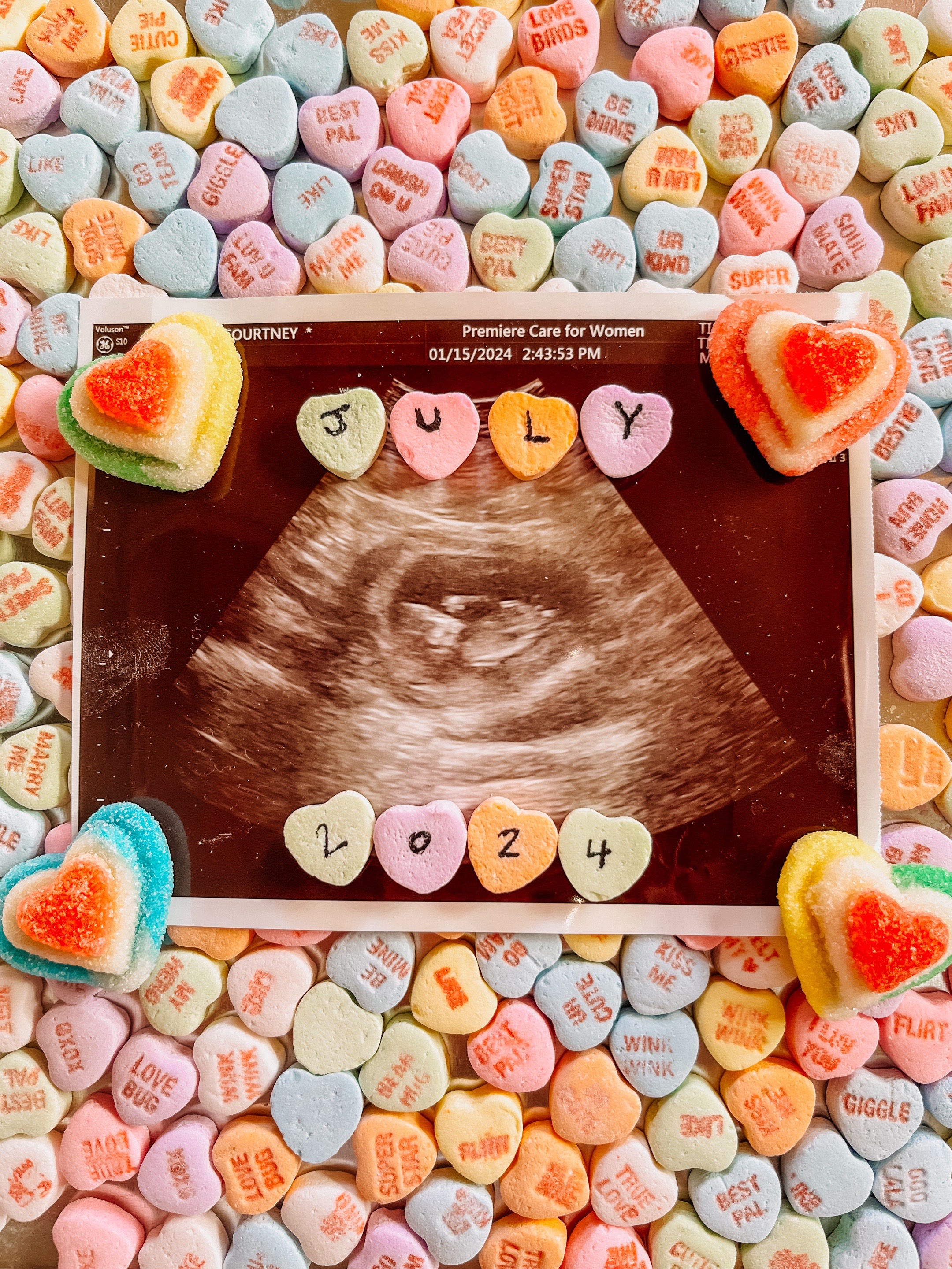 This was our “official” announcement on Instagram which we posted in February hence the Valentines Day theme with our first little ultrasound of our cute little guy.