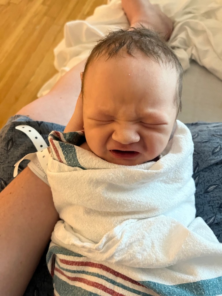 And then suddenly there he was, my little boy. David cut the cord, and then he was nestling on my chest. He had the cutest little cry, a head full of hair, ten fingers, ten toes.